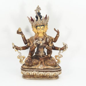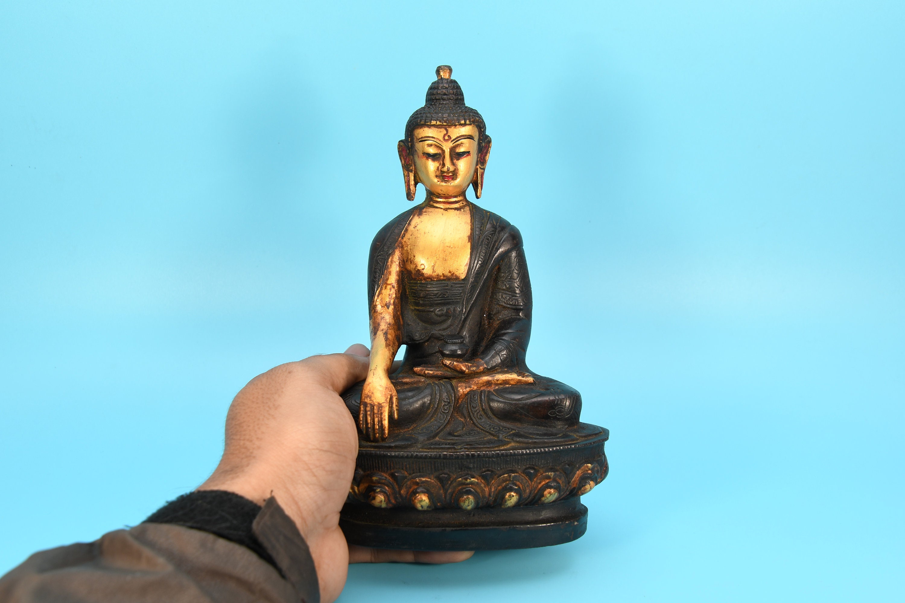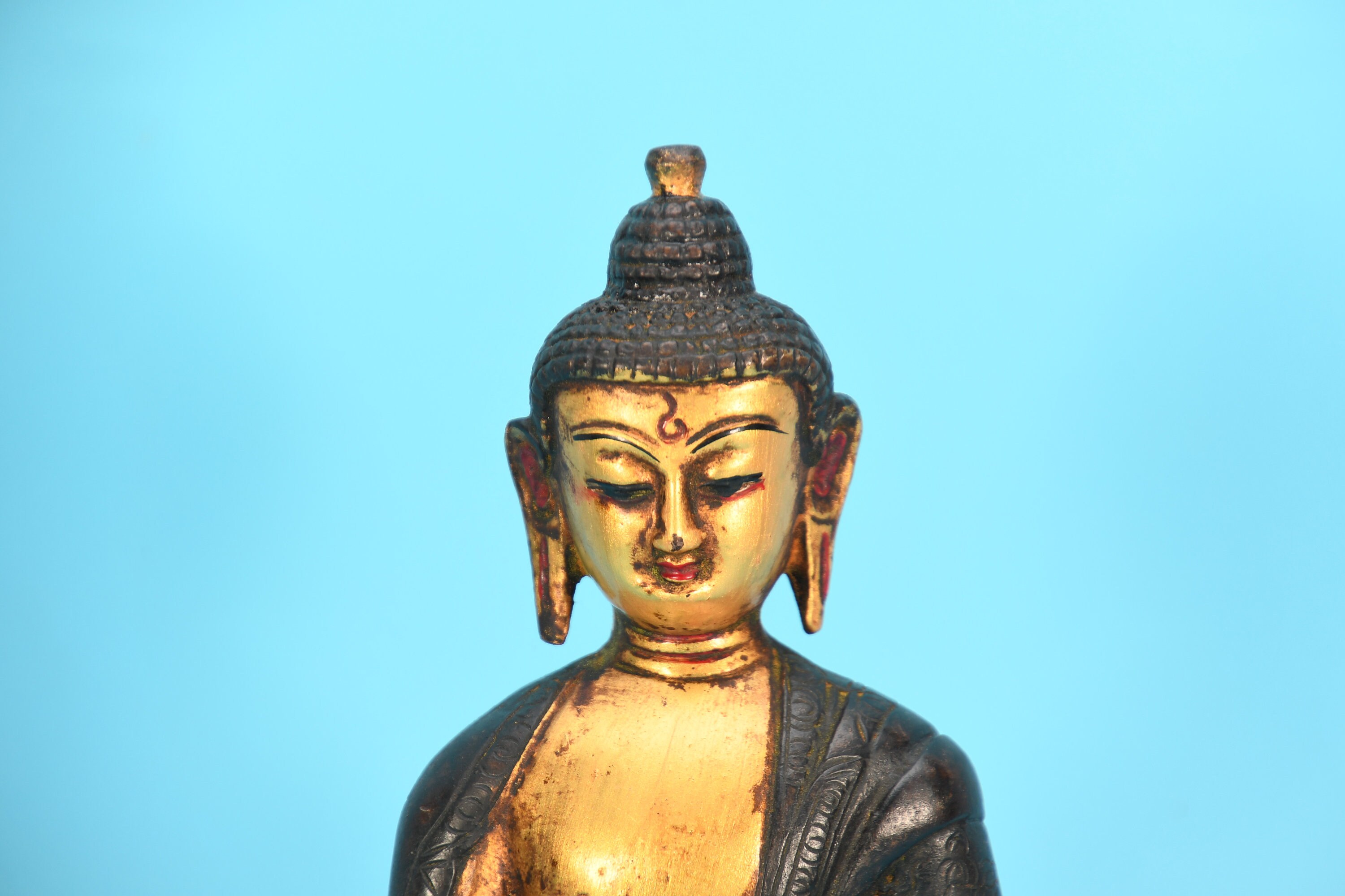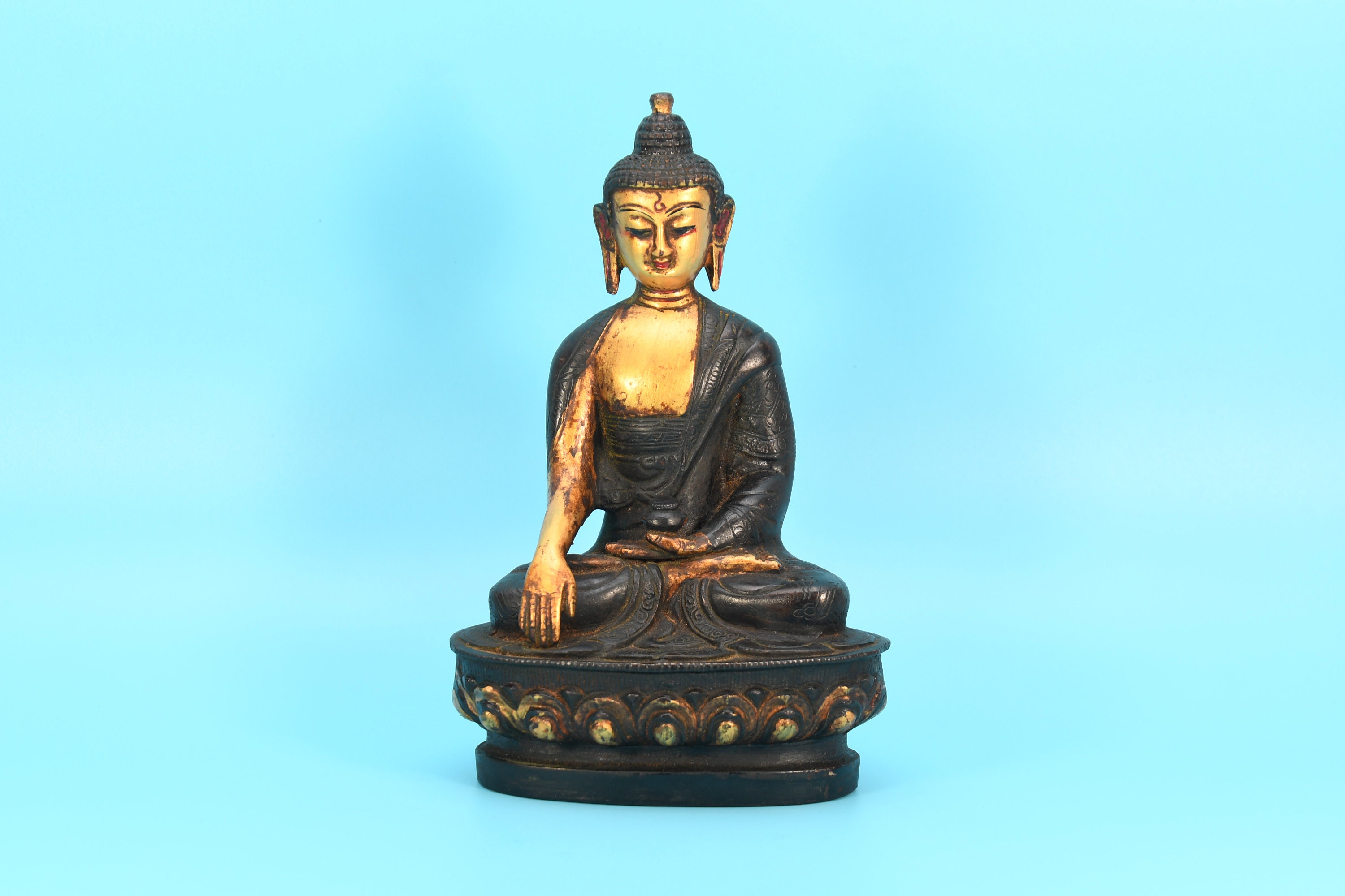 An absolutely astonishing one-of-a-kind Shakyamuni Buddha statue! We've never seen anything quite like it. Handmade in Nepal by a 4th and 5th generation crafting family, the statue is made of hand carved quartz crystal that is wrapped in bronze and then gold-plated. It is hand detailed and expertly carved by master craftsmen. This process takes considerable time and skill. The details are truly incredible, including pieces of hand inlaid antique coral and intricately etched designs.