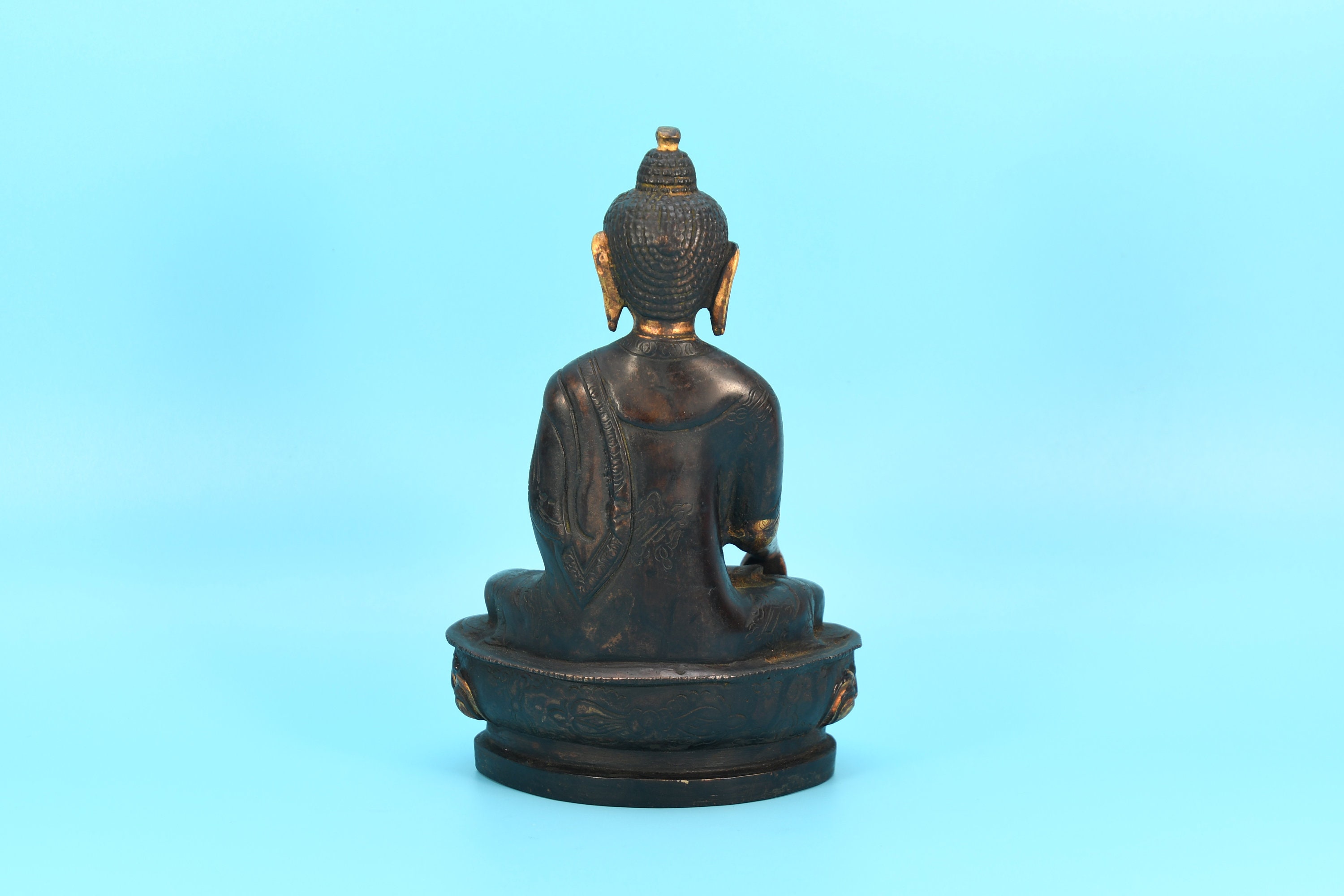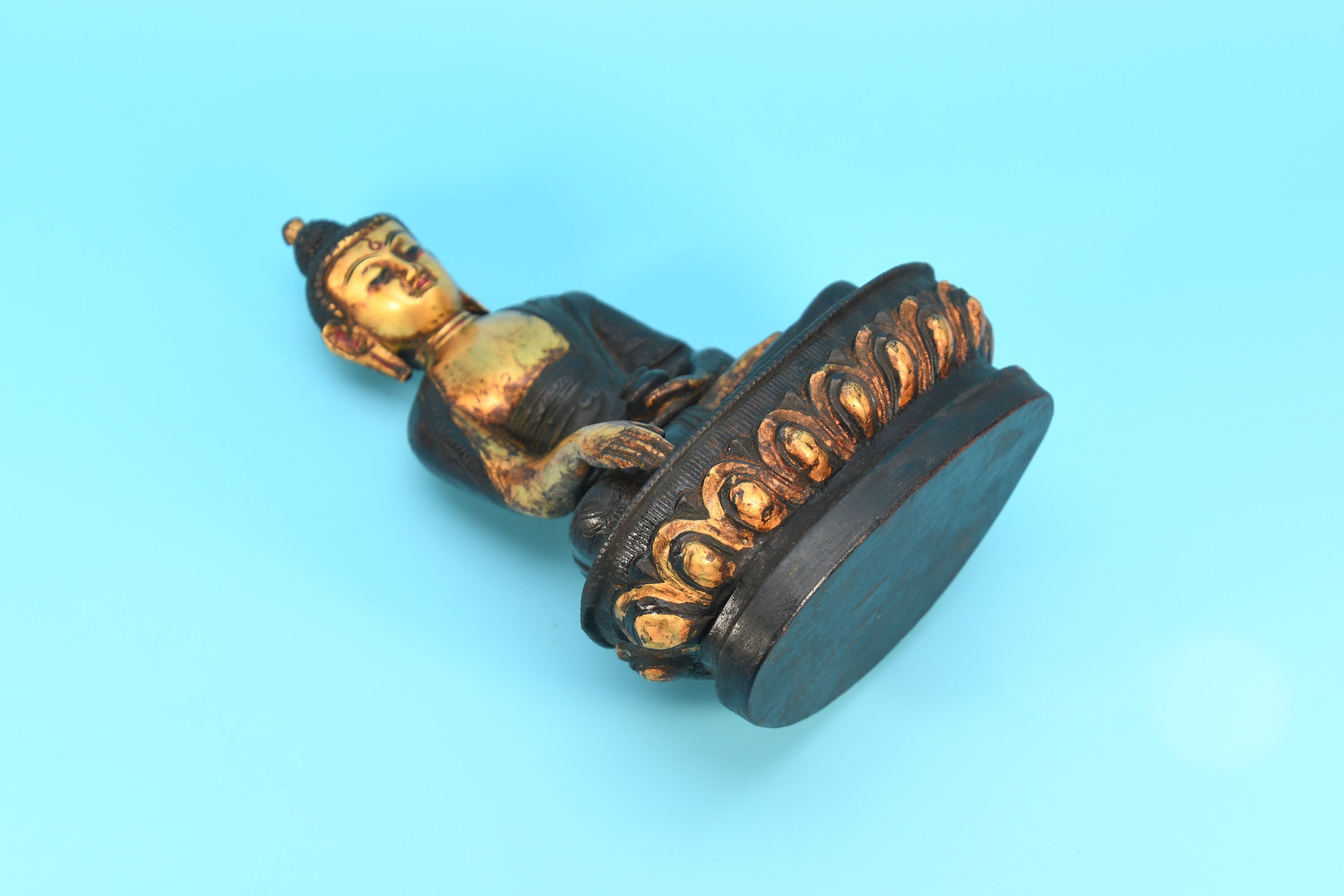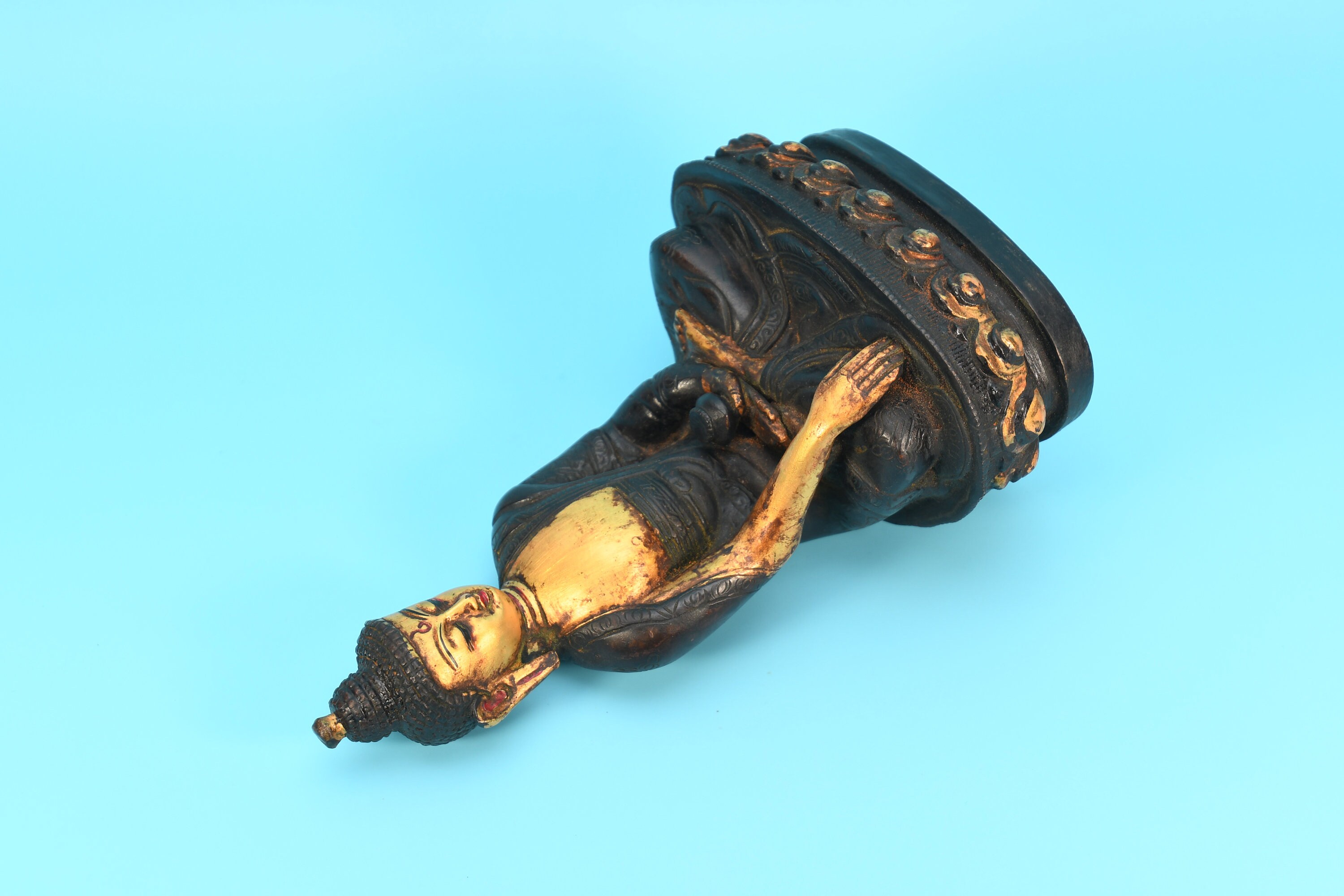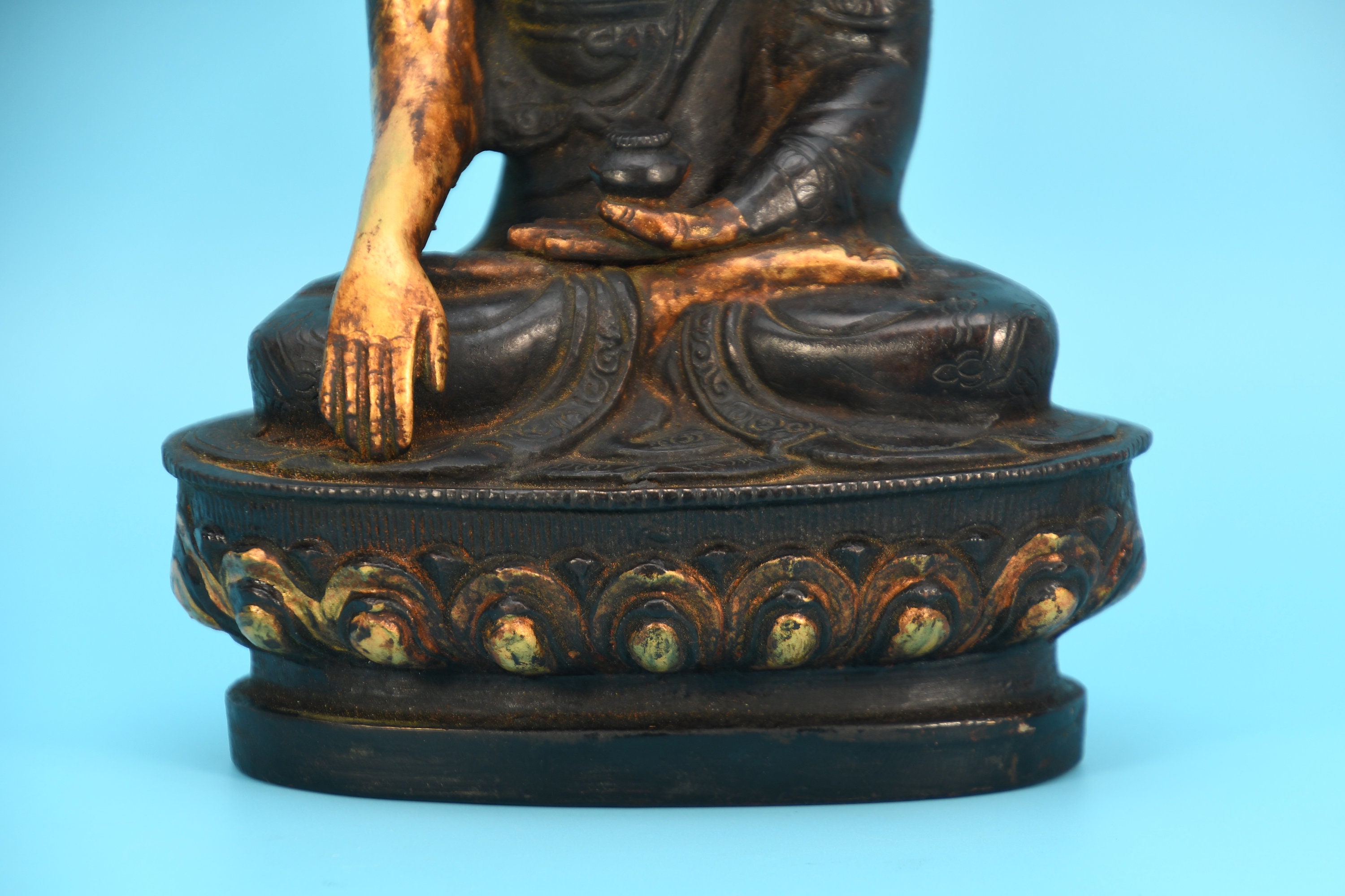 An absolutely astonishing one-of-a-kind Shakyamuni Buddha statue! We've never seen anything quite like it. Handmade in Nepal by a 4th and 5th generation crafting family, the statue is made of hand carved quartz crystal that is wrapped in bronze and then gold-plated. It is hand detailed and expertly carved by master craftsmen. This process takes considerable time and skill. The details are truly incredible, including pieces of hand inlaid antique coral and intricately etched designs.