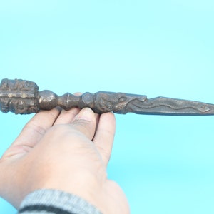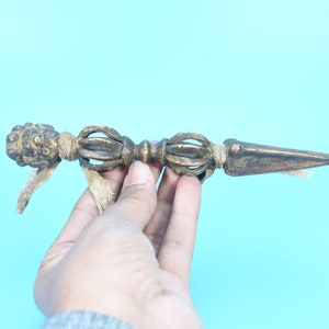 In Sanskrit, it is called the kilaya or the kila, and in Tibetan, it is called the phurba, phurpa. The phurba is also called 'the magic dagger'. 'Phur' is translated from the Sanskrit 'kila' and it means peg or nail. Padmasambhava is widely assumed to have invented the phurba. Padmasambhava used the phurpa to consecrate the ground when he established the Samye monastery in the 8th century. The phurba is a three-sided stake that is used in Buddhist rituals. Because Tibet has always been a nomadic culture, the tent is an important part of Tibetan lives, and placing the tent pegs into the ground is always seen as sacrificing the ground.