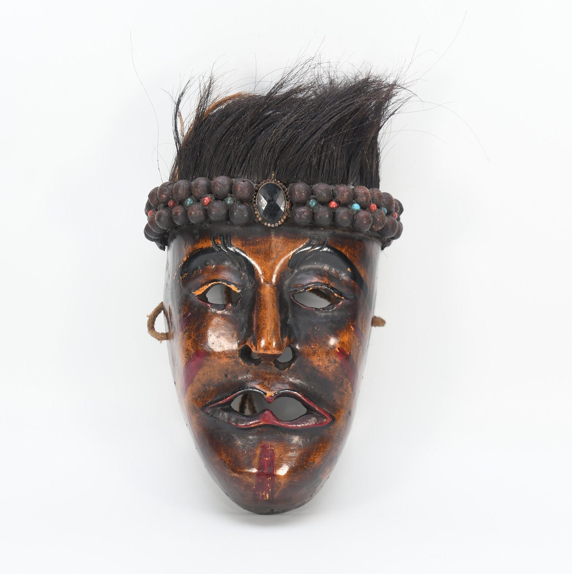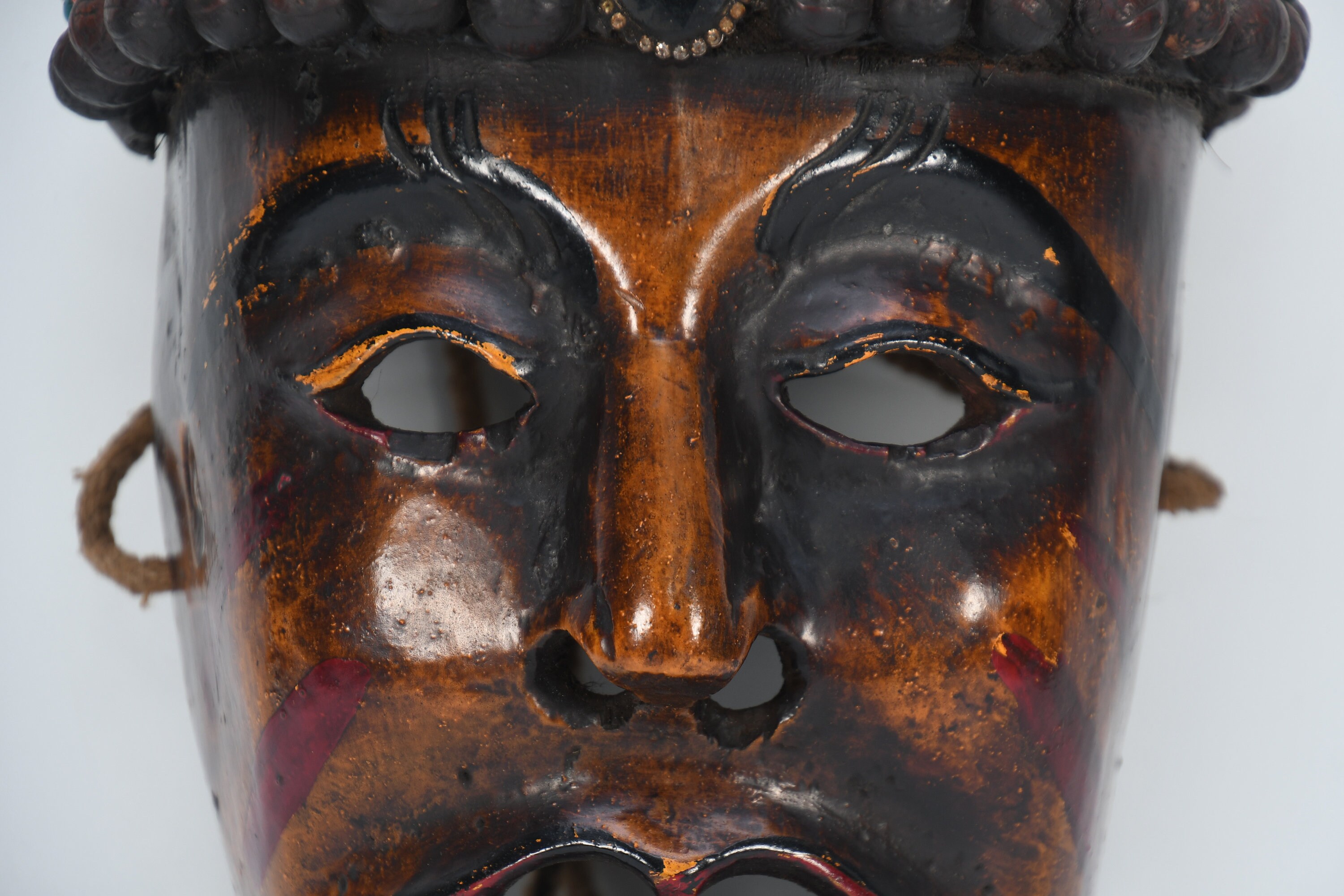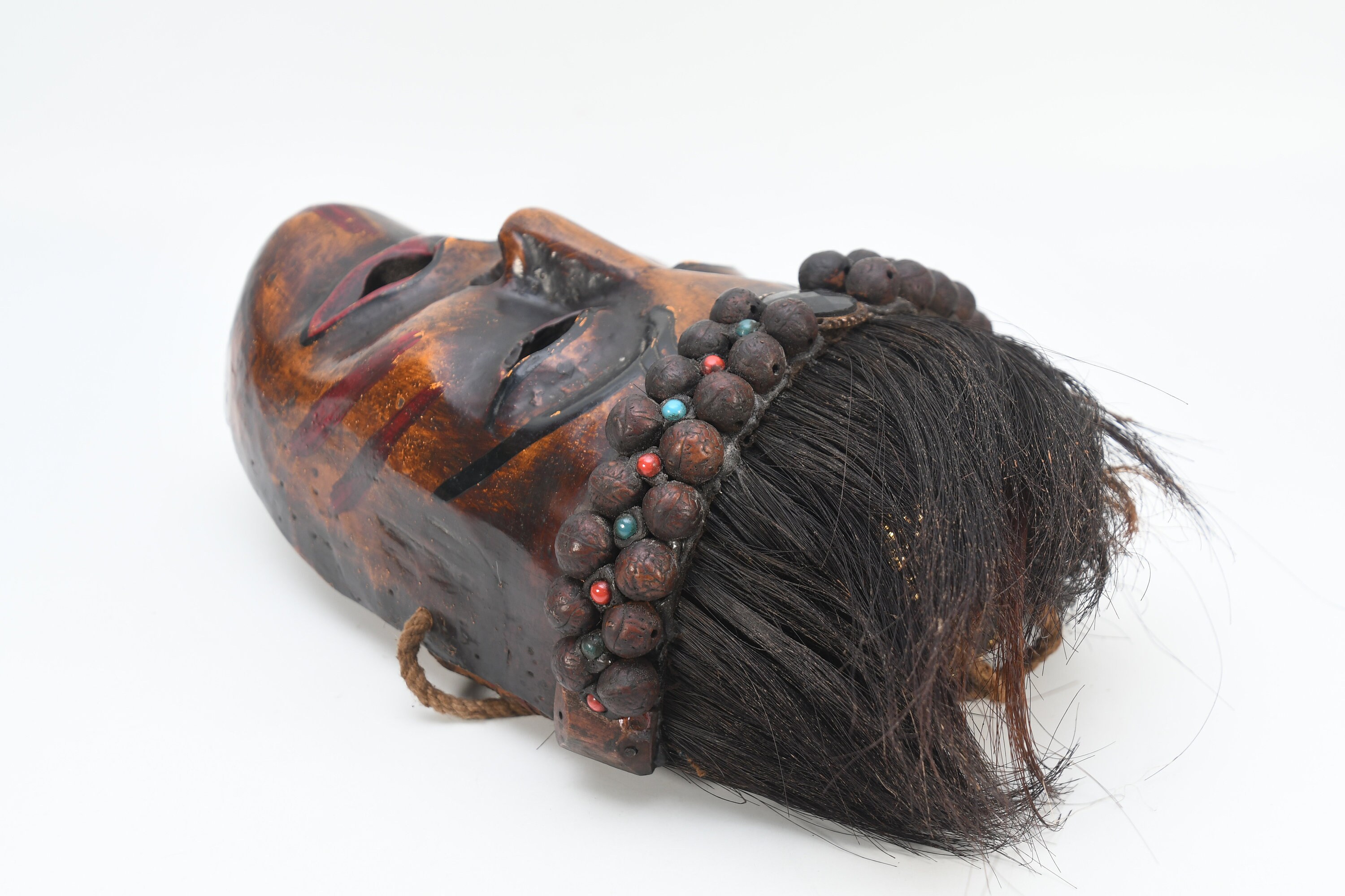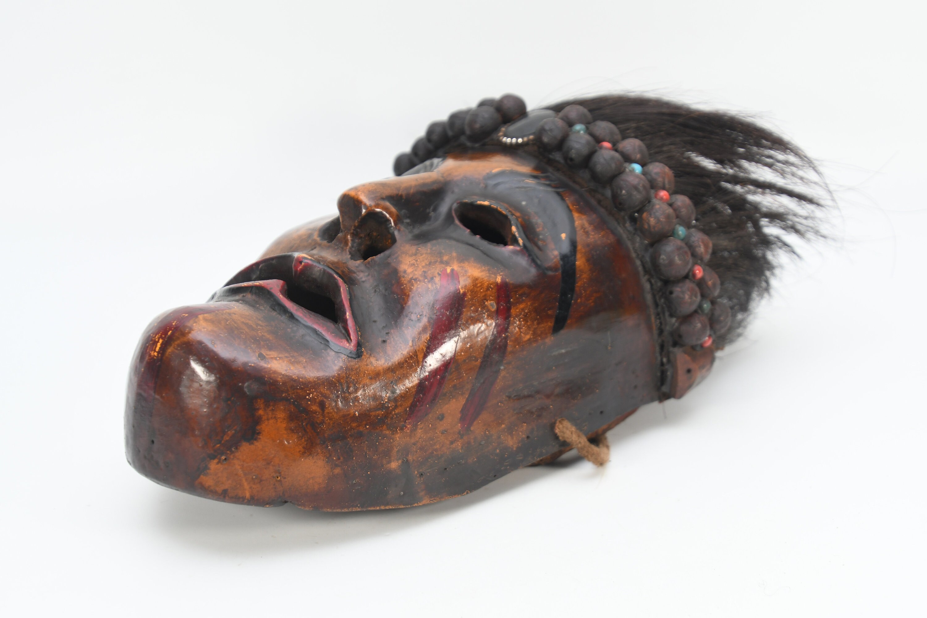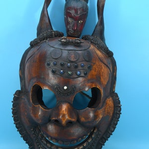 In the valleys and foothills on the southern slopes of the Himalayas, within the region of the so-called ‘Middle Hills’ in Nepal, there are tribes where belief in ancient ‘pre-Buddhist’ shamanism is still prevalent to this day. These tribes, such as the Tamang, Magar, Gurung, Rai, and others, which are native to the northern and western part of the central Kathmandu valley, have a long-standing mask tradition. These masks are among the most primitive in use in the world and are made by carving wood, coating it with yak butterfat, and charring it over a smoky fire. Their shamans and special dancers perform at ceremonies, theatrical performances, and dances wearing masks and costumes. Their masks appear simpler, seemingly more ‘primitive’ than the large, colorful masks used for the Buddhist-Lamaist ‘cham dances’ in the Buddhist monasteries and temples of Nepal. These masks of the Shamanist tribes are smaller, yet alluring in their straightforward simplicity and are called ‘Middle-Hills-masks’.