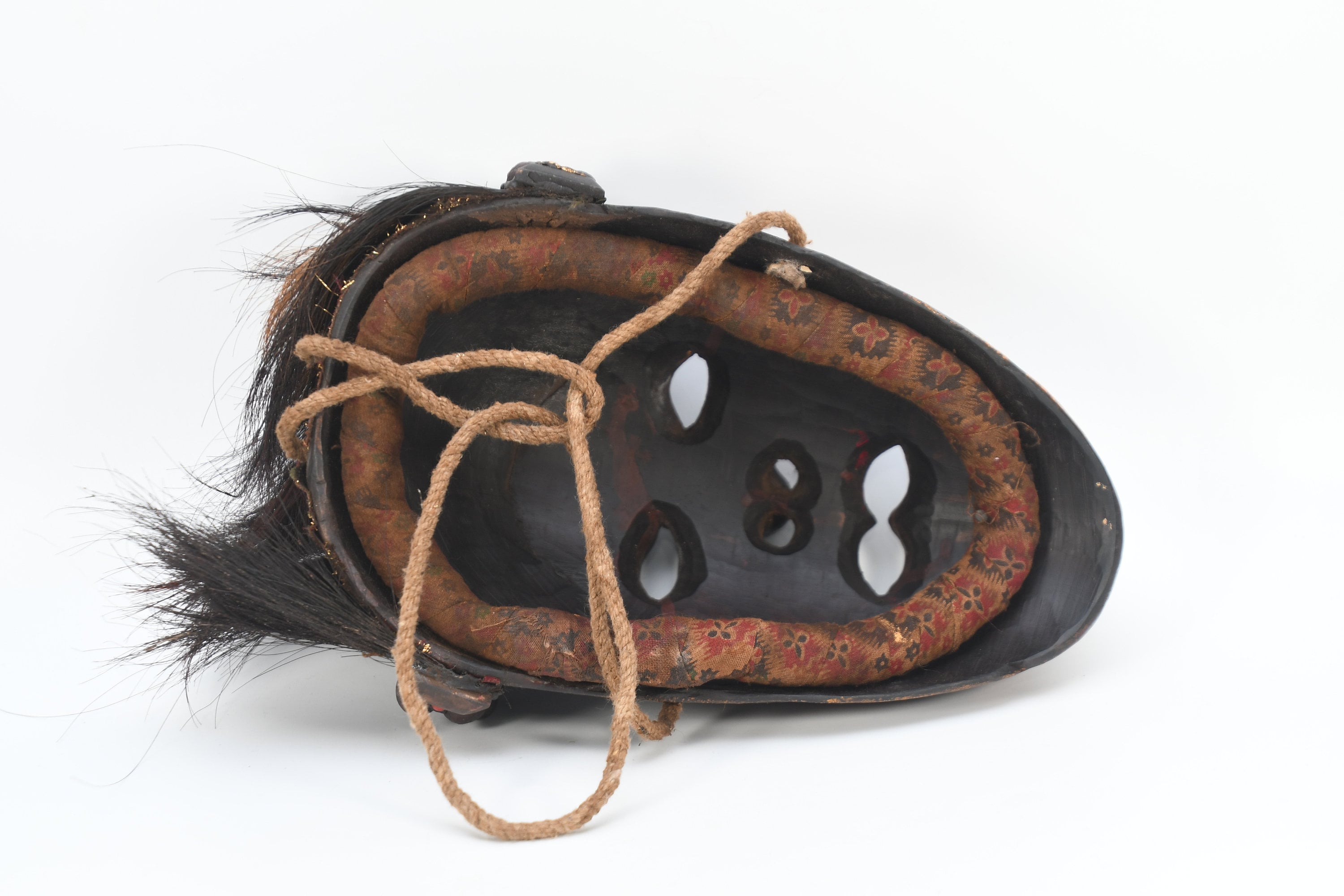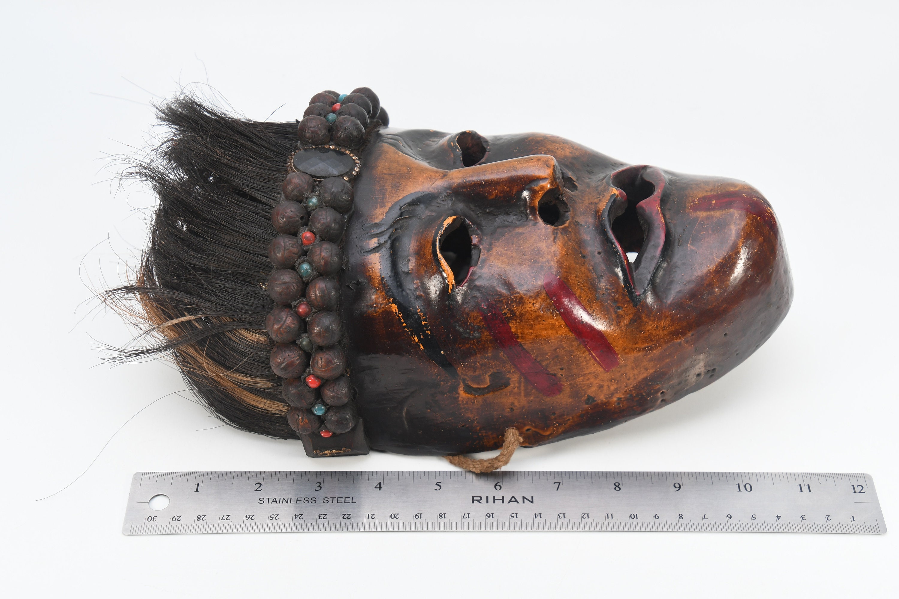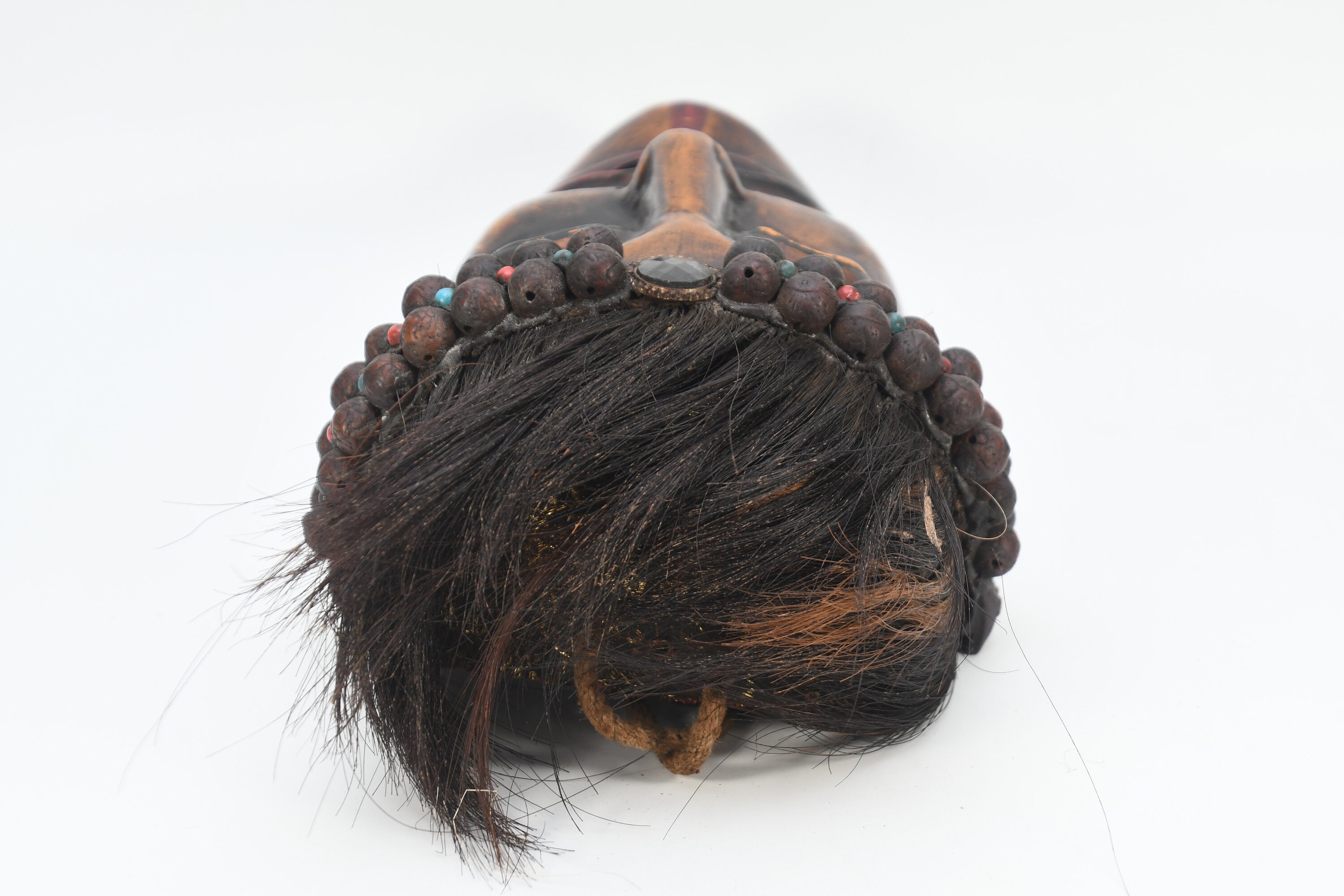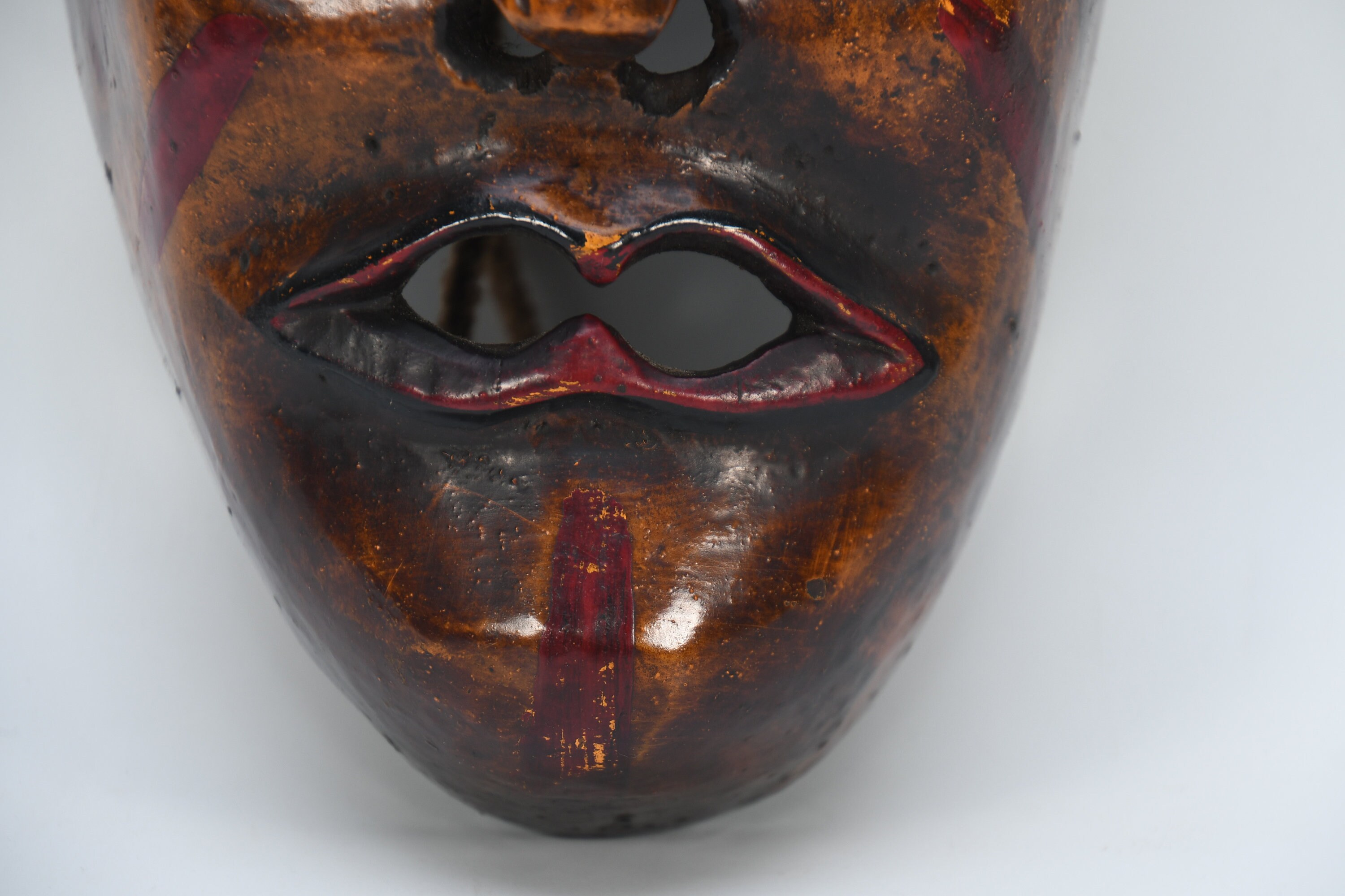 In the valleys and foothills on the southern slopes of the Himalayas, within the region of the so-called ‘Middle Hills’ in Nepal, there are tribes where belief in ancient ‘pre-Buddhist’ shamanism is still prevalent to this day. These tribes, such as the Tamang, Magar, Gurung, Rai, and others, which are native to the northern and western part of the central Kathmandu valley, have a long-standing mask tradition. These masks are among the most primitive in use in the world and are made by carving wood, coating it with yak butterfat, and charring it over a smoky fire. Their shamans and special dancers perform at ceremonies, theatrical performances, and dances wearing masks and costumes. Their masks appear simpler, seemingly more ‘primitive’ than the large, colorful masks used for the Buddhist-Lamaist ‘cham dances’ in the Buddhist monasteries and temples of Nepal. These masks of the Shamanist tribes are smaller, yet alluring in their straightforward simplicity and are called ‘Middle-Hills-masks’.