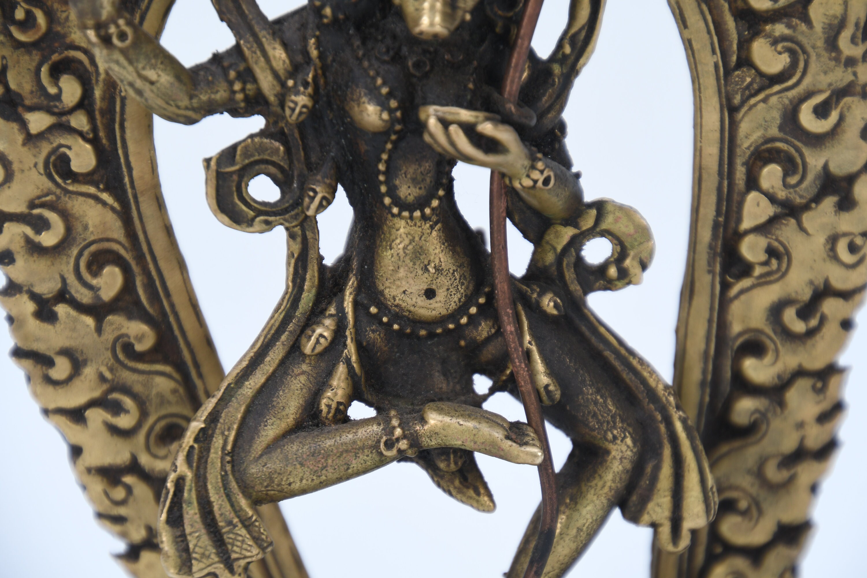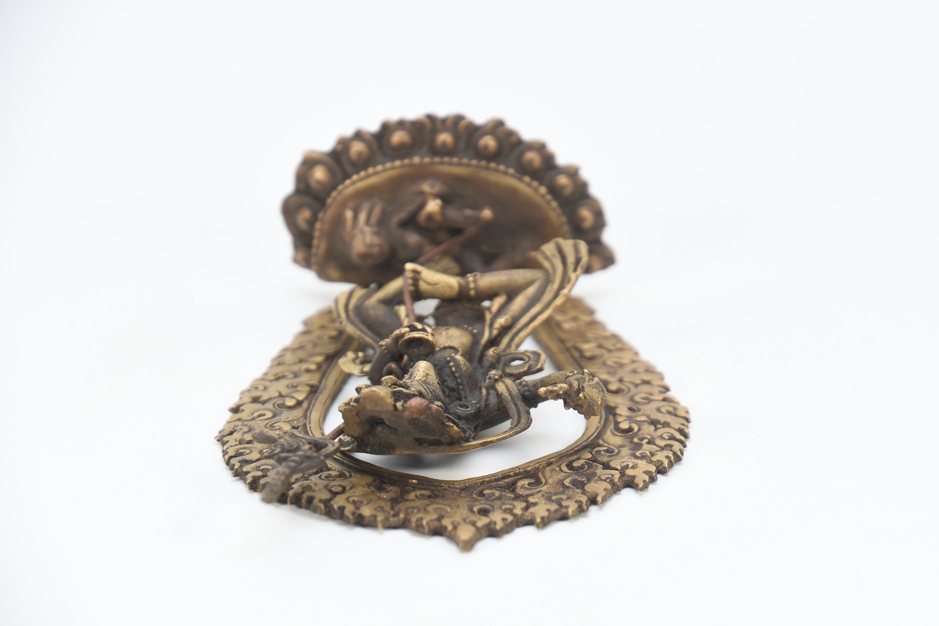 Simhamukhi, Dakini (in Tibetan: Seng Ge Dong Chen Kha Dro Ma and in English: Lion Faced Dakini). With a body black in colour, the face is that of a white lion, with three round yellow eyes, blazing fiercely with a gaping mouth, a yellow beard, eyebrows and hair flowing upward. The right-hand holds upraised a curved knife which is called Kartika to the sky, left hand holds a skull cup of blood to the heart, carrying a Khatvanga staff tipped with a trident in the bend of the elbow supported against the shoulder. Adorned with a tiara of five skulls, red scarf, elephant skin, bone ornaments, a long snake and fifty freshly severed heads as a necklace, she wears a tiger skin skirt. Standing on the left leg with the right drawn up, trampling on a double triangle symbol, corpse, sun and multi-coloured lotus seat, Simhamukha in a mood of great fierceness dwells in the middle of a blazing fire of pristine awareness.