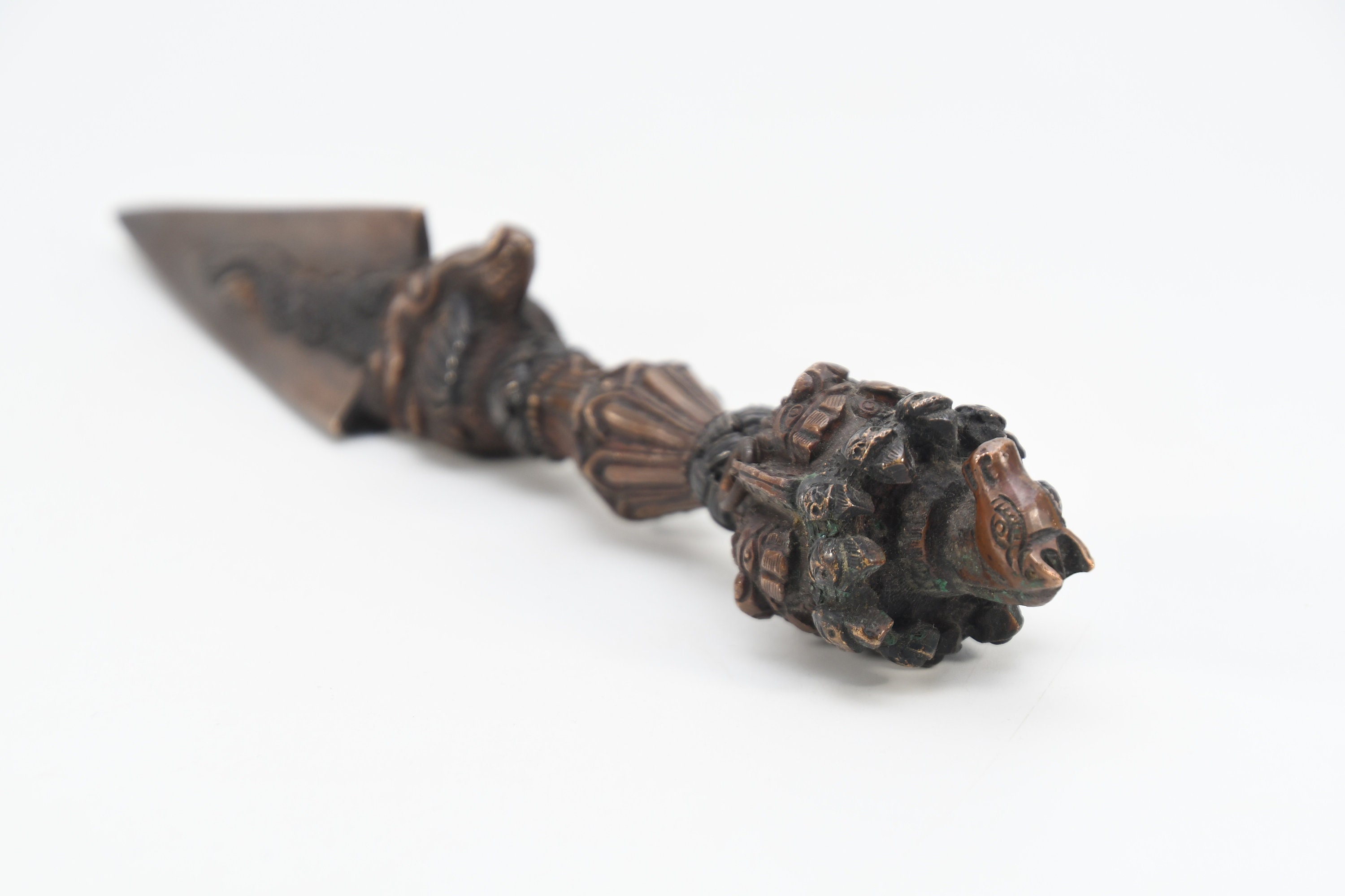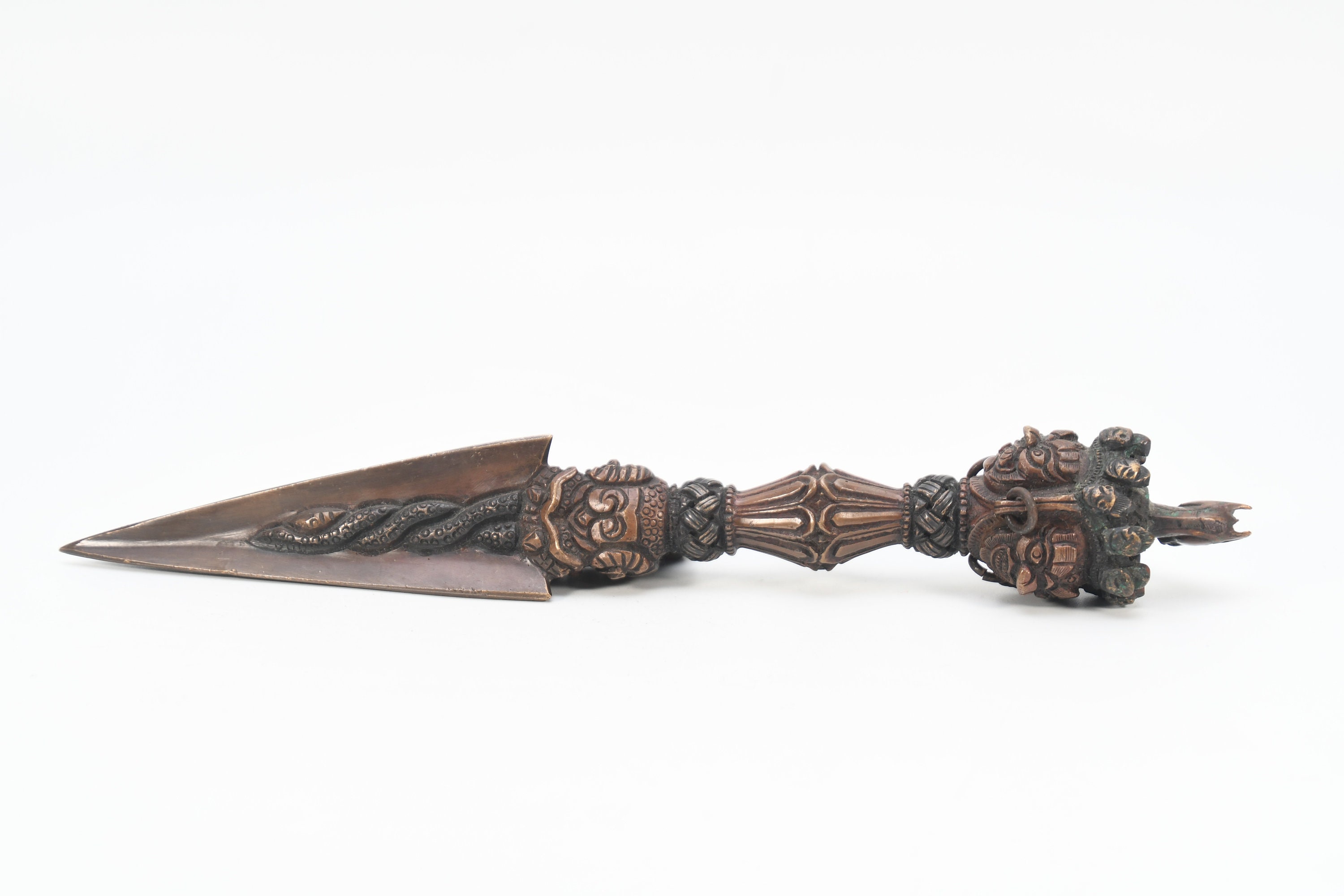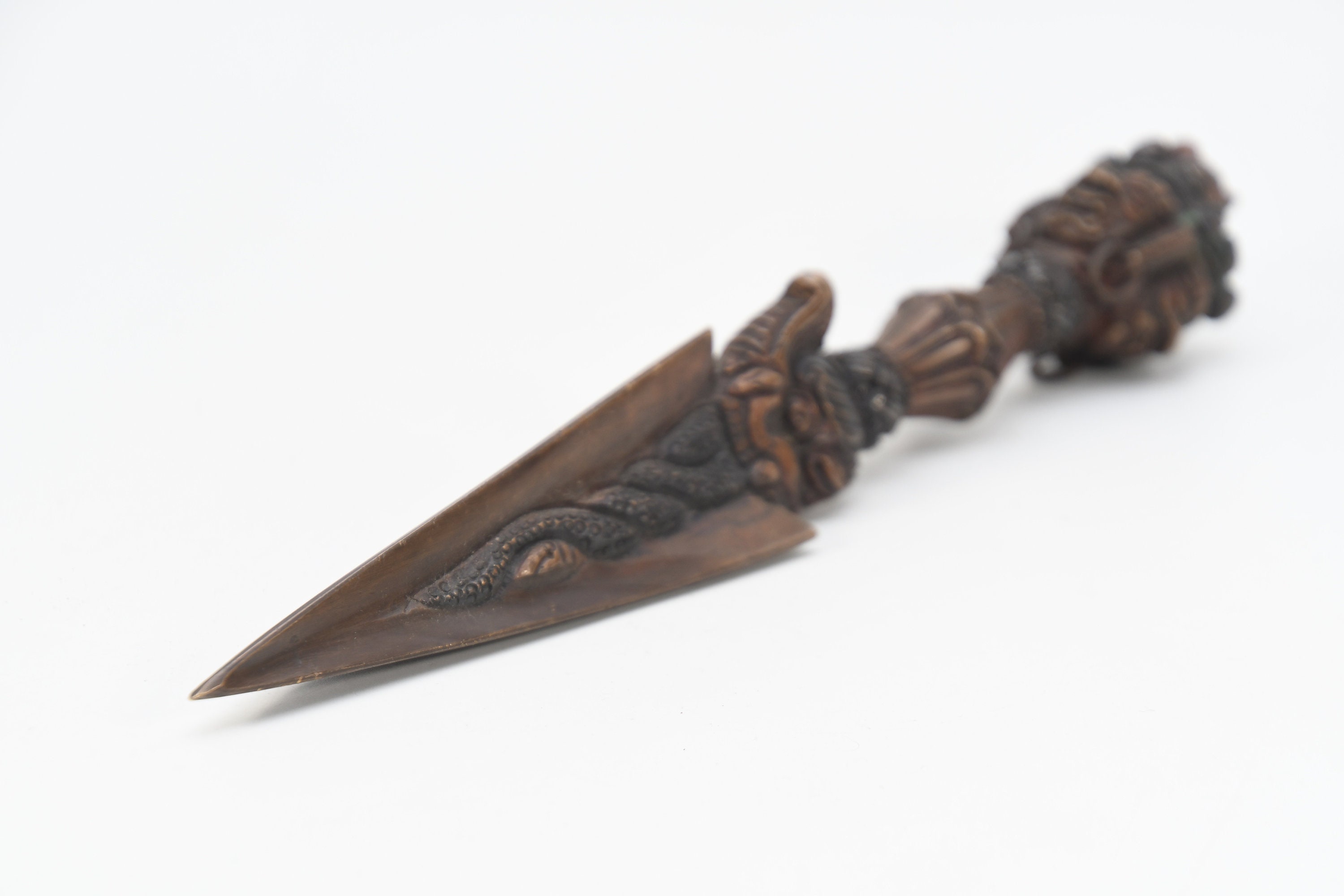 The phurba is also called 'the magic dagger'. 'Phur' is translated from the Sanskrit 'kila' which means peg or nail. The phurba is a three-sided stake that is used in Buddhist rituals.