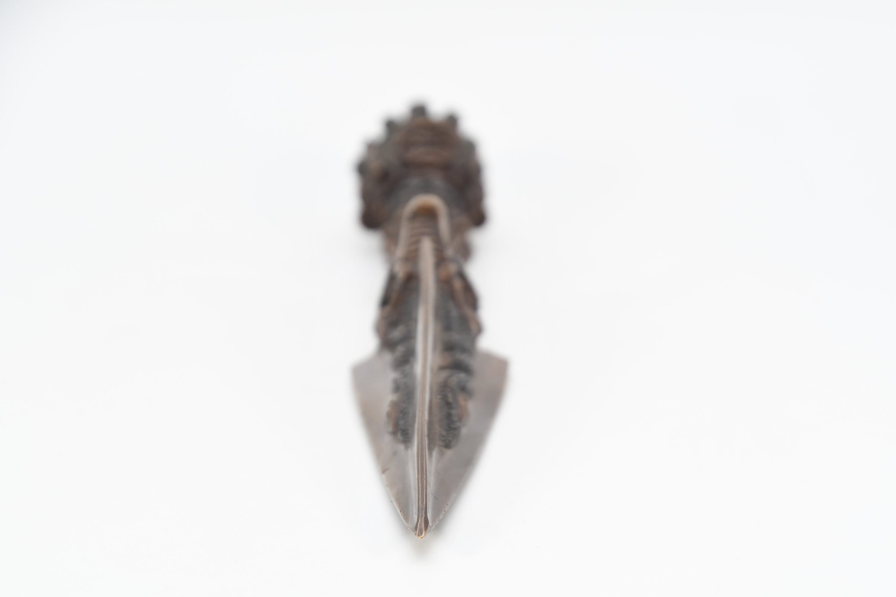 The three-sided style of the phurba comes from an ancient vedic tool. It has three segments on its blade, each representing the power of the phurba to transform negative energies. These energies are known as the 'three poisons,' and are attachment, ignorance, and aversion. The three sides of the phurba also represent the three spirit worlds, and the phurba itself represents the axis of the three spirit worlds. The handle of the phurba represents 'wisdom', while the blade represents 'method'.