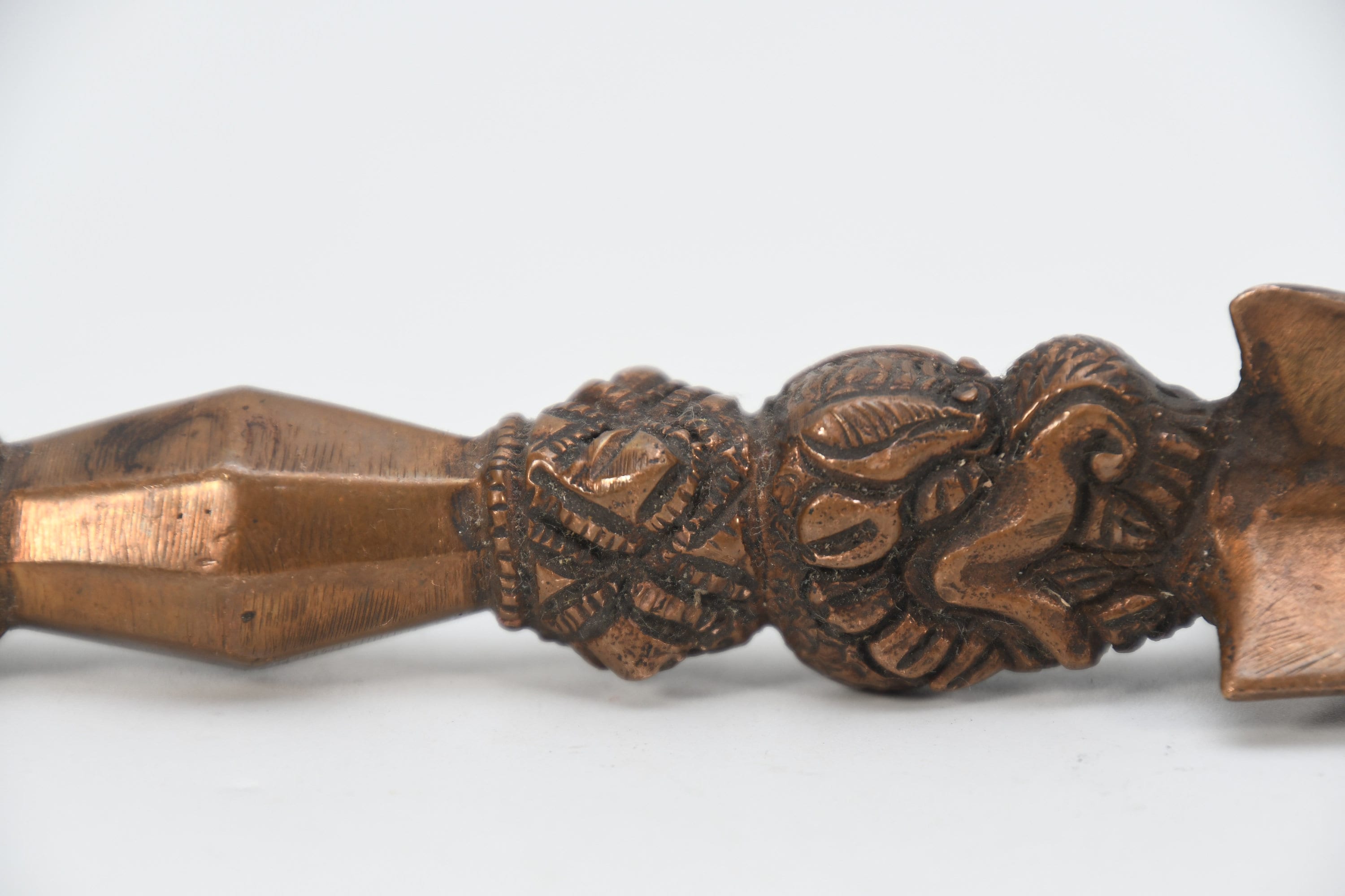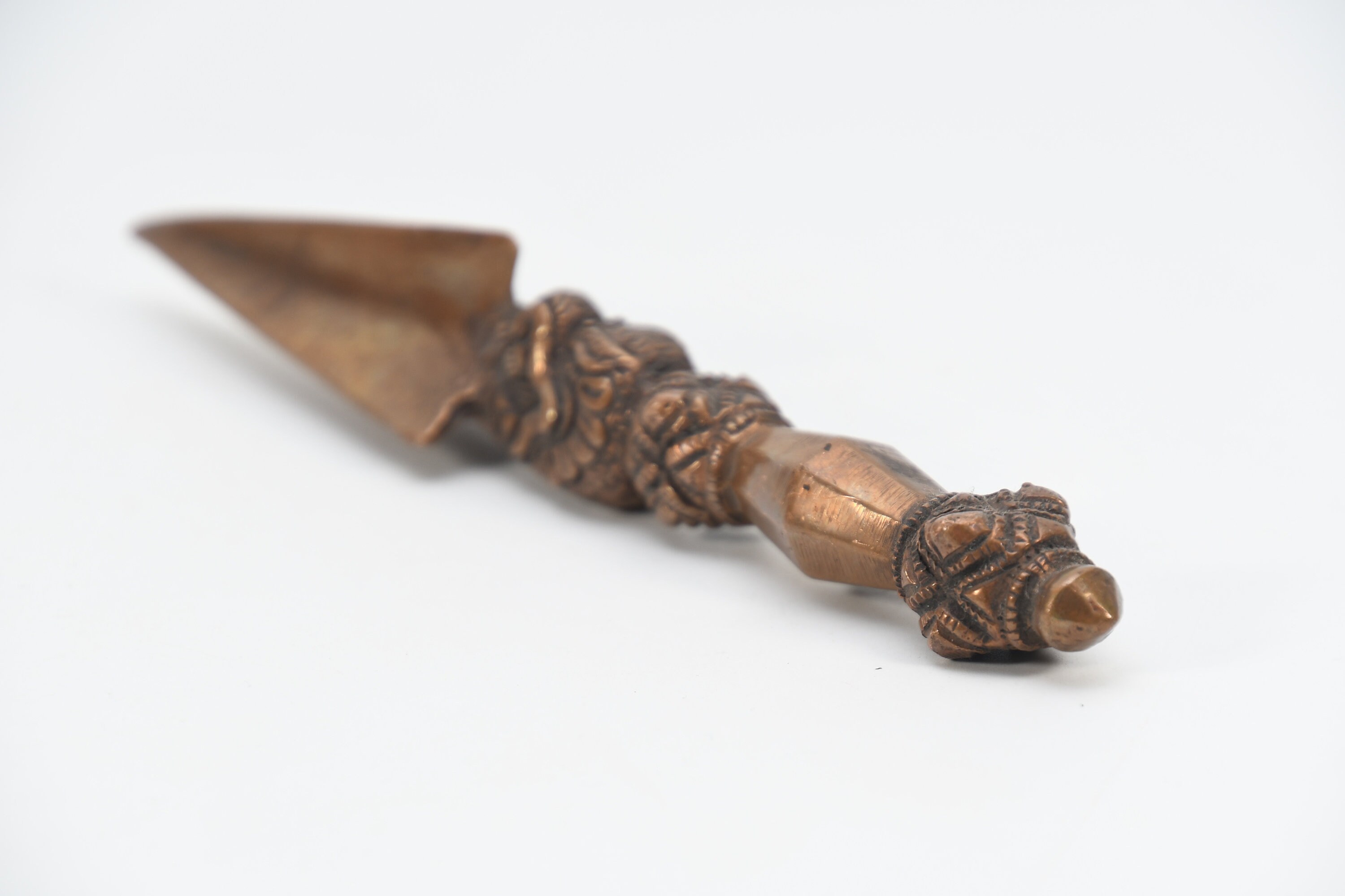 The three-sided style of the phurba comes from an ancient vedic tool. It has three segments on its blade, each representing the power of the phurba to transform negative energies. These energies are known as the 'three poisons,' and are attachment, ignorance, and aversion. The three sides of the phurba also represent the three spirit worlds, and the phurba itself represents the axis of the three spirit worlds. The handle of the phurba represents 'wisdom', while the blade represents 'method'.