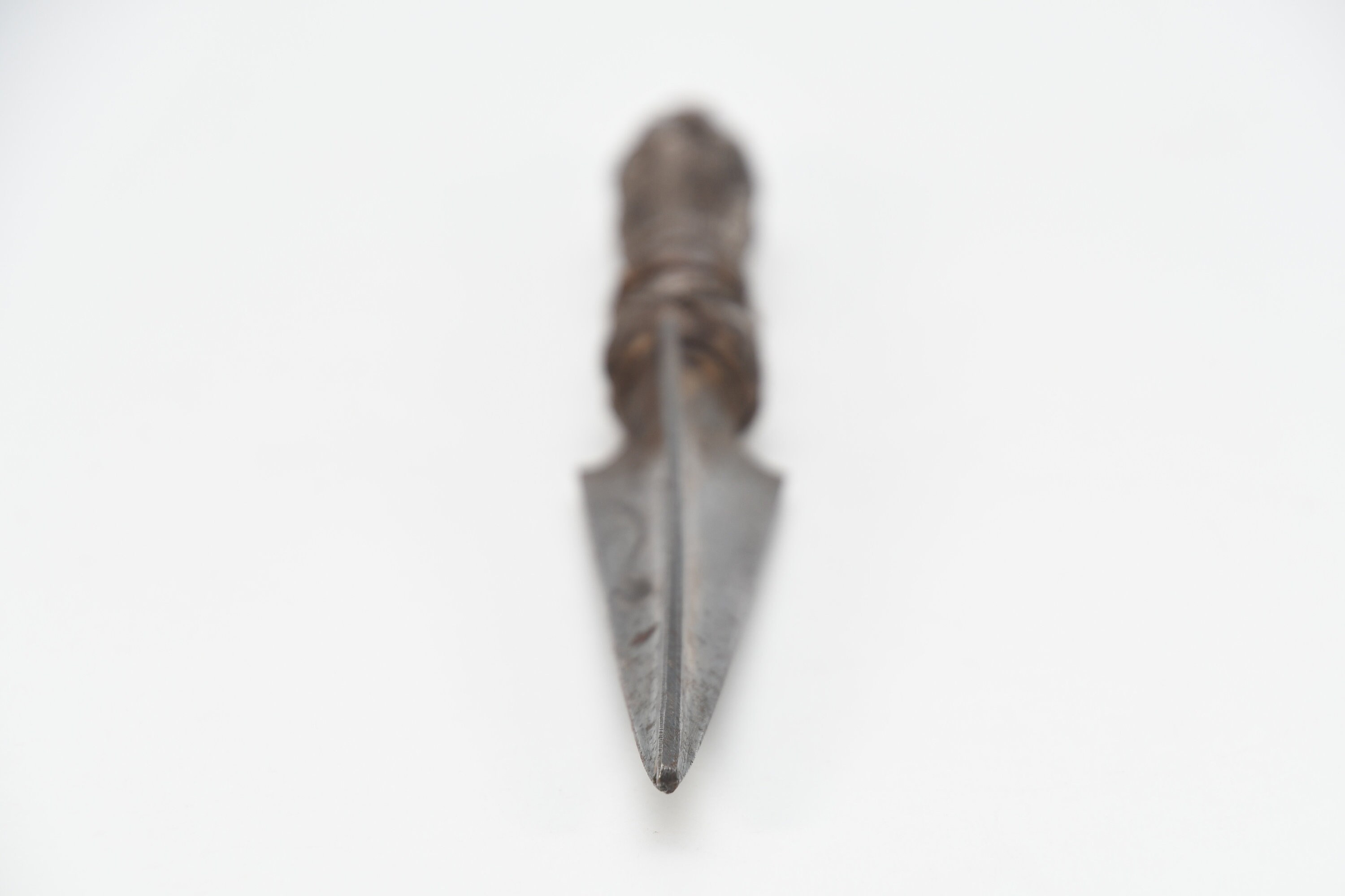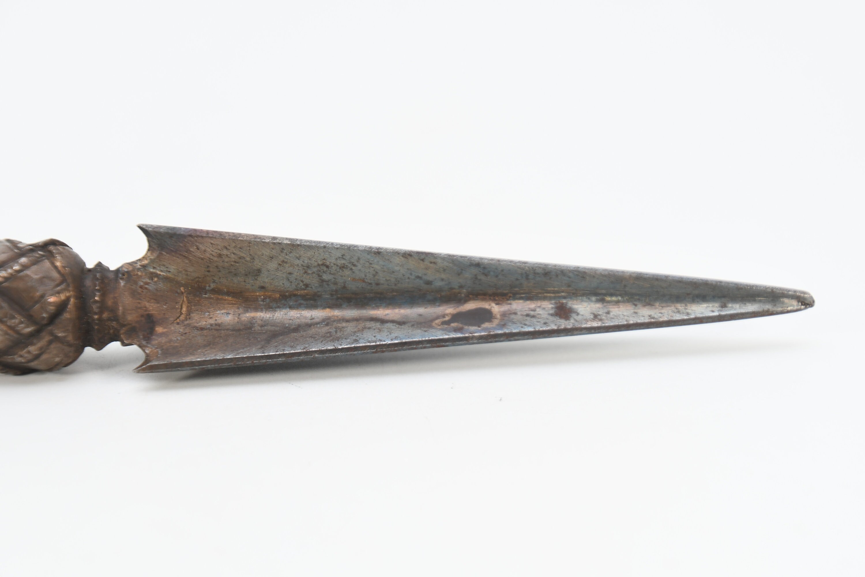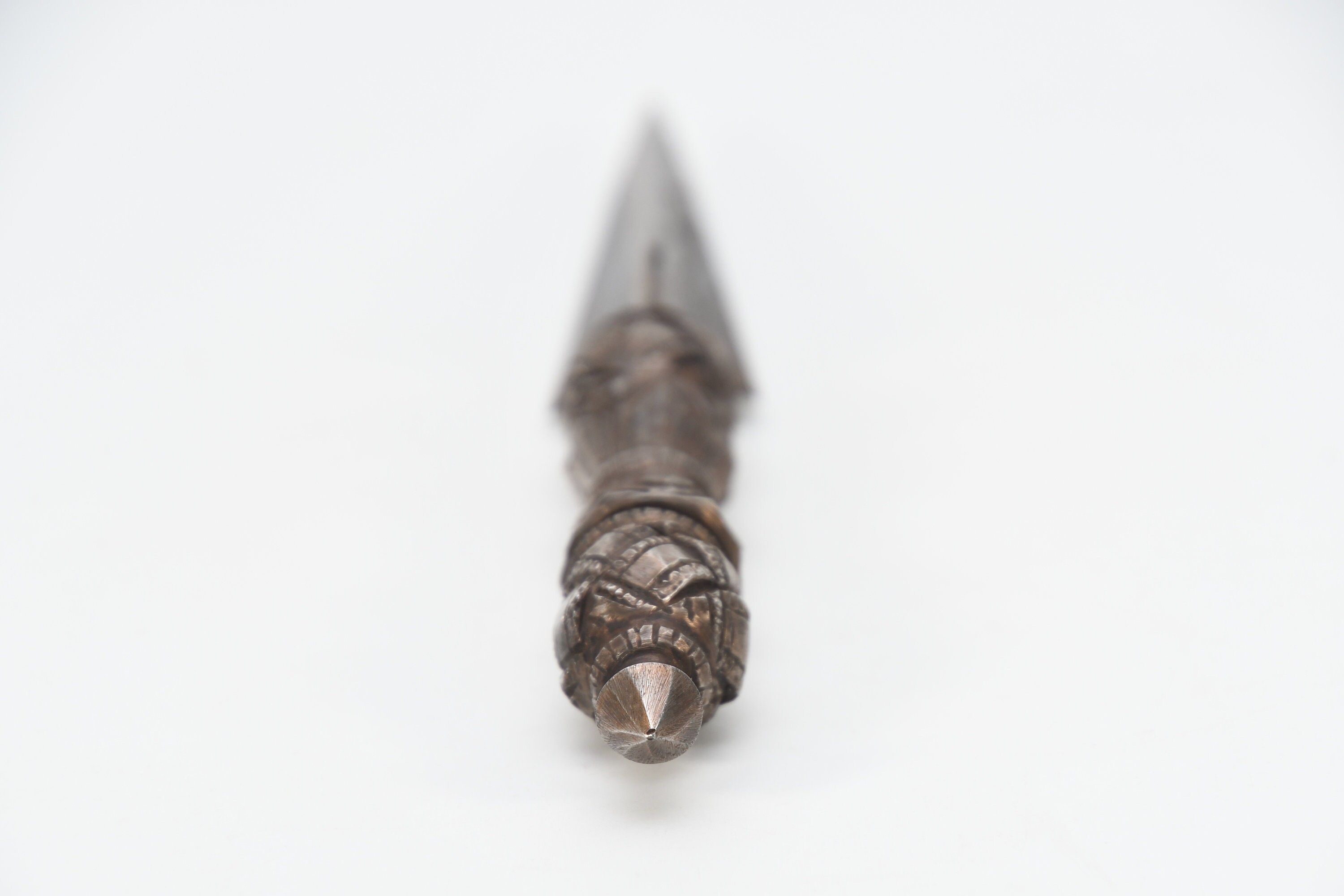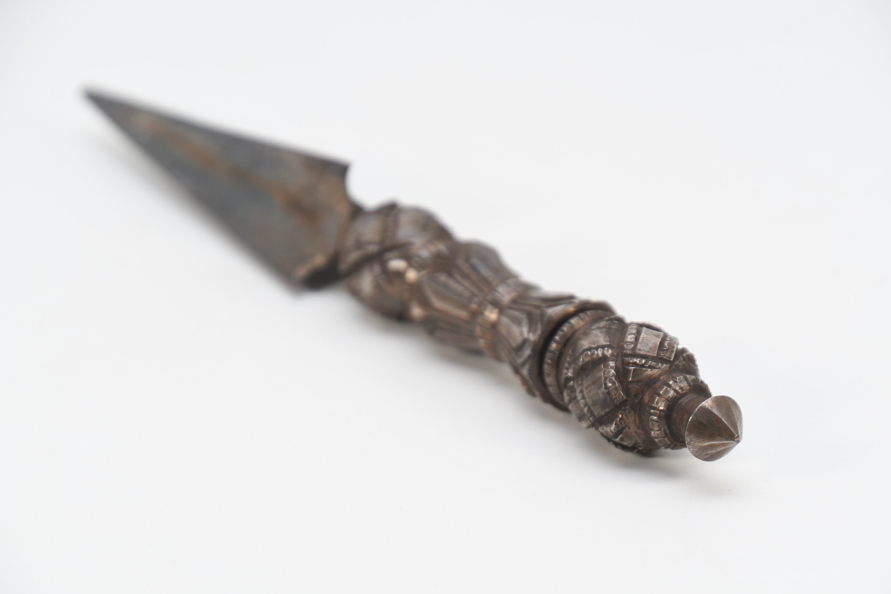 The three-sided style of the phurba comes from an ancient vedic tool. It has three segments on its blade, each representing the power of the phurba to transform negative energies. These energies are known as the 'three poisons,' and are attachment, ignorance, and aversion. The three sides of the phurba also represent the three spirit worlds, and the phurba itself represents the axis of the three spirit worlds. The handle of the phurba represents 'wisdom', while the blade represents 'method'.