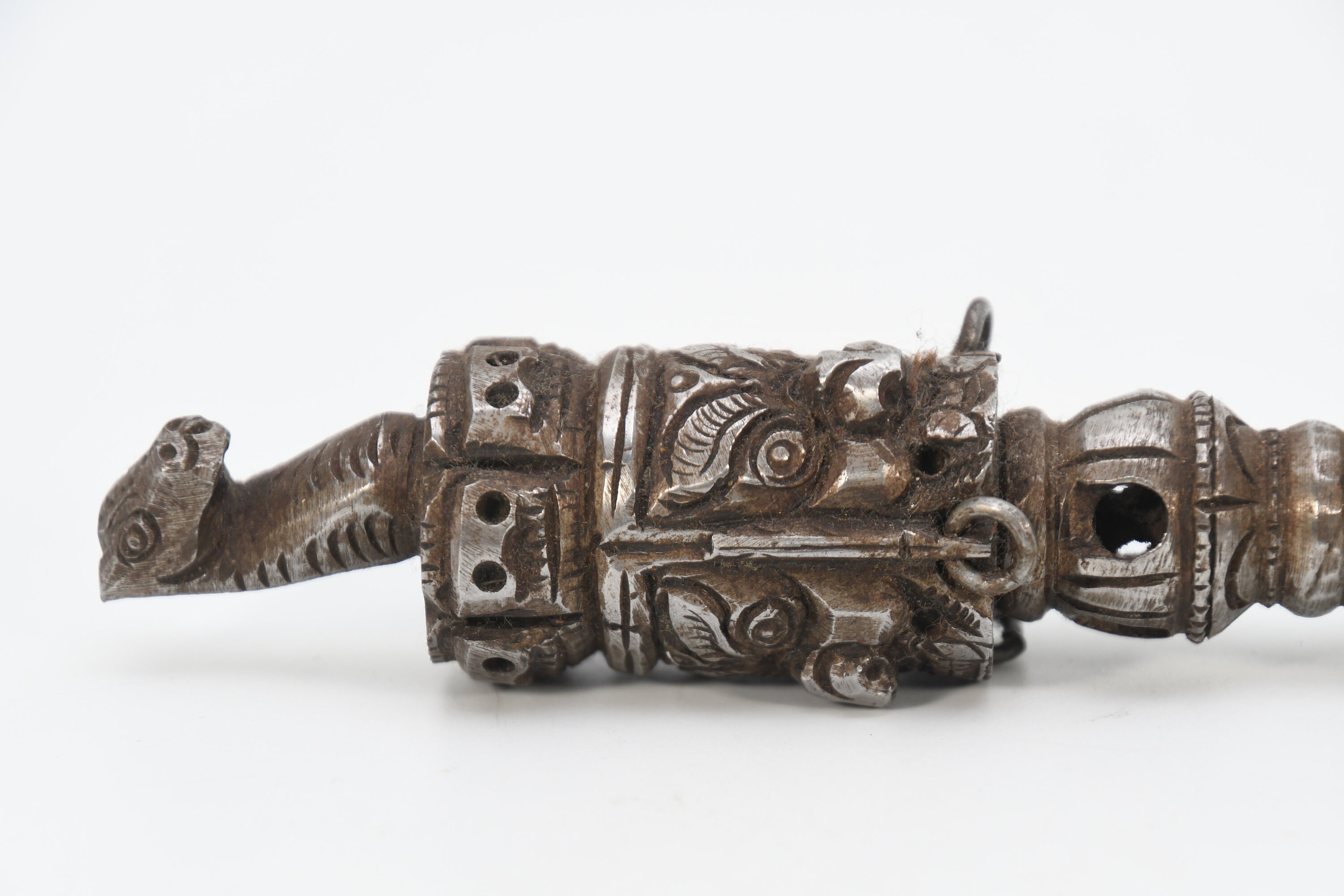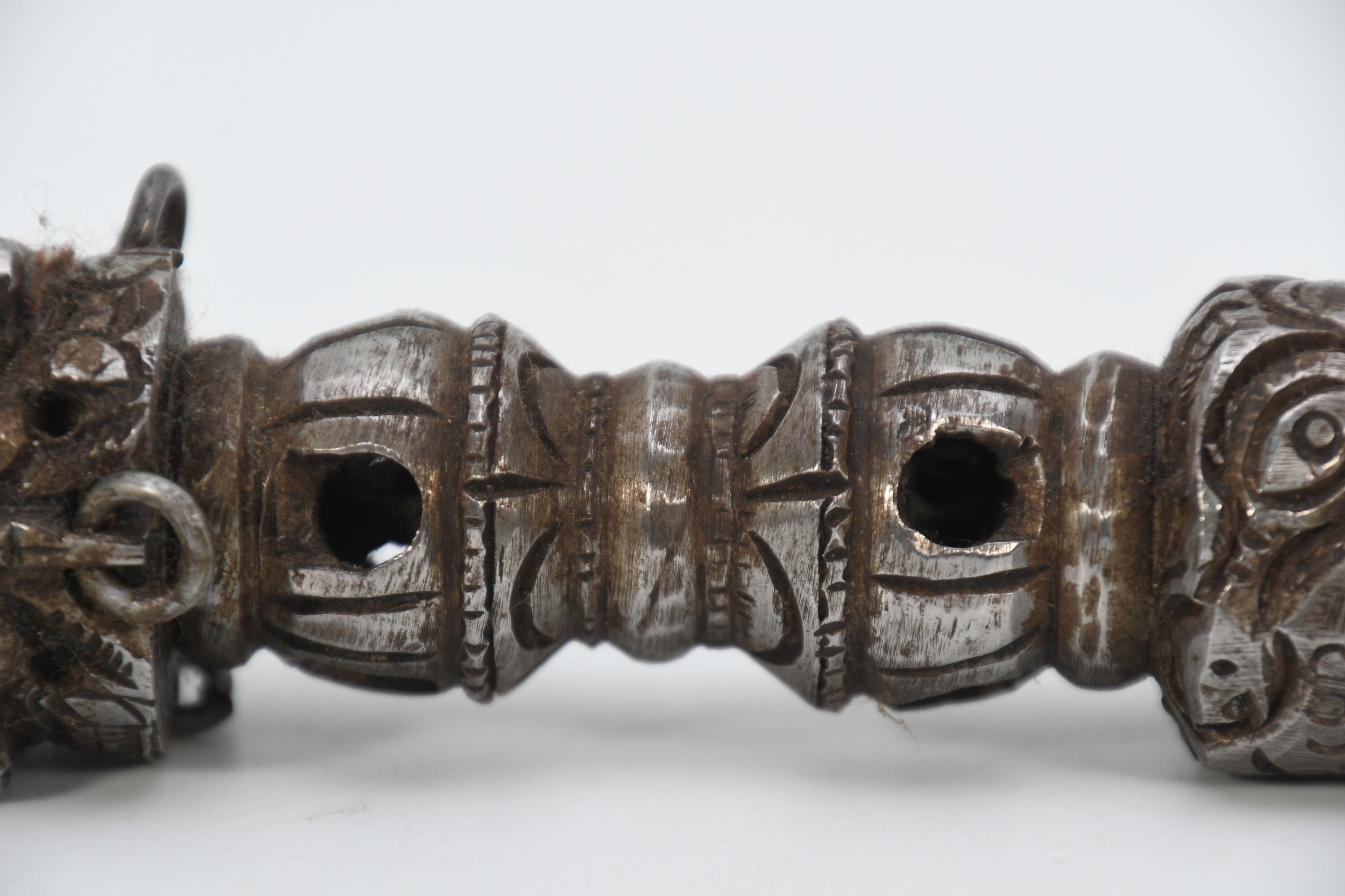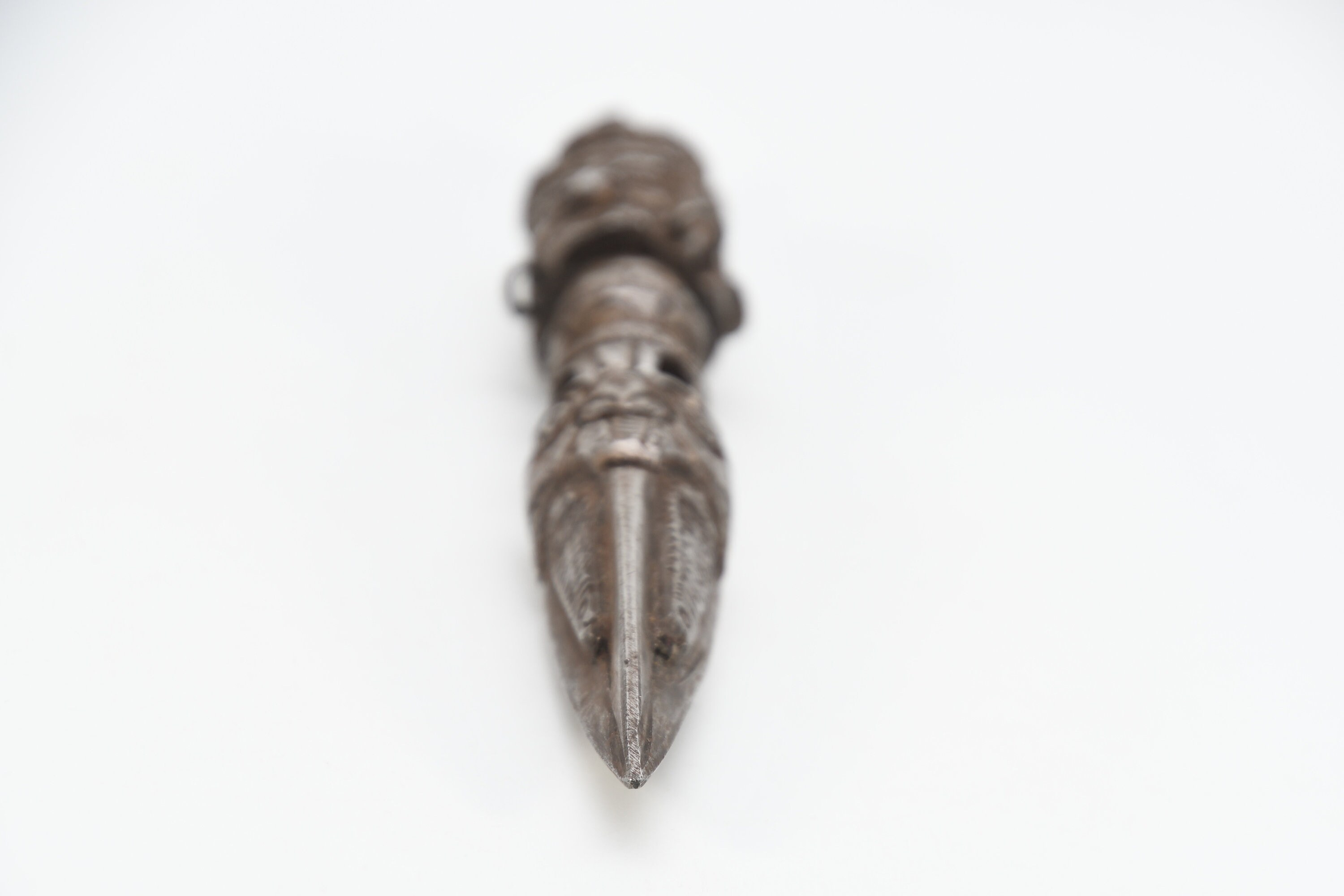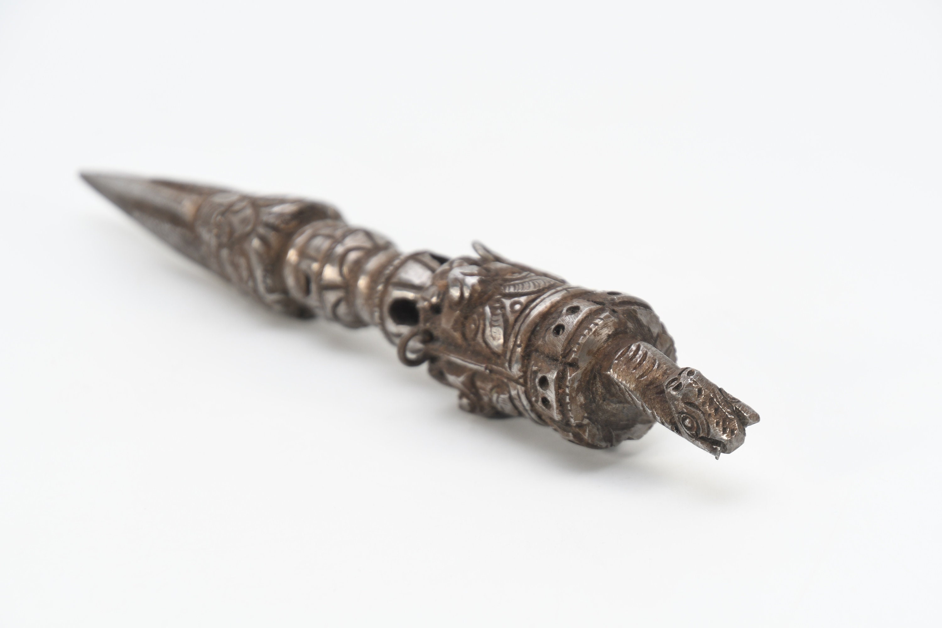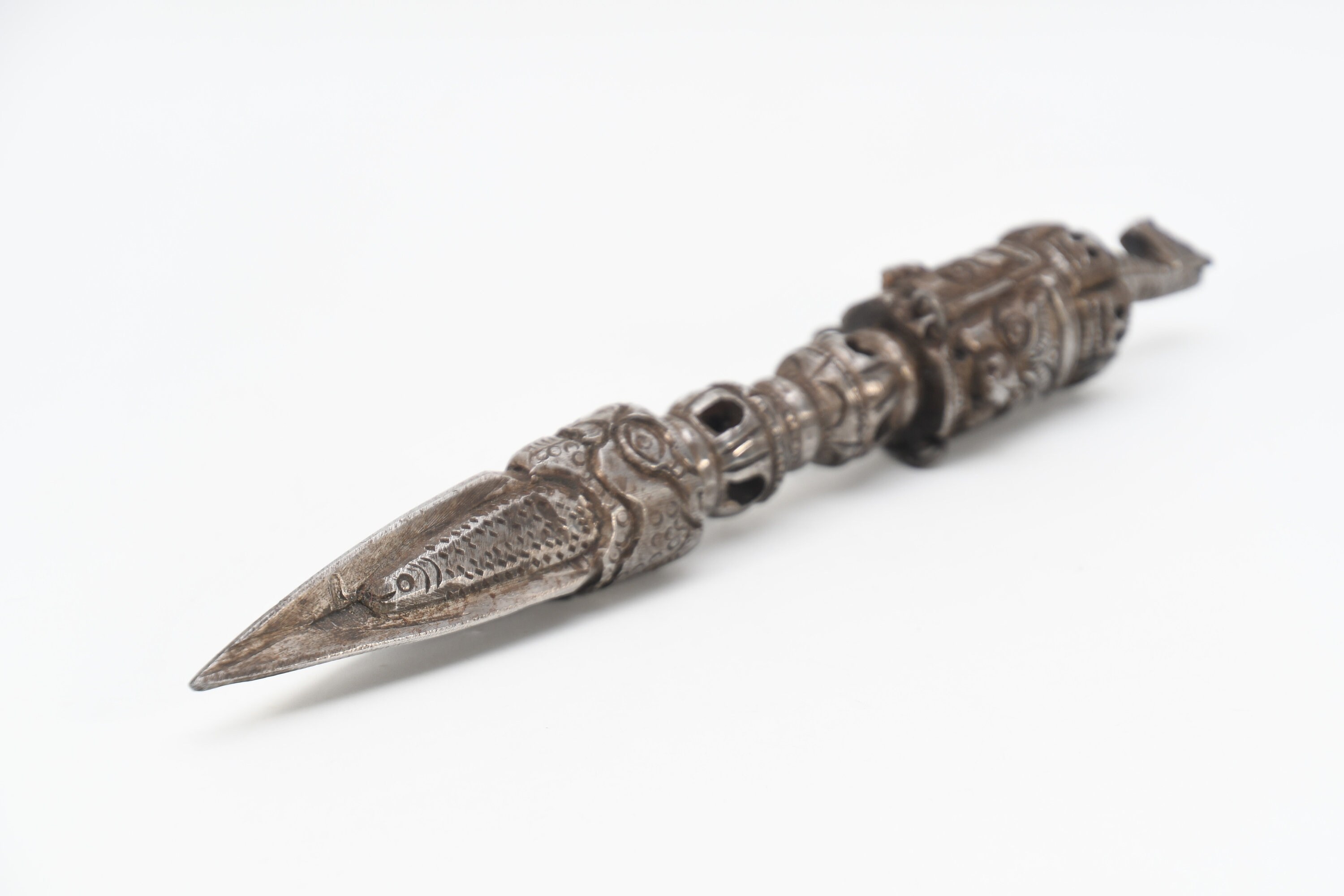 The Phurba is a triple-sided Tibetan ritual dagger or stake. Tibetan meaning for Phurba refers to a stake used for tethering or a peg used for securing a tent. While other objects of similar shape can be considered Phurba, it is usually a knife with three distinct segments, one of which is a characteristic three-sided blade or point. The segments and the triple blade represent the three spirit worlds, while the Phurba as a whole symbolizes the "worlds axis" that brings all three worlds together. This Ritual Buddhist Dagger or dart symbolizes the slaying or destruction of foe or obstructions. This ritual object is usually made of various clay, woods, metals or human or monkey bones or a combination that is considered a powerful element for driving away evil spirits, however wood and bone are also used and often required for certain ritual events. The lower part of the blade is said to represent "Method" while the handle "Wisdom". These would have been two objects that were vital in the survival of people in these hash regions. The Phurba is patterned after an ancient Vedic tool, a stake used to tether sacrificial animals. It is also regarded as a powerful weapon that subdues evil spirits and negative energies, transforming them into positive forces.