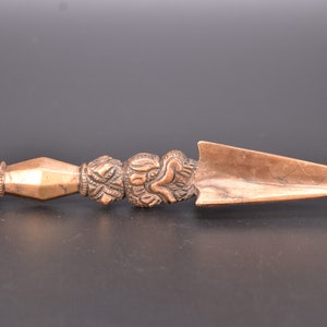 The Phurba is triple sided Tibetan ritual dagger or stake. Tibetan meaning for Phurba refers to a stake used for tethering or a peg used for securing a tent. While other objects of similar shape can be considered Phurba , it is usually a knife with three distinct segments, one of which is a characterstic three - sided blade or point. The segments and the triple blade represent the three spirit worlds, while the Phurba as a whole symbolizes the "worlds axis" bring all three worlds together. This Ritual Buddhist Dagger or dart symbolizes the slaying or destruction of foe or obstructions. This ritual object is usually made of various clay, woods, metals or human or monkey bones or a combination which is considered a powerful element for driving away evil spirits, however wood and bone are also used and often required for certain ritual events. The lower part of the blade is said to represent "Method" while the handle "Wisdom". These would have been two objects that were vital in the survival of people in these hash regions. The Phurba is patterned after an ancient Vedic tool, a stake used to tether sacrifical animals.
