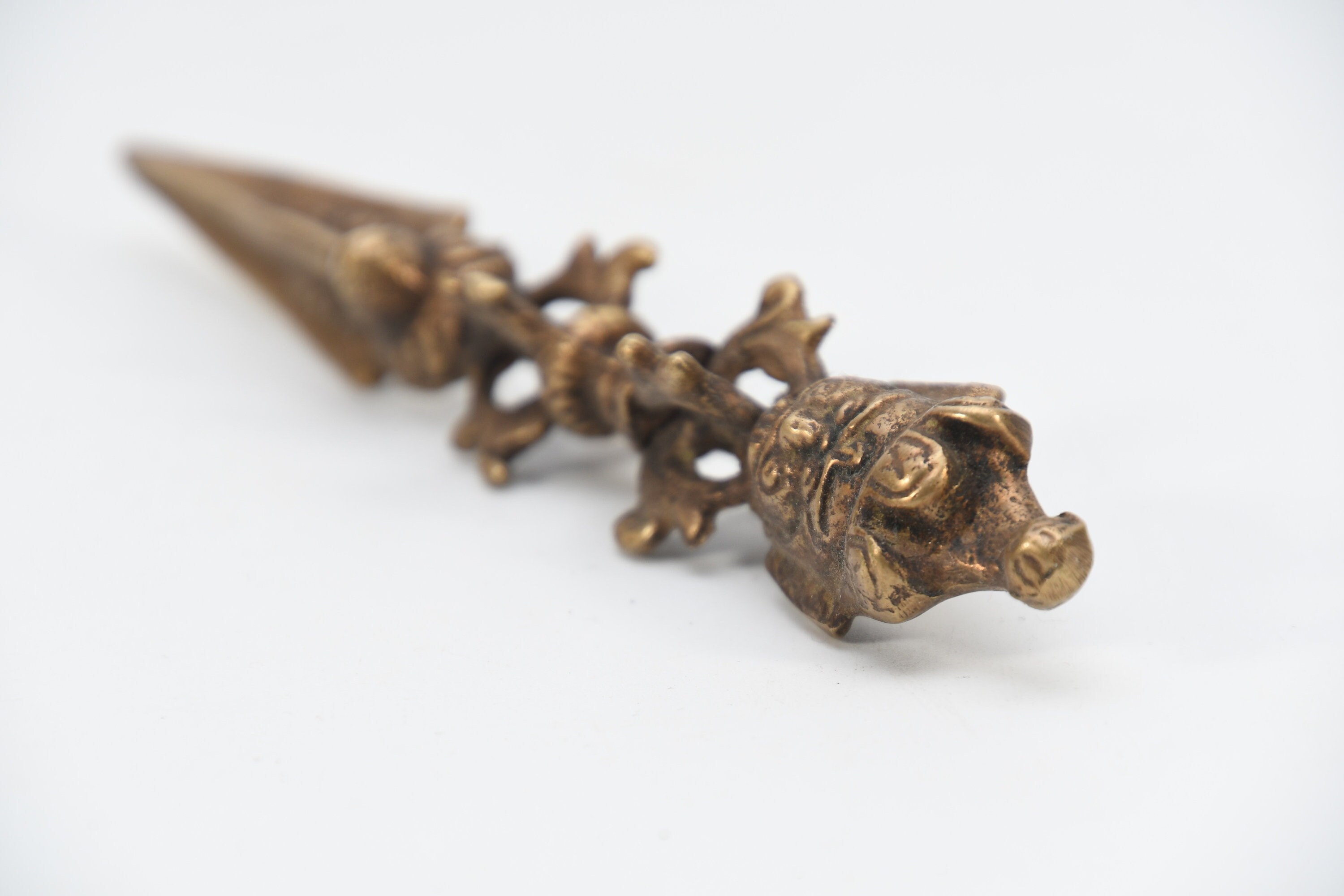 The Handle of the Phurba represents wisdom and is often modeled as an eight-sided bulb with symmetrical nodes at each end. There are various interpretations to the presence of these nodes. From the belief that Nirvana is locked inside, to the belief that the different sections of the knots contain the paradises of several gods. By going as far as the desire for a formless form, representing the fact of being shapeless in the kingdom of the Buddhas.