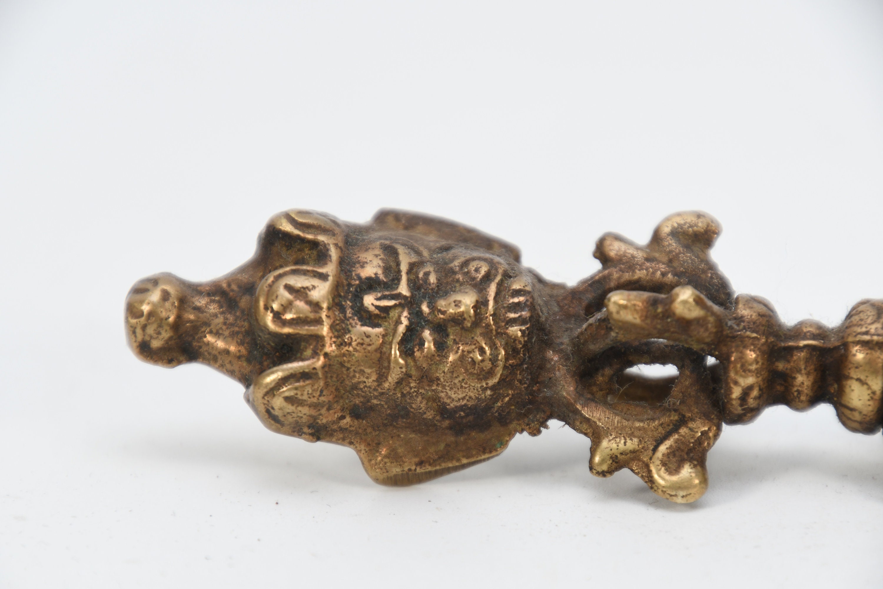 The top of the handle often displays the three wrathful deities of Yamantaka, Amrita Kundalini, and Hayagriva. Yamantaka, the white face, symbolizes the body and the destruction of hatred. Amrita, her face colored blue, symbolizes the spirit and the destruction of illusion. Hayagriva, the face of red color, symbol of speech and the destruction of greed.