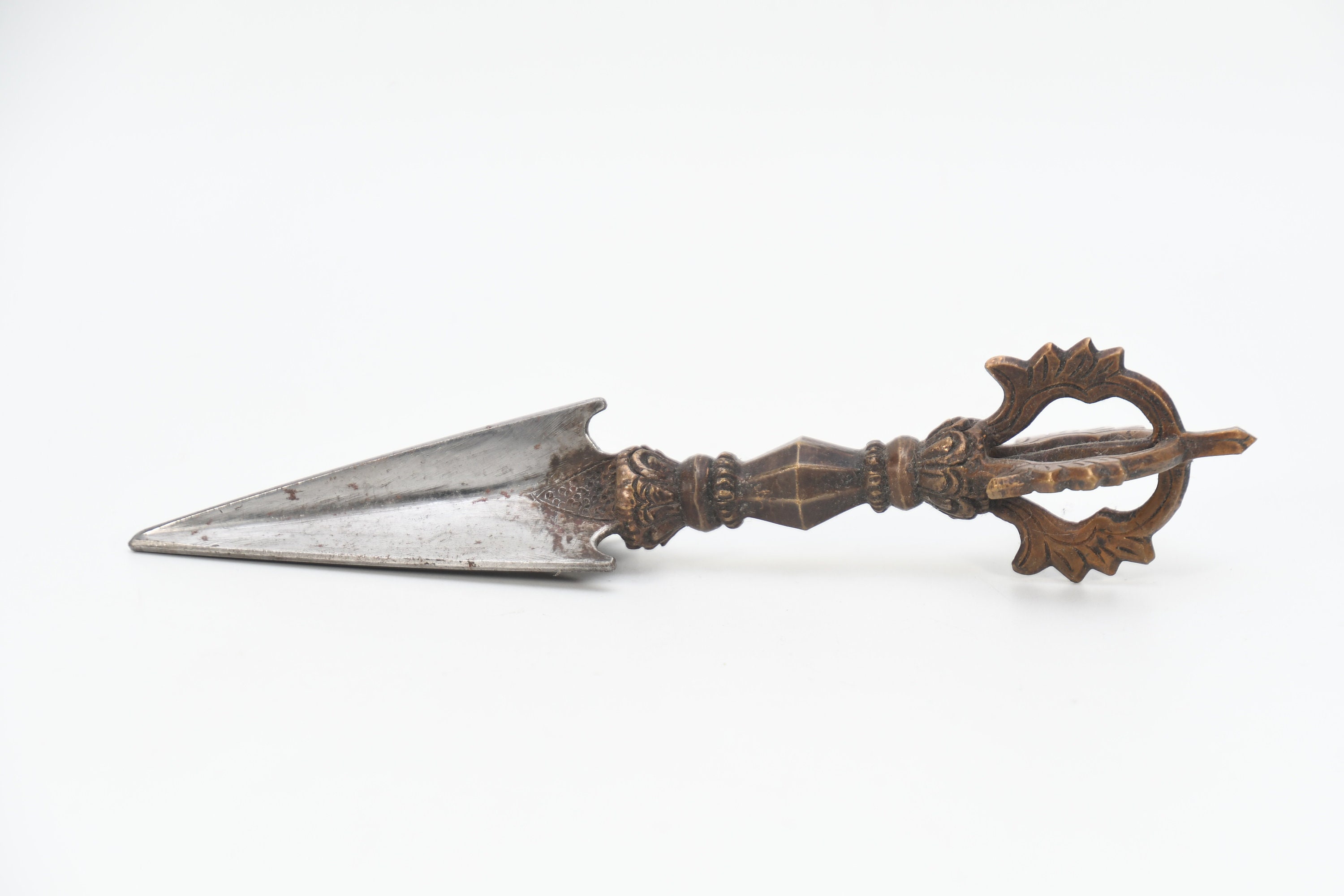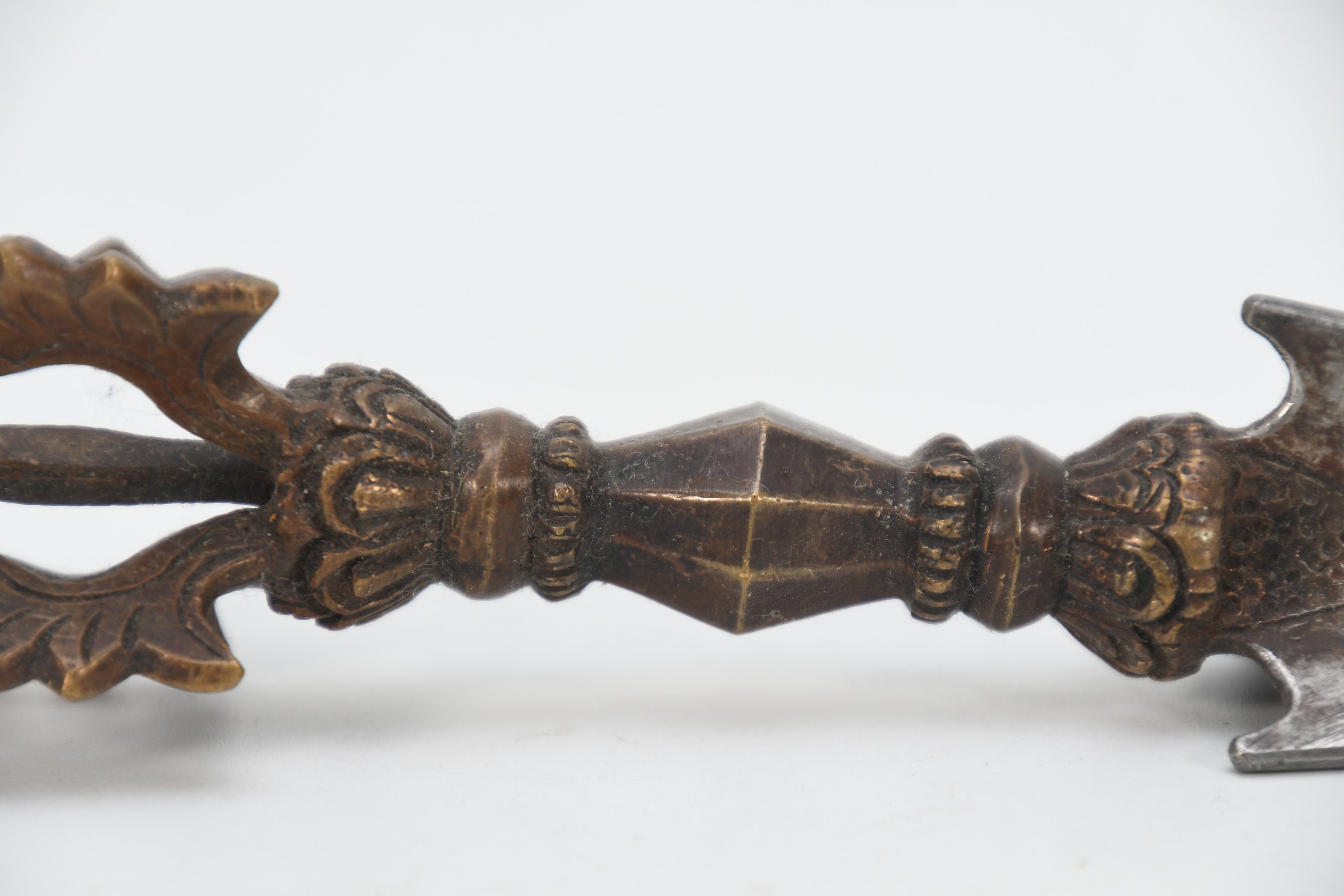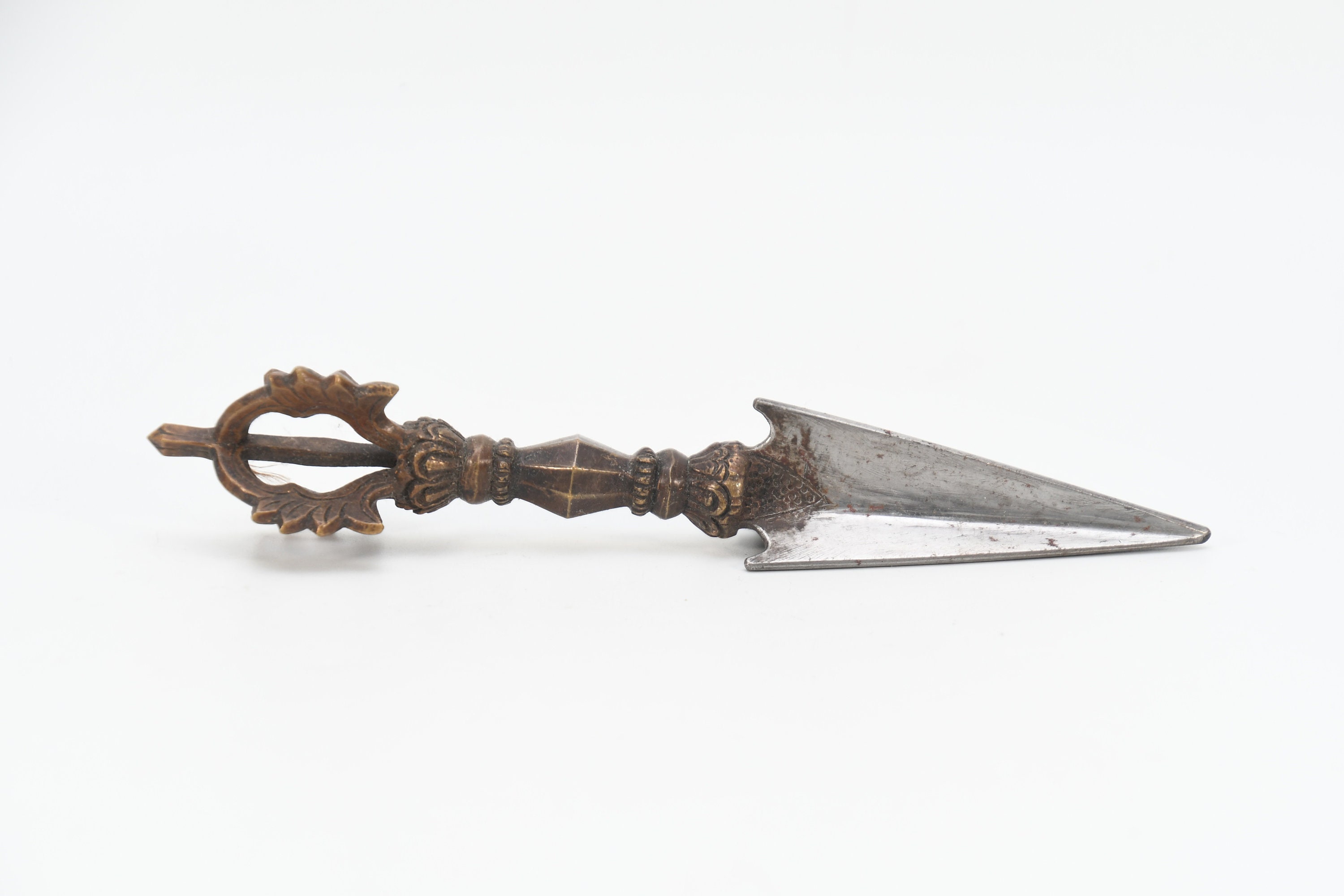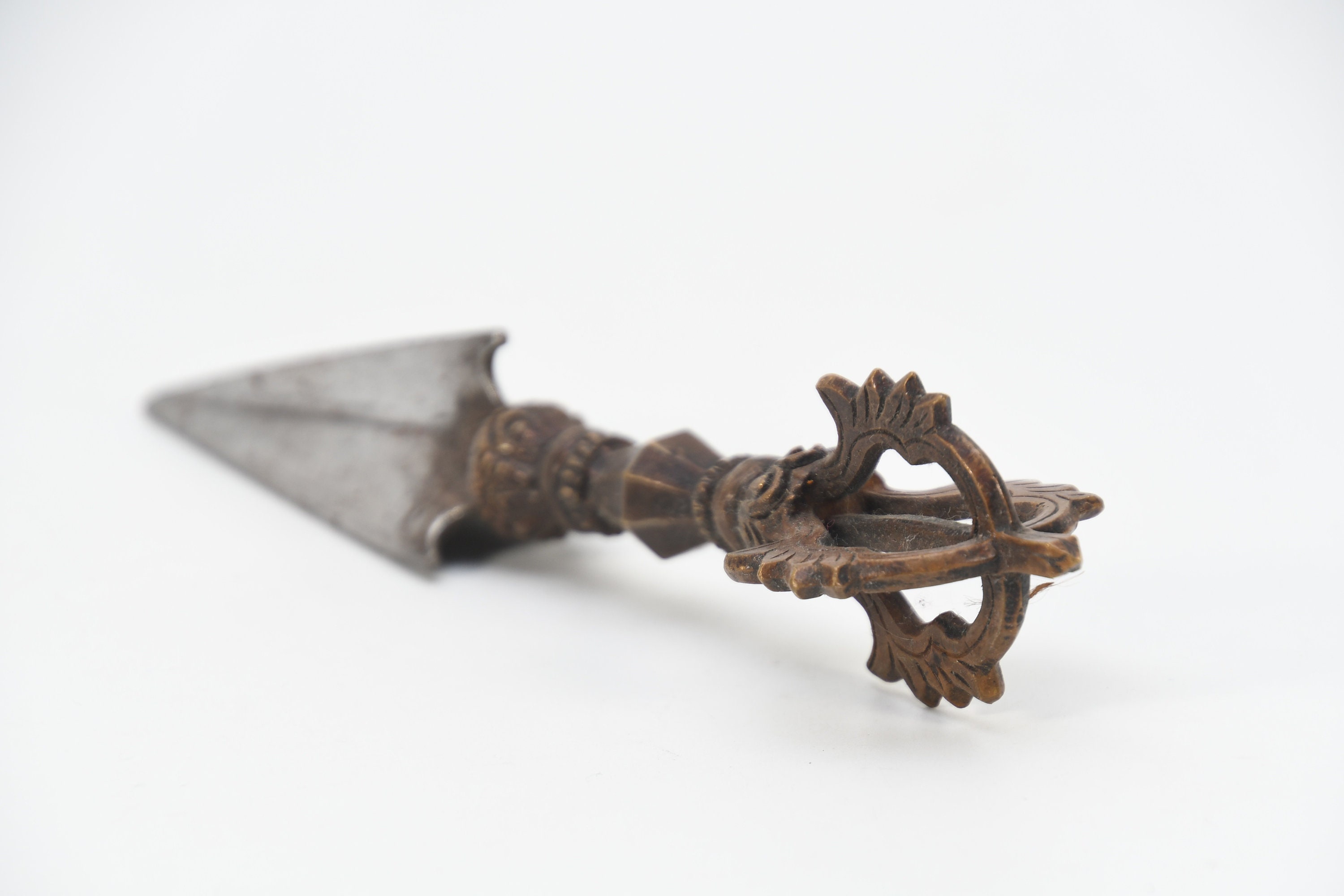 The three-sided style of the phurba comes from an ancient vedic tool. It has three segments on its blade, each representing the power of the phurba to transform negative energies. These energies are known as the 'three poisons,' and are attachment, ignorance, and aversion. The three sides of the phurba also represent the three spirit worlds, and the phurba itself represents the axis of the three spirit worlds. The handle of the phurba represents 'wisdom', while the blade represents 'method'.