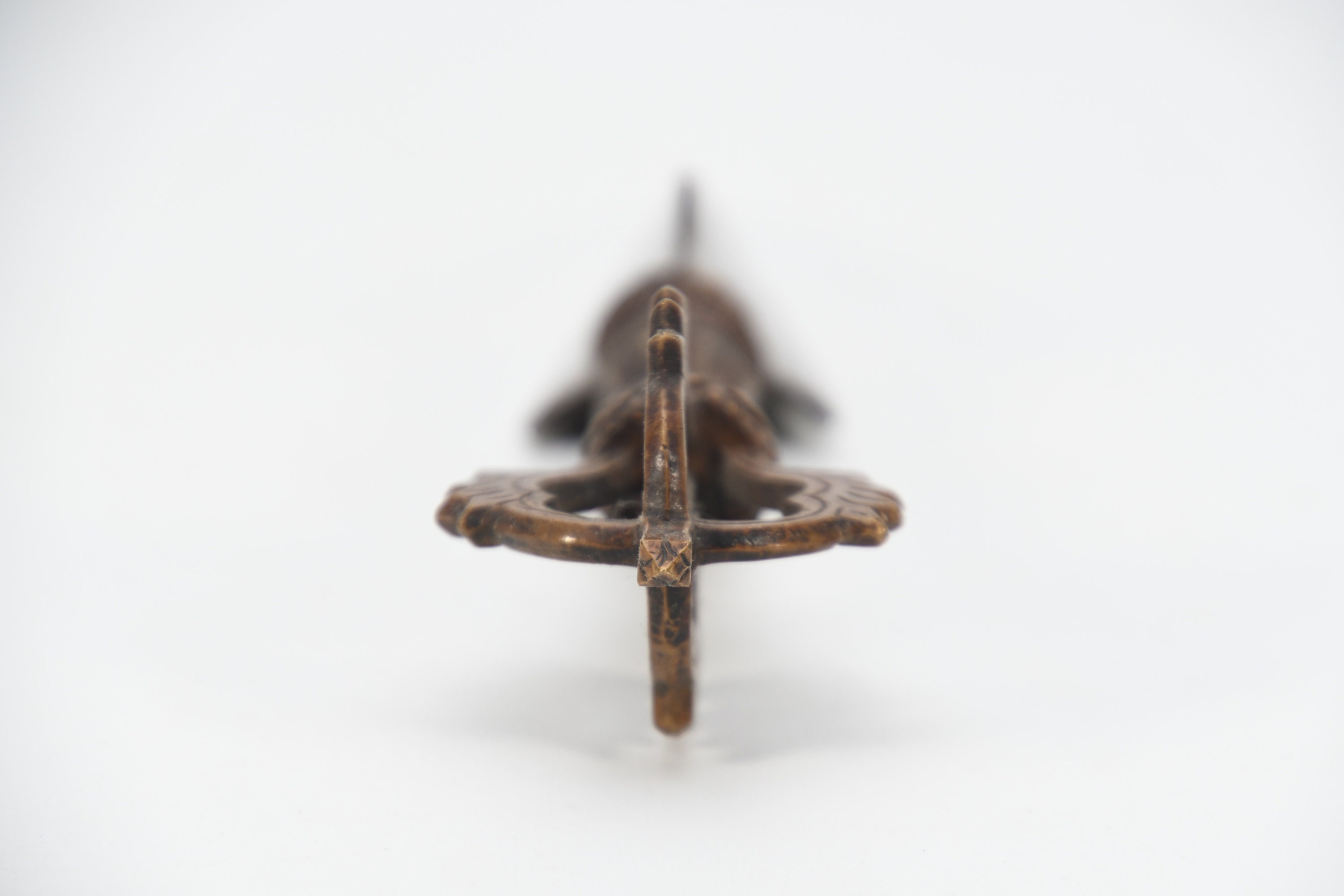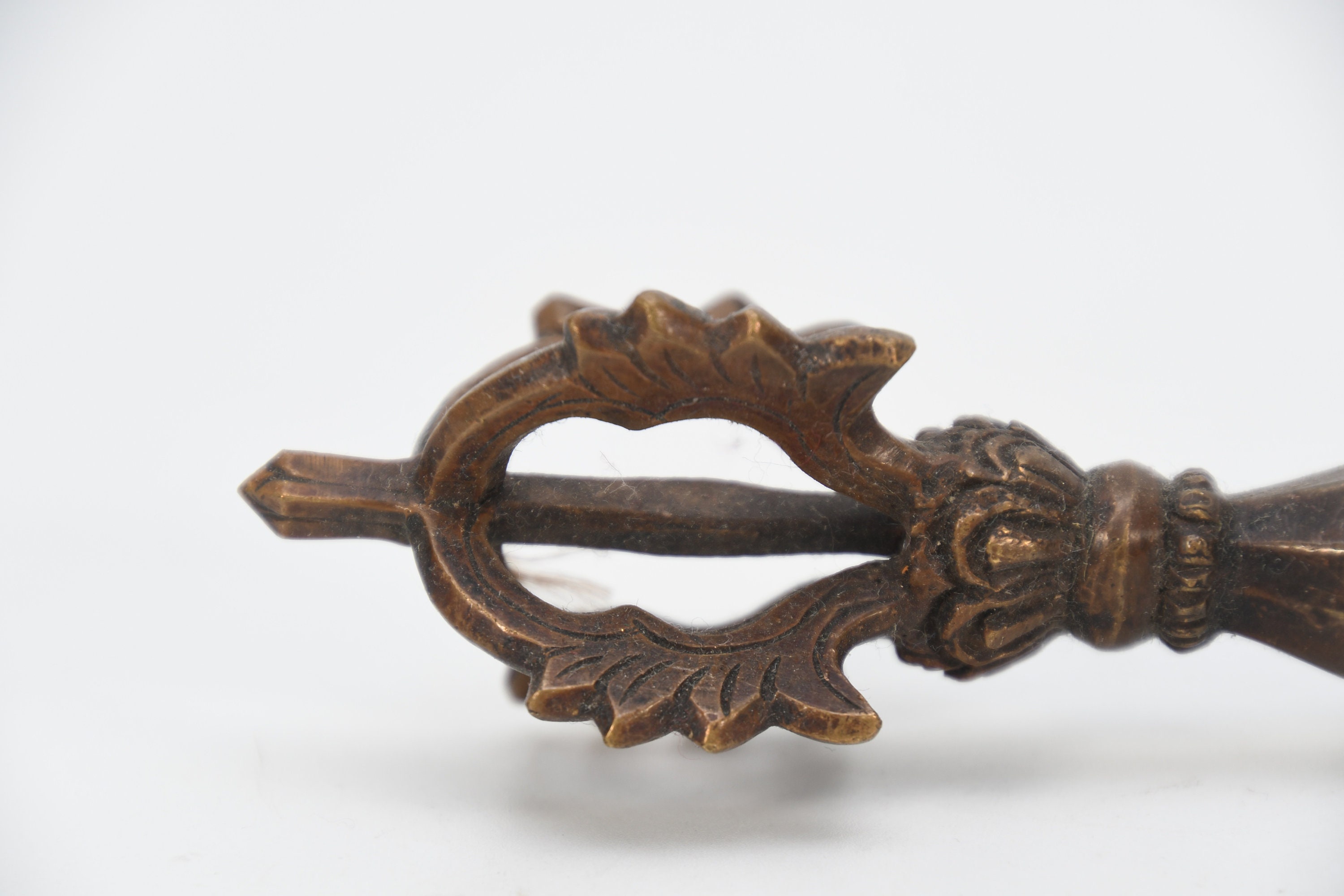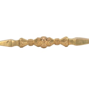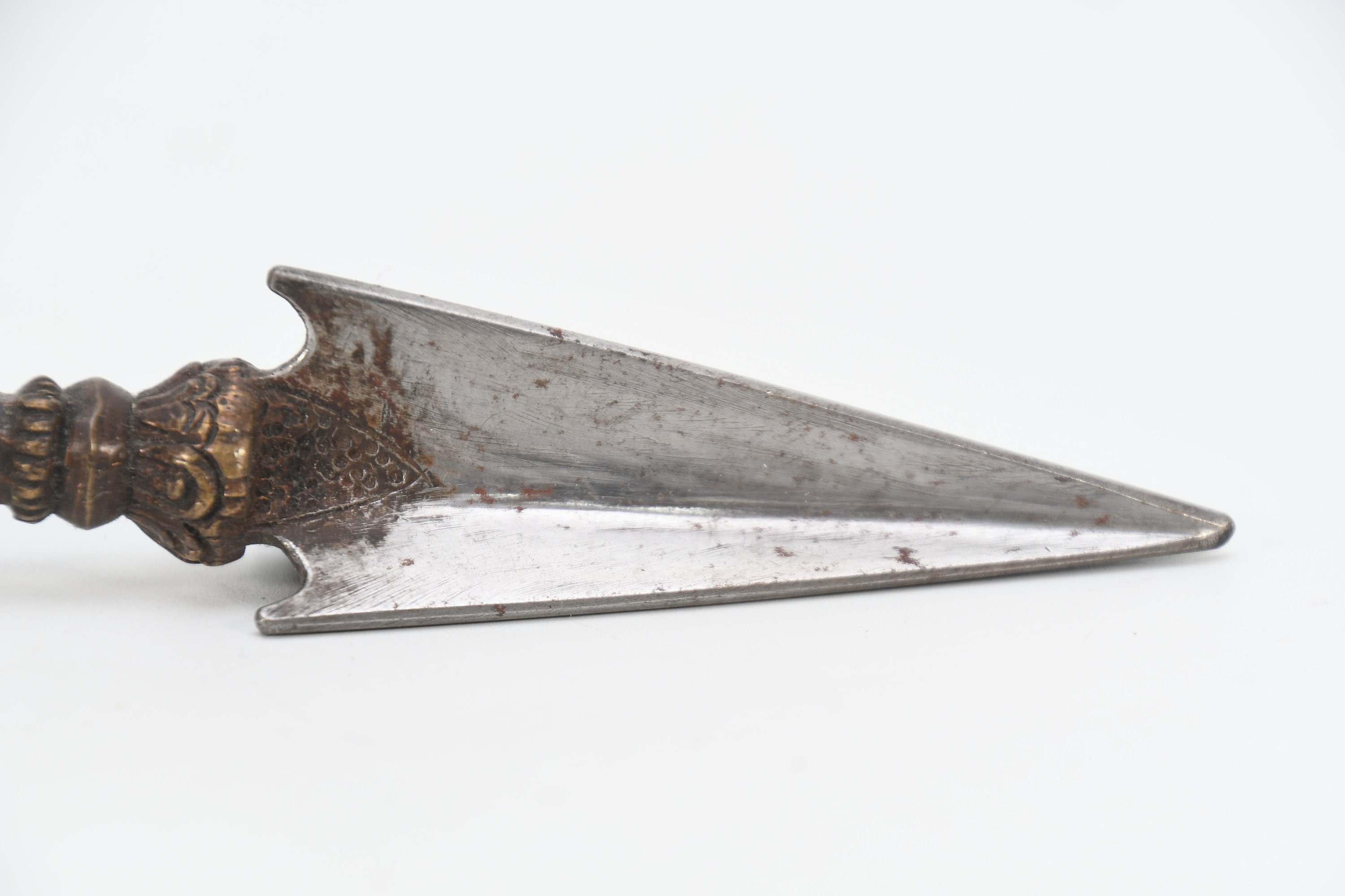 The three-sided style of the phurba comes from an ancient vedic tool. It has three segments on its blade, each representing the power of the phurba to transform negative energies. These energies are known as the 'three poisons,' and are attachment, ignorance, and aversion. The three sides of the phurba also represent the three spirit worlds, and the phurba itself represents the axis of the three spirit worlds. The handle of the phurba represents 'wisdom', while the blade represents 'method'.