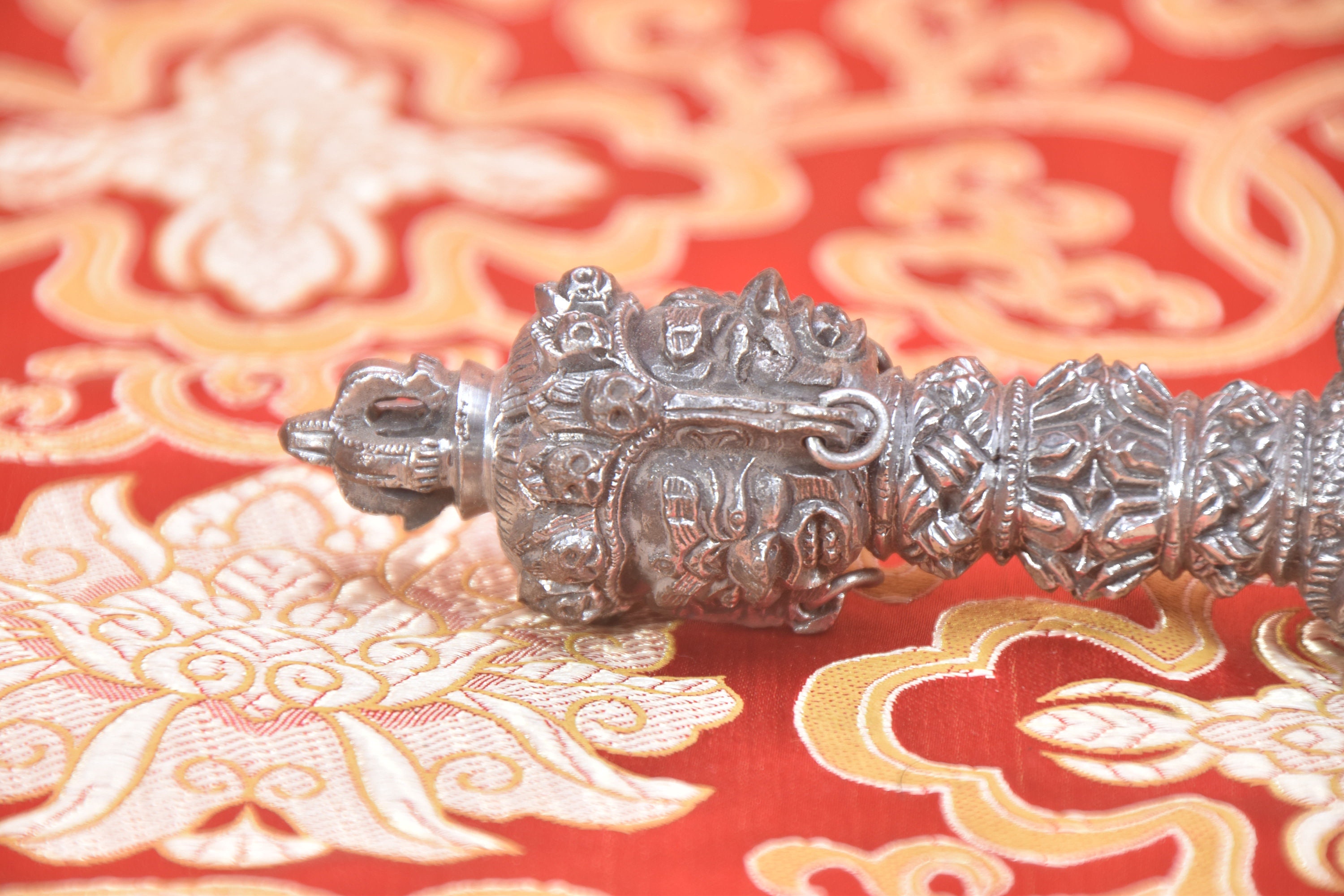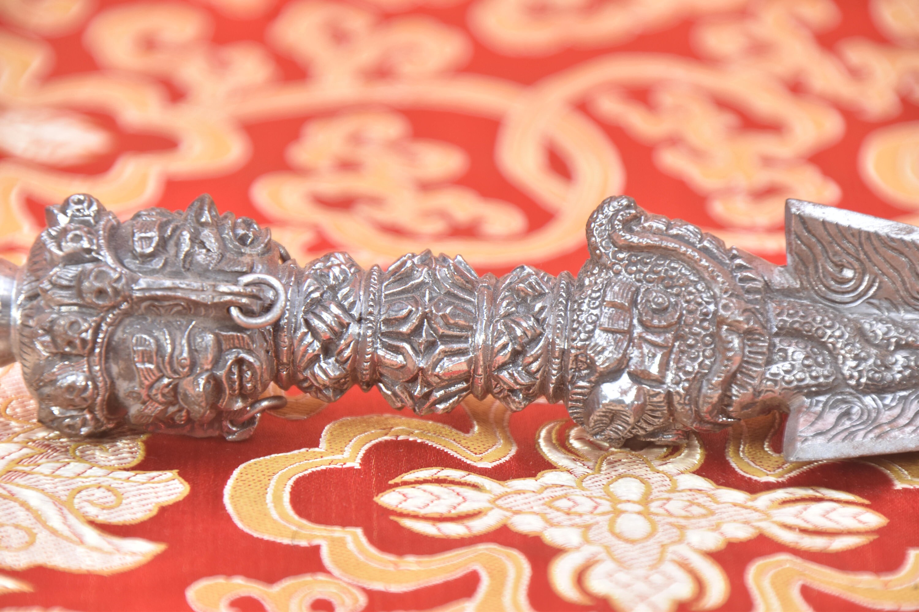 The top of the handle often displays the three wrathful deities of Yamantaka, Amrita Kundalini, and Hayagriva. Yamantaka, the white face, symbolizes the body and the destruction of hatred. Amrita, her face colored blue, symbolizes the spirit and the destruction of illusion. Hayagriva, the face of red color, the symbol of speech and the destruction of greed.