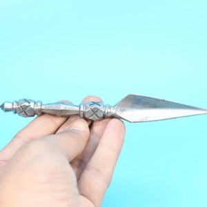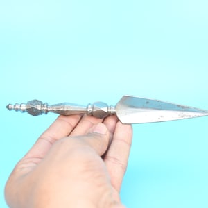 The three-sided style of the phurba comes from an ancient Vedic tool. It has three segments on its blade, each representing the power of the phurba to transform negative energies. These energies are known as the 'three poisons,' and are attachment, ignorance, and aversion. The three sides of the phurba also represent the three spirit worlds, and the phurba itself represents the axis of the three spirit worlds. The handle of the phurba represents 'wisdom', while the blade represents 'method'.