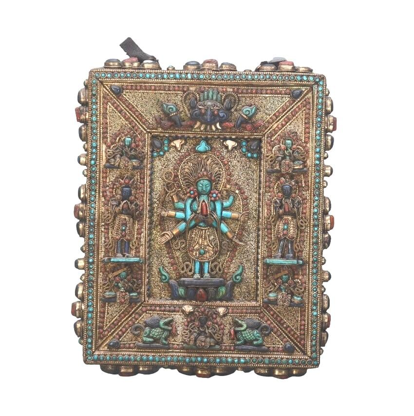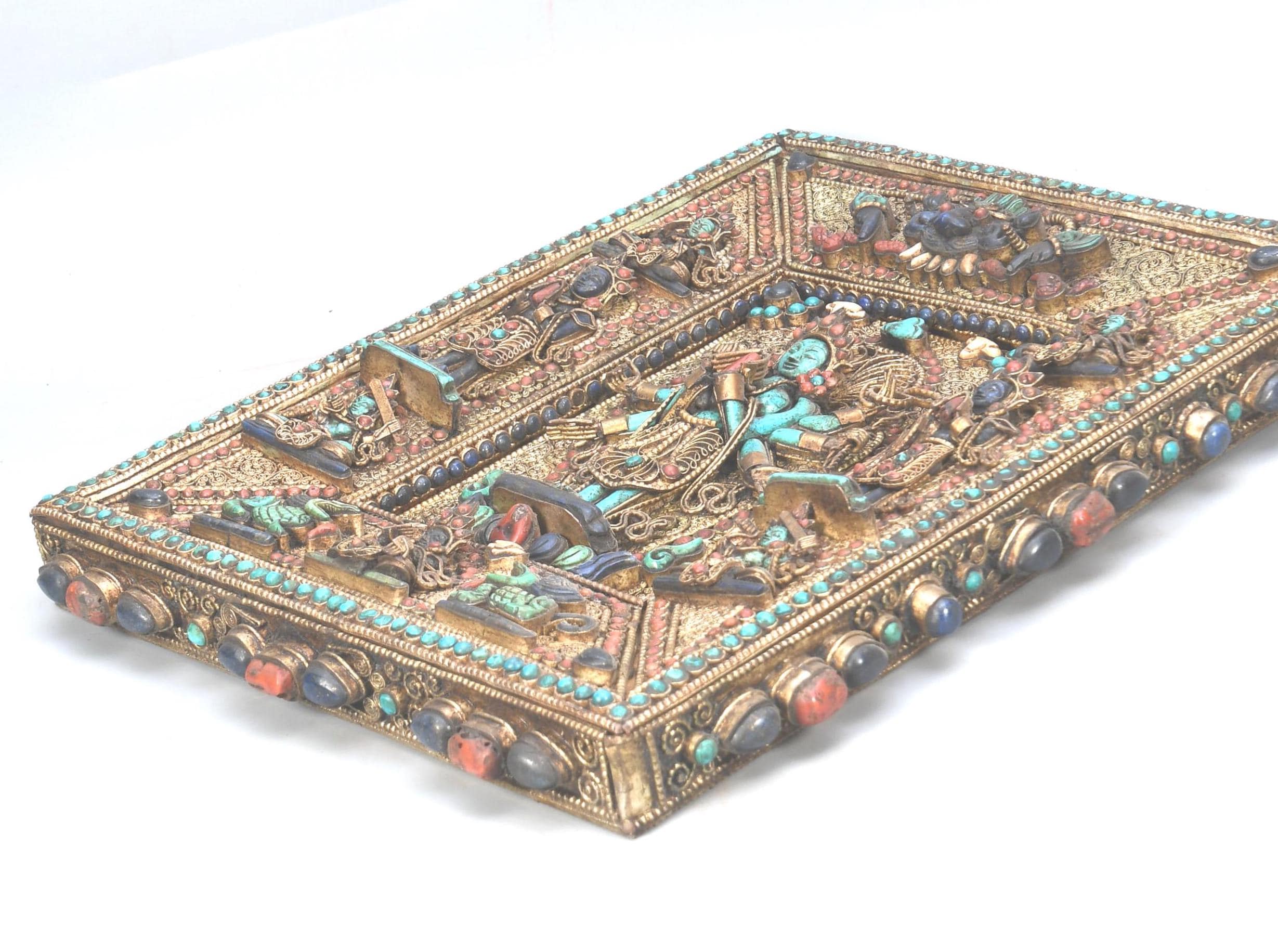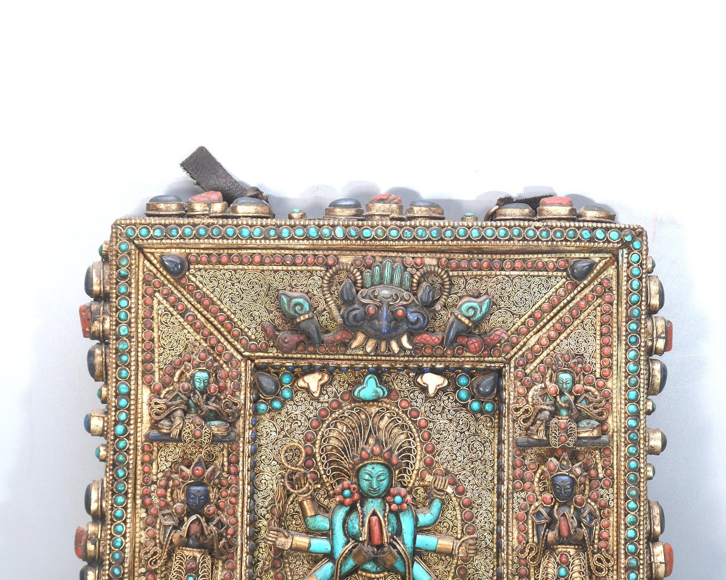 Handmade Carved Buddha Thanka Wall Hanging, Gold Copper Gemstone Art