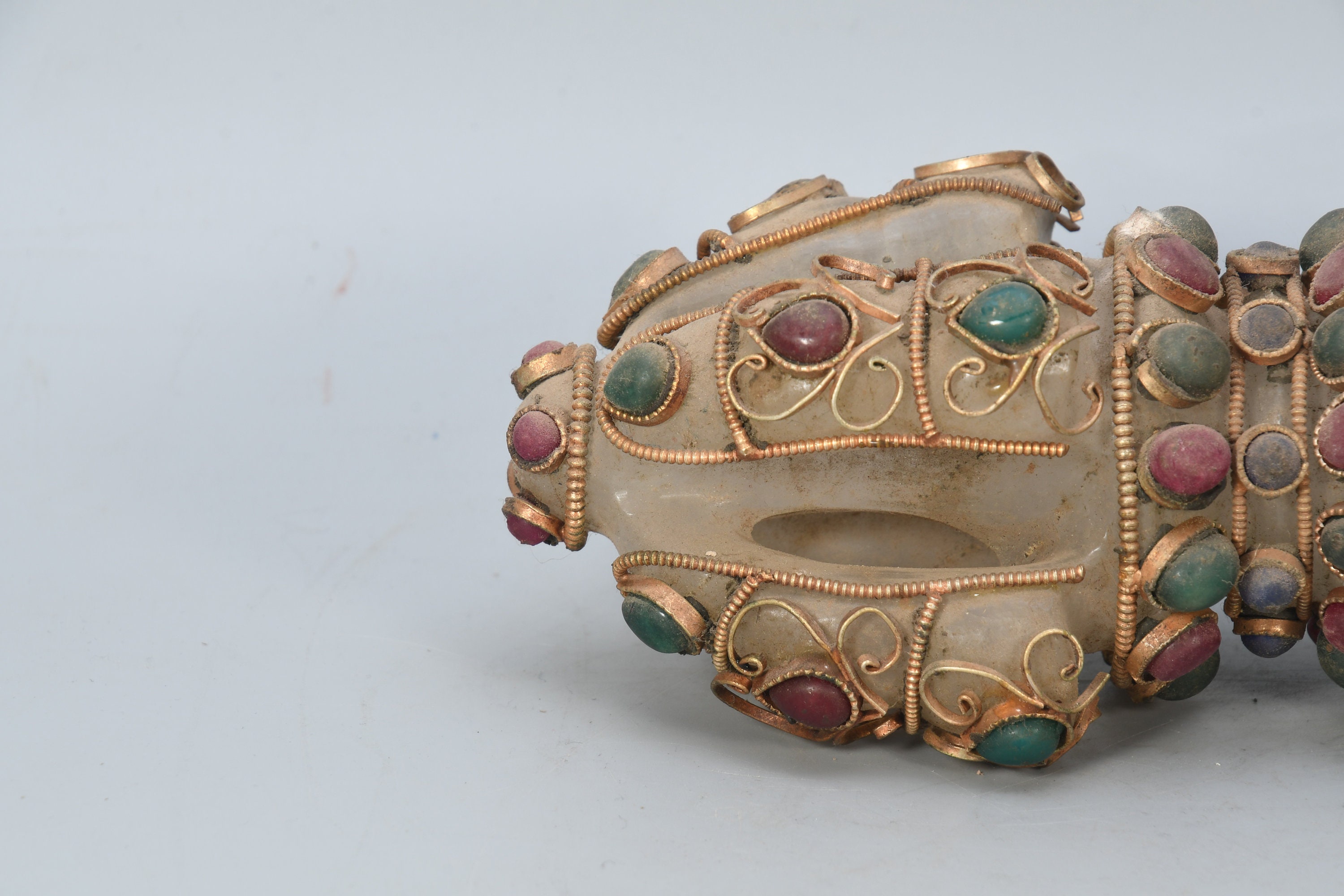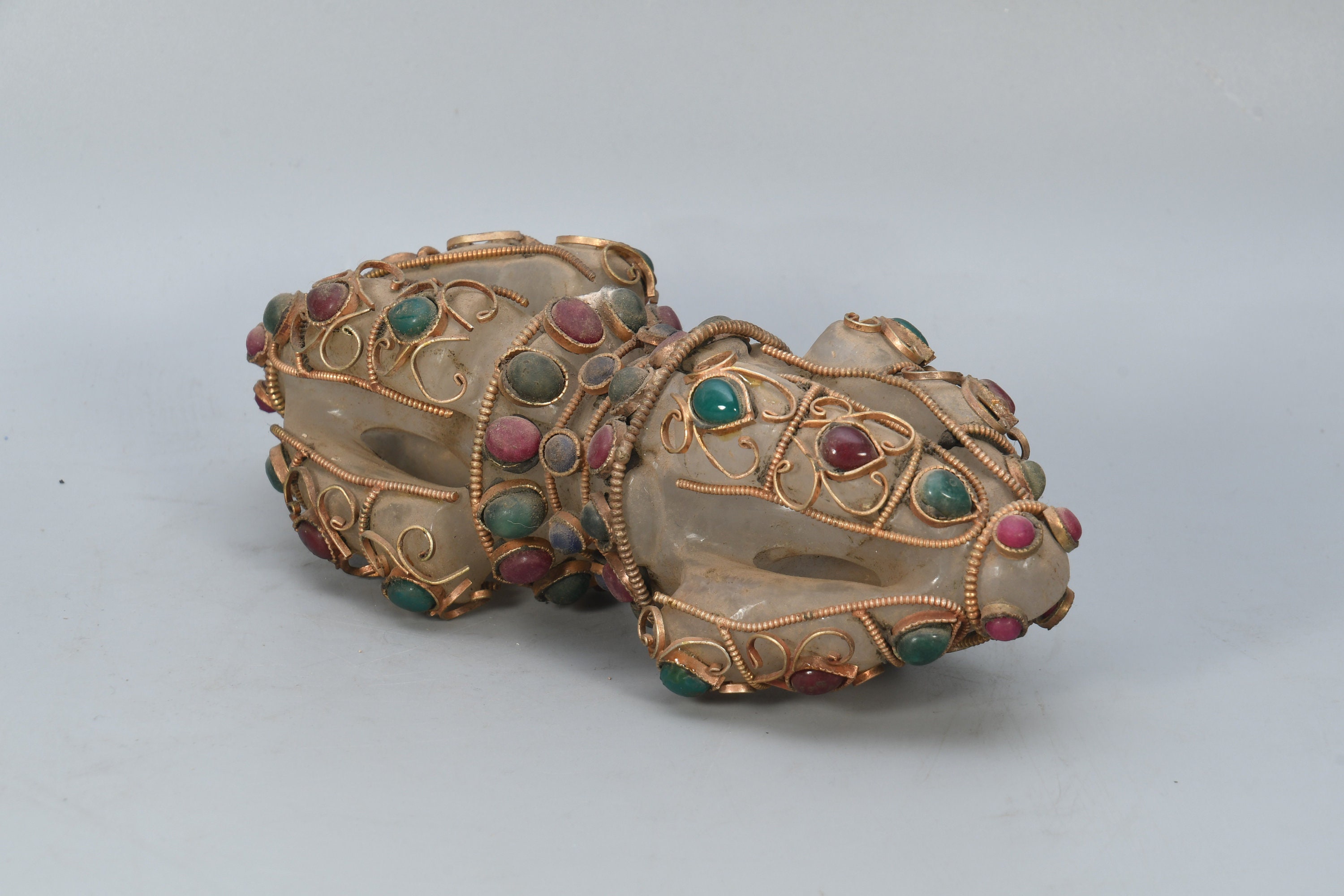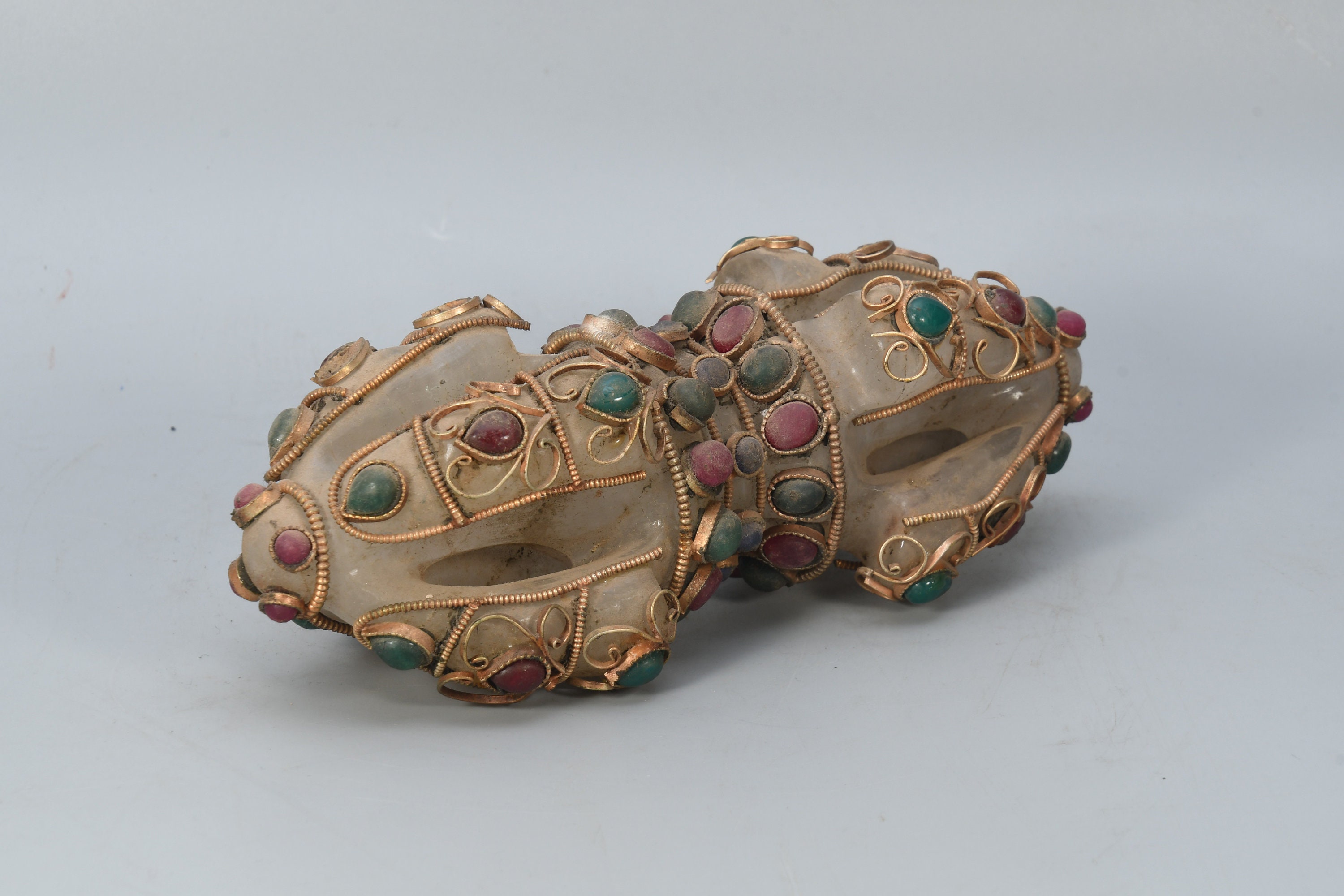 A Bajra is a ritual weapon symbolizing the properties of a diamond and a thunderbolt and is the Sanskrit word having both meanings. The Bajra is a club with a rubbed spherical head. The ribs may meet in a ball-shaped top, or they maybe separated and at the end in sharp points with which is used to stab. In the tantric traditions of Buddhism, the Bajra is a symbol for the nature of reality, or “sunyata”, indicating endless creativity, potentiality and skillful activity. In Hinduism the Bajra is the weapon of Lord Indra.