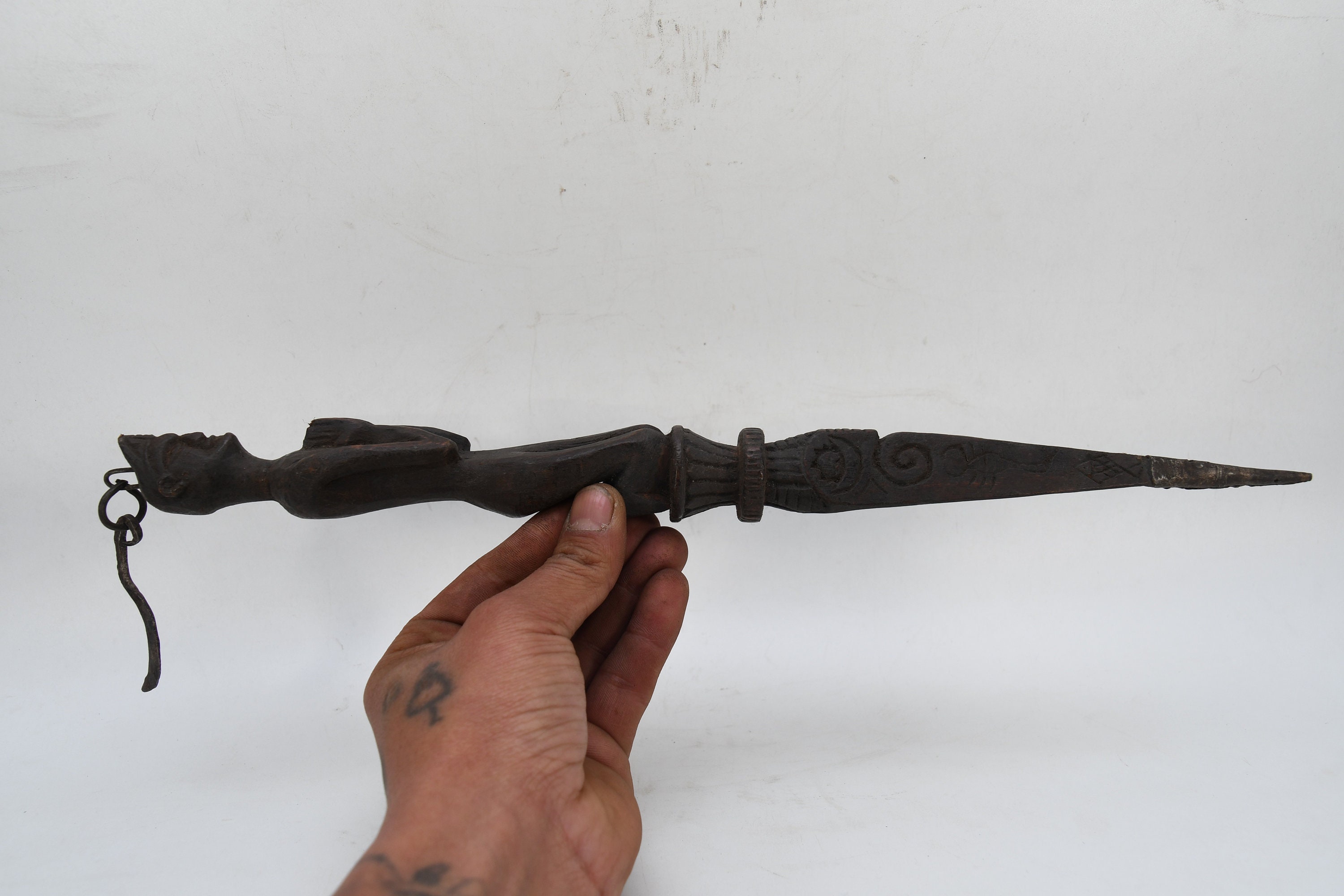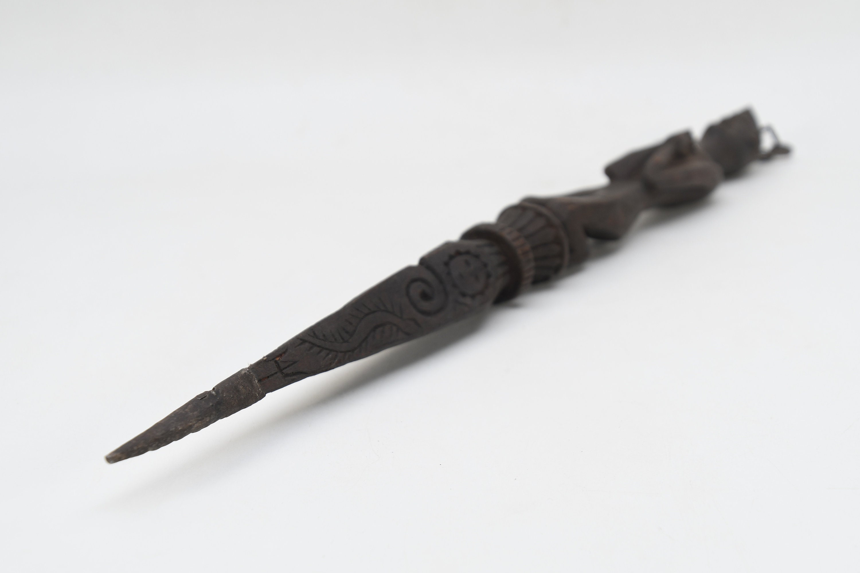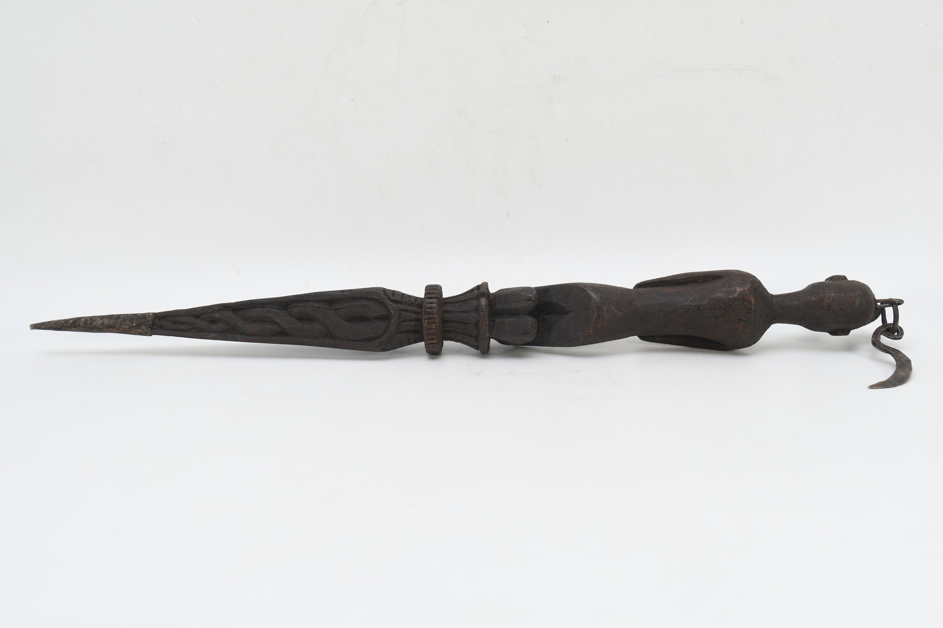 The phurba is also called 'the magic dagger'. 'Phur' is translated from the Sanskrit 'kila' which means peg or nail. The phurba is a three-sided stake that is used in Buddhist rituals.