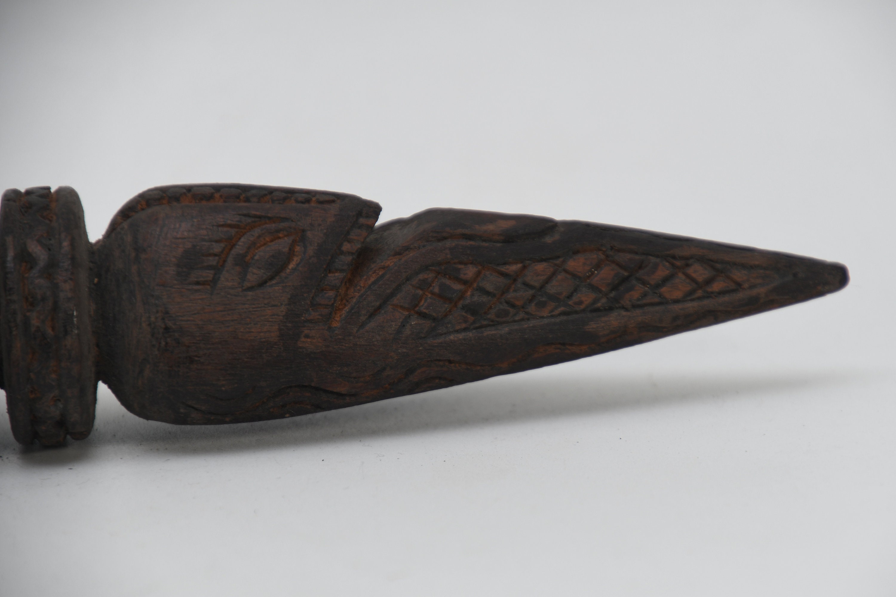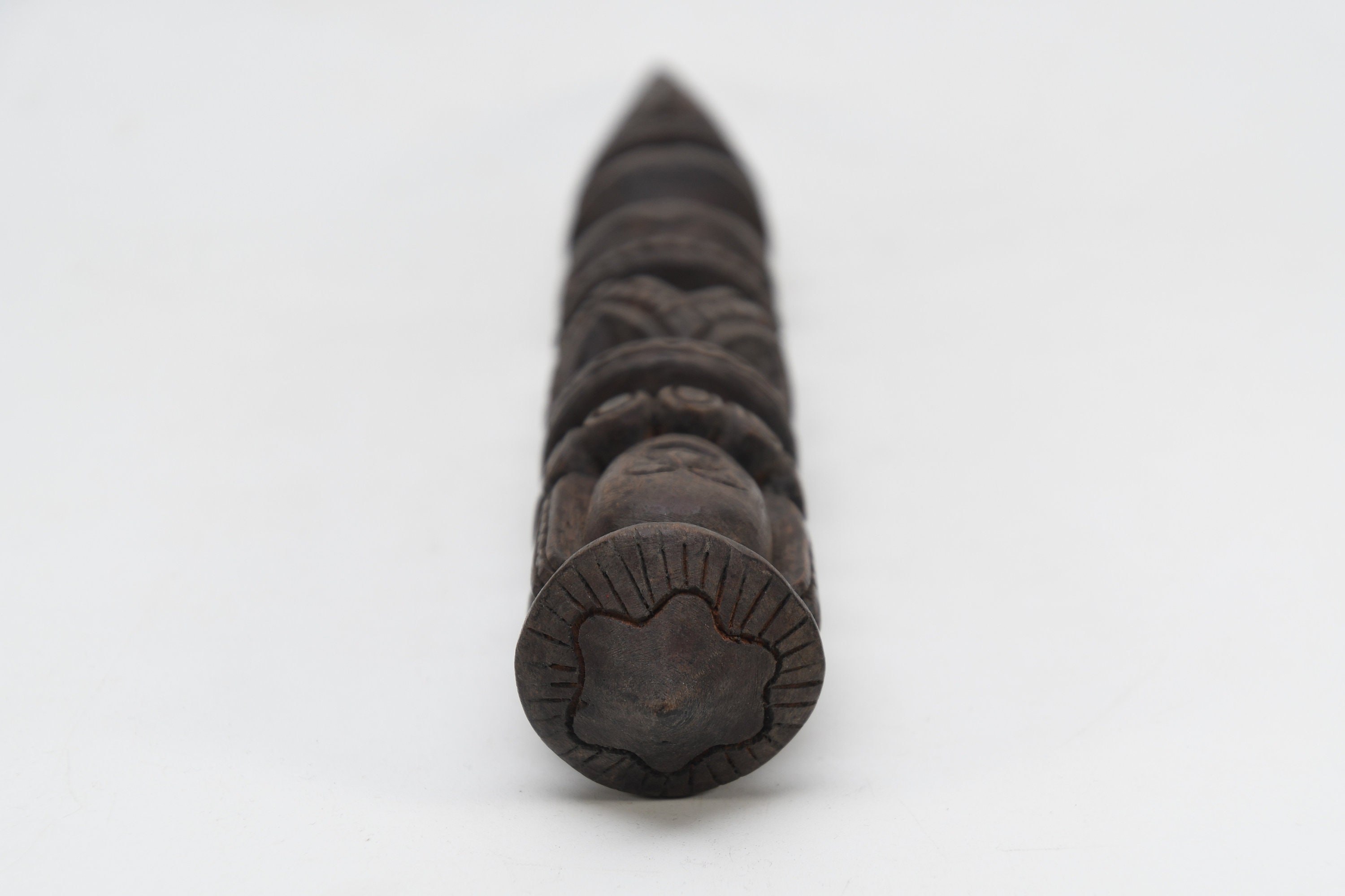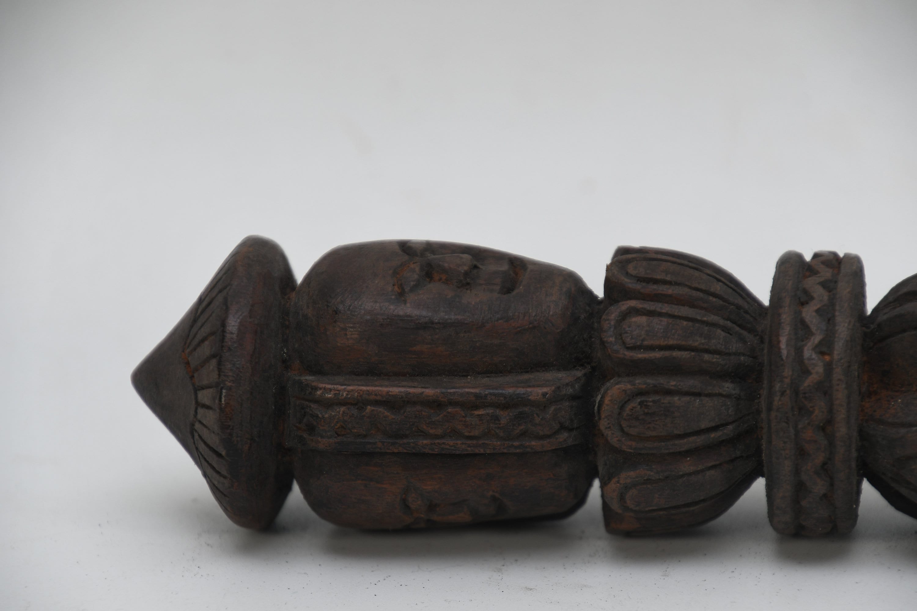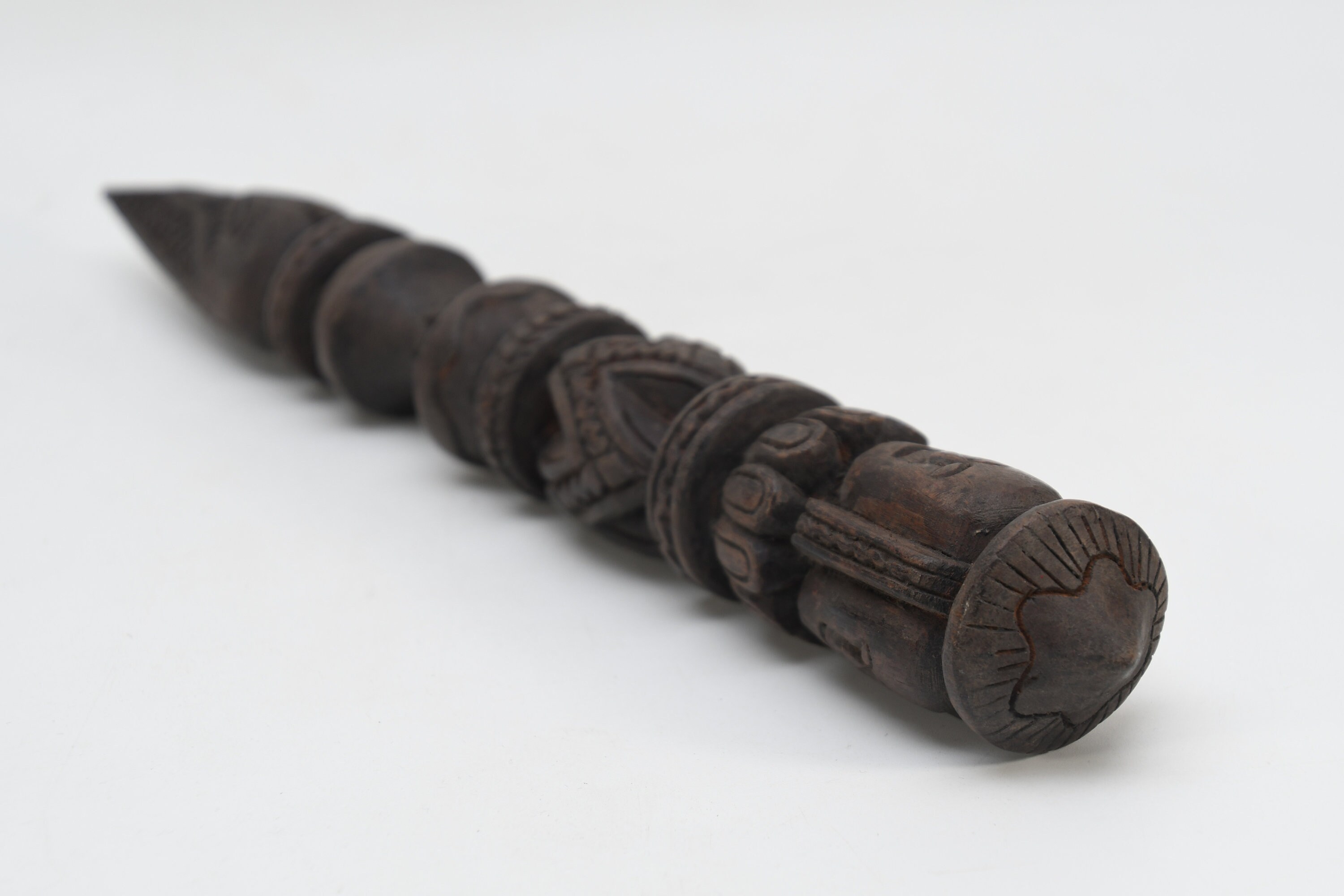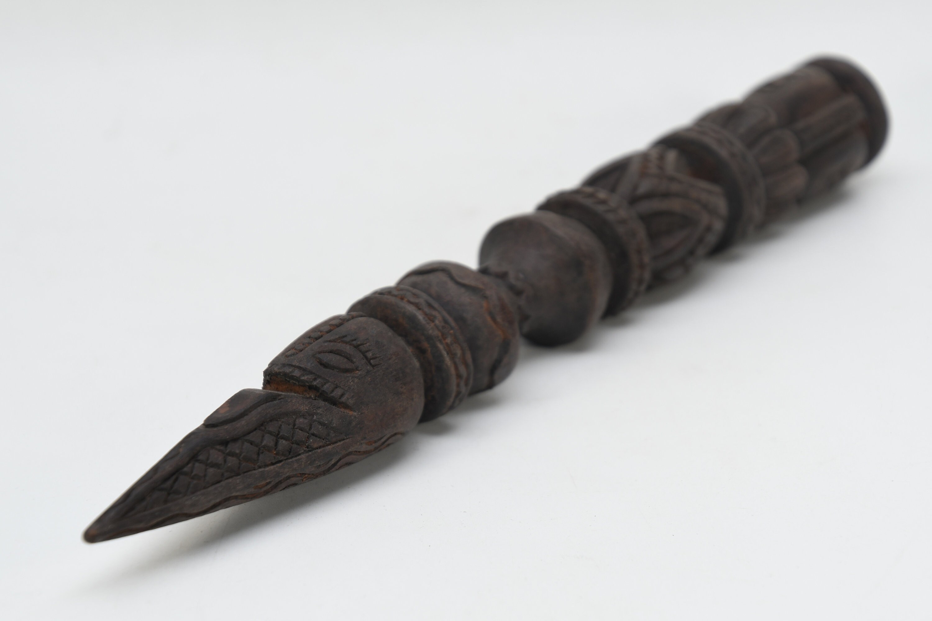 The three-sided style of the phurba comes from an ancient vedic tool. It has three segments on its blade, each representing the power of the phurba to transform negative energies. These energies are known as the 'three poisons,' and are attachment, ignorance, and aversion. The three sides of the phurba also represent the three spirit worlds, and the phurba itself represents the axis of the three spirit worlds. The handle of the phurba represents 'wisdom', while the blade represents 'method'.