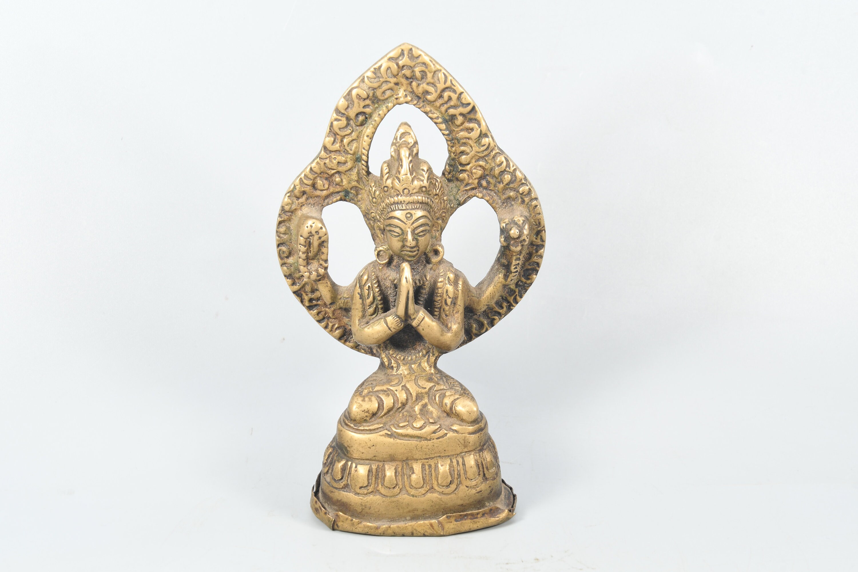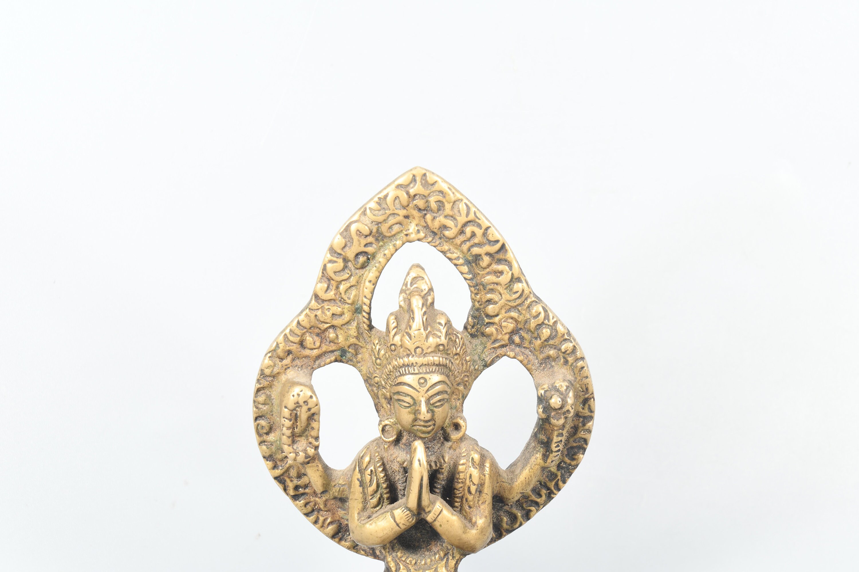 He is the earthly incarnation of the celestial Buddha Amitabha, and he guards our world during the interval between the historical Buddha, Shakyamuni, and the future Buddha, Maitreya. Chenrezig is universally cherished in all branches of Buddhism and is considered the patron Bodhisattva of Tibet. Even in non-Buddhist countries, most people are familiar with his mantra Om Mani Padme Hum. Chenrezig courageously vowed that so long as even one being remains caught in samsara, he will continue to work for the benefit of living creatures. His wisdom, compassion, and endurance know no bounds, and he is especially revered for granting realizations and spiritual attainments to those who meditate upon him.