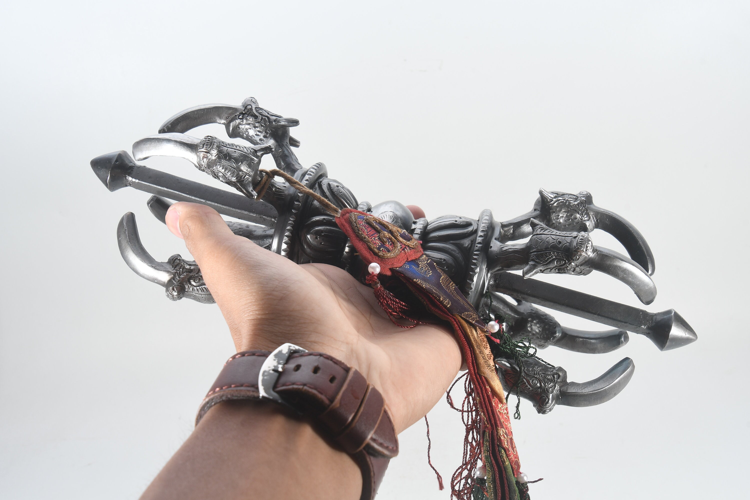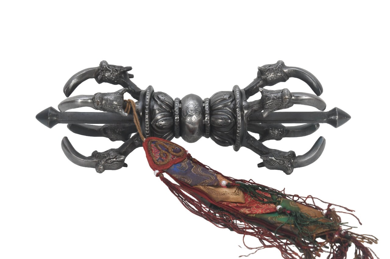 Vajra is a Sanskrit word meaning both thunderbolt and diamond. It is a weapon that is used as a ritual object to symbolize both the properties of a diamond (indestructibility) and a thunderbolt (irresistible force). The five-pronged vajra is the most commonly seen vajra.
