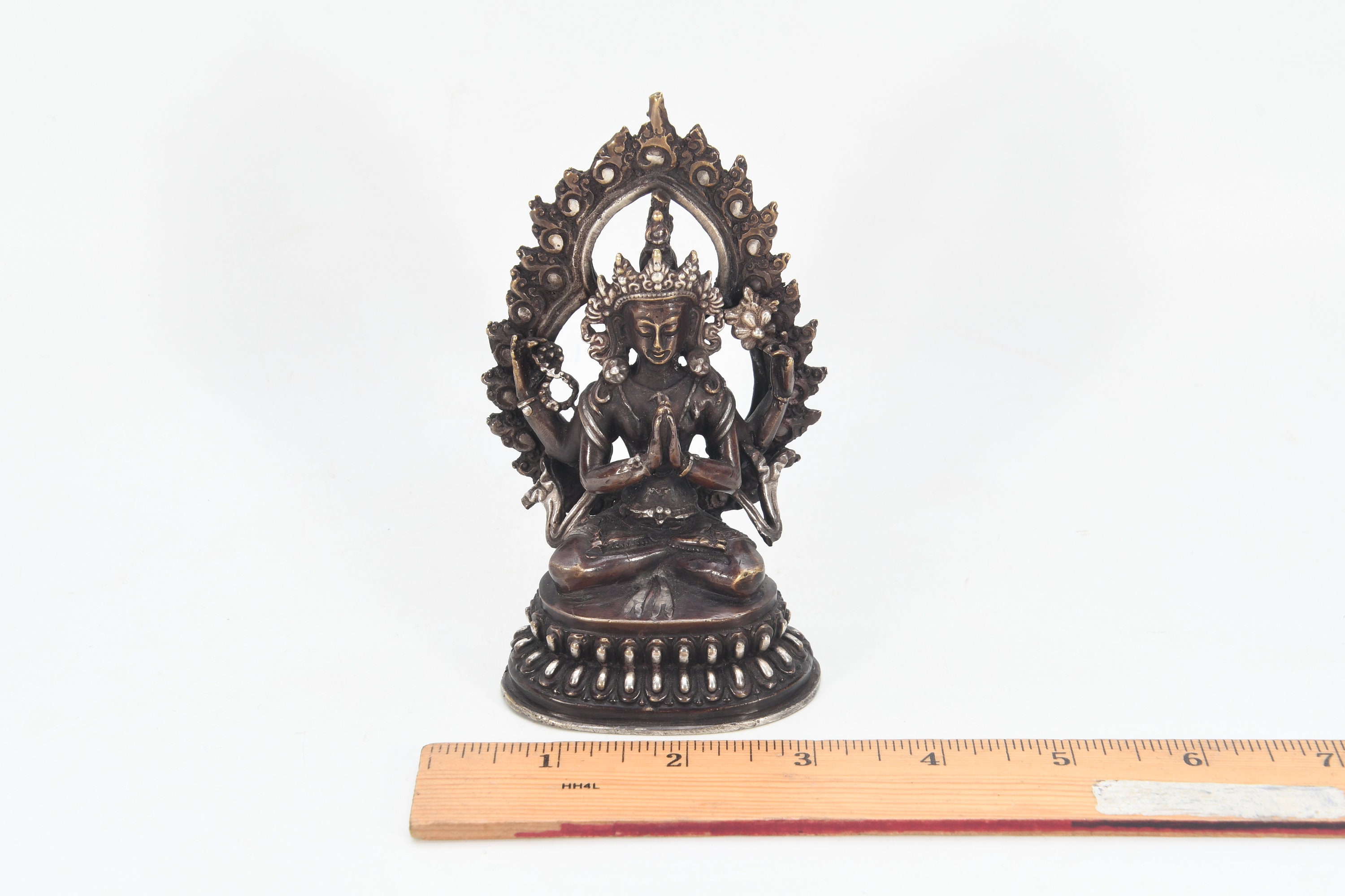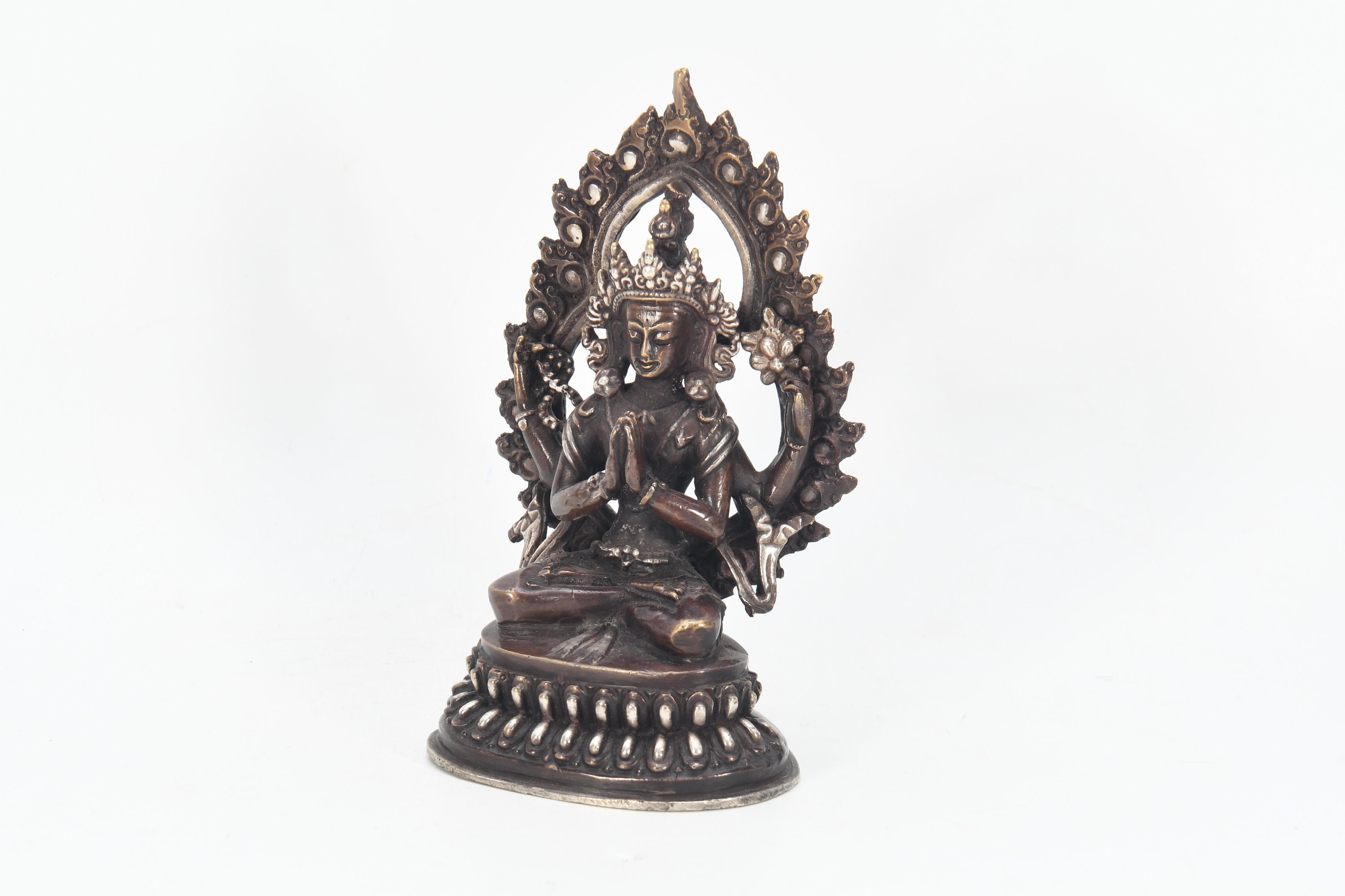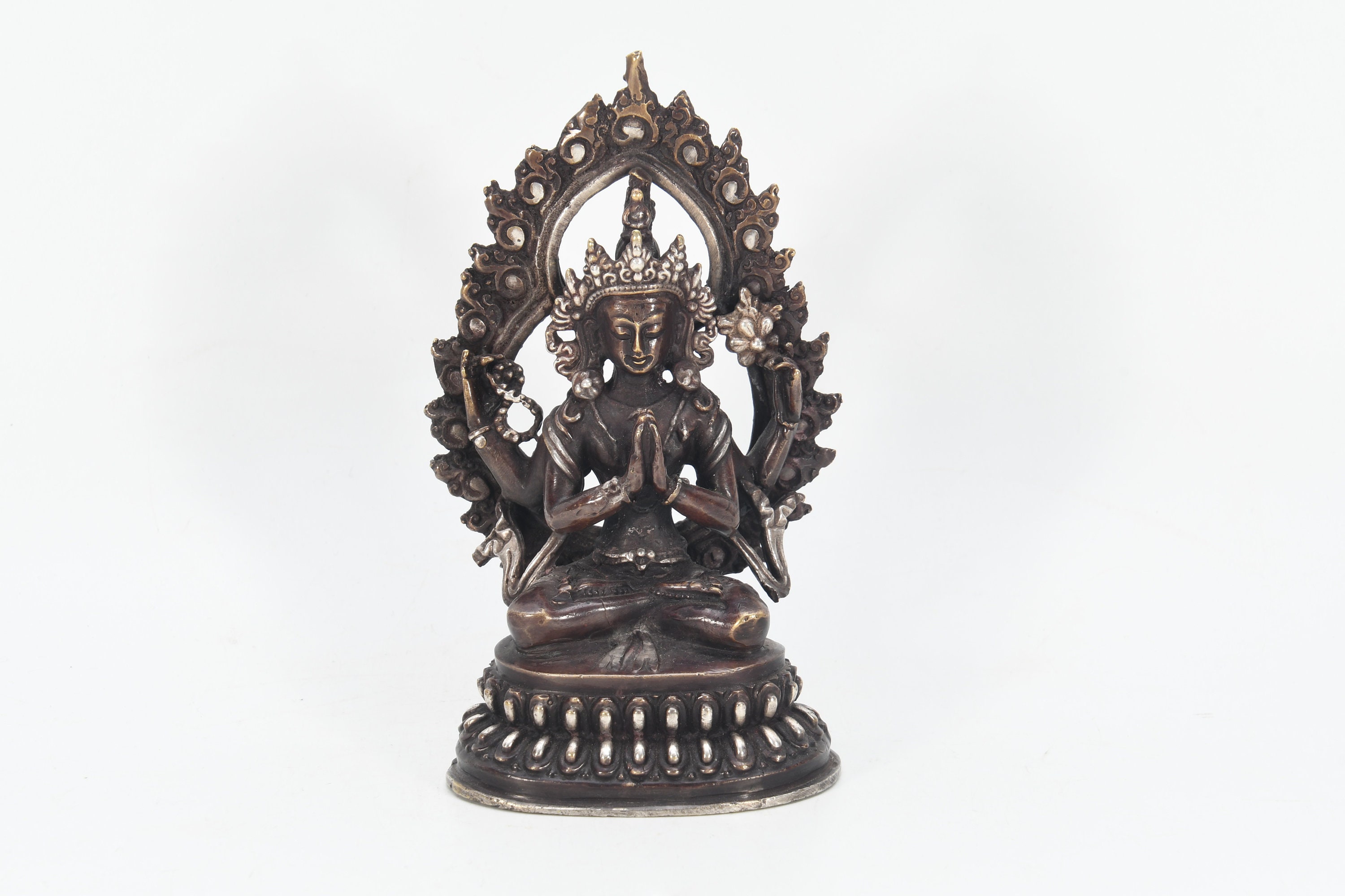 Chenrezig, also known as Avalokitesvara, "One who looks with unwavering eye," is the most revered of all Bodhisattva, embodying the compassion of all Buddhas. He listens to the prayers of all sentient beings in times of challenge and difficulty. In one prominent Buddhist story, Chenrezig vows never to rest until he has helped free all sentient beings from samsara, but despite his best efforts, his task is overwhelming. So in his effort to reach out to so many cries of suffering, his arms are shattered into pieces, making them many, to better reach out to those in need. Sometimes Chenrezig visualized with eleven heads and a thousand arms fanned out around him. Tibetan Buddhism relates Chenrezig to the six-syllable mantra, Om Mani Padme Hum, and when this mantra is spoken aloud or in silence, it invokes his benevolent power and intervention. Chenrezig is consider the patron of Tibet, and, in fact, the living Buddha, the Dali Lama, is an incarnation of him.