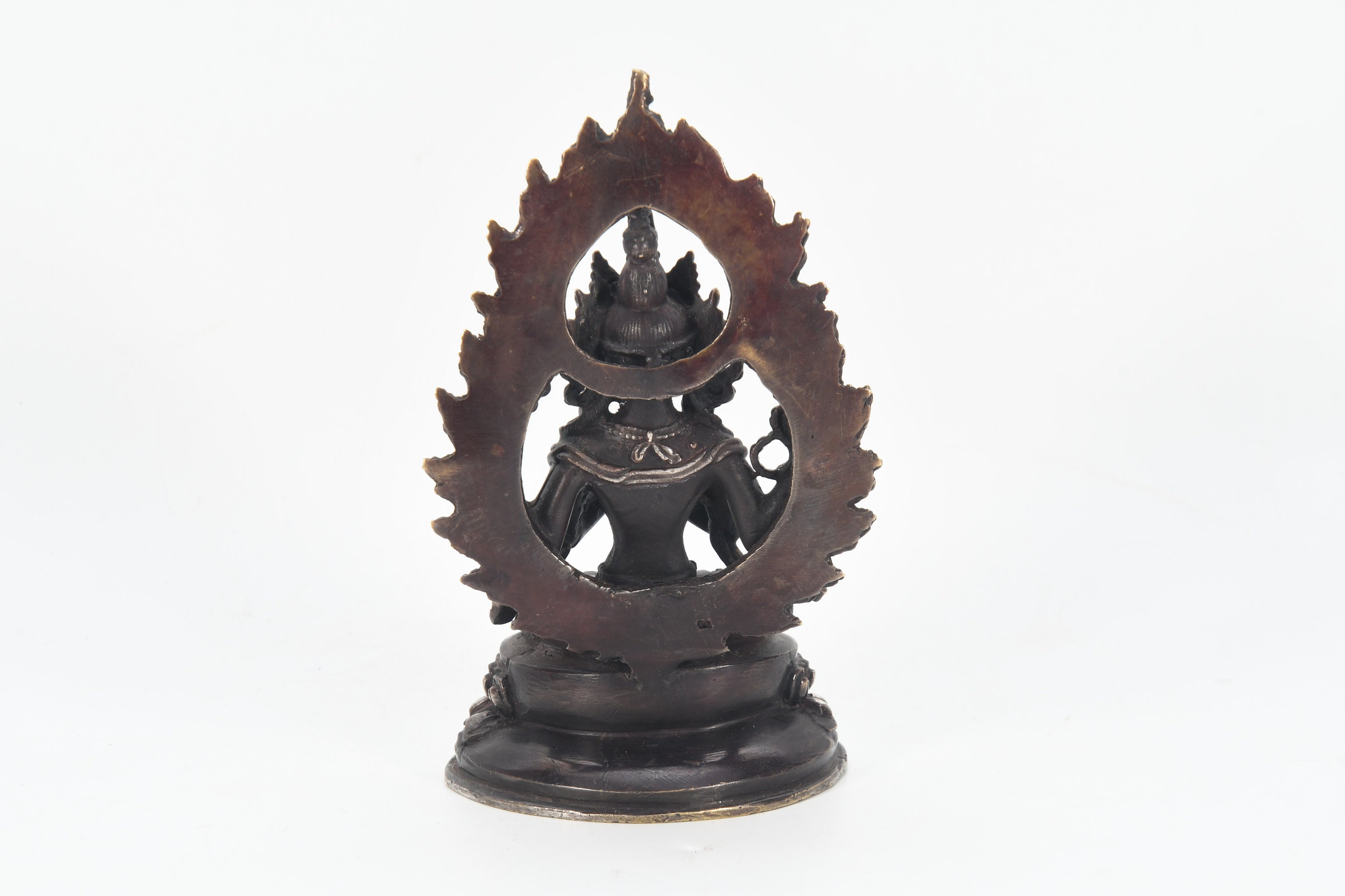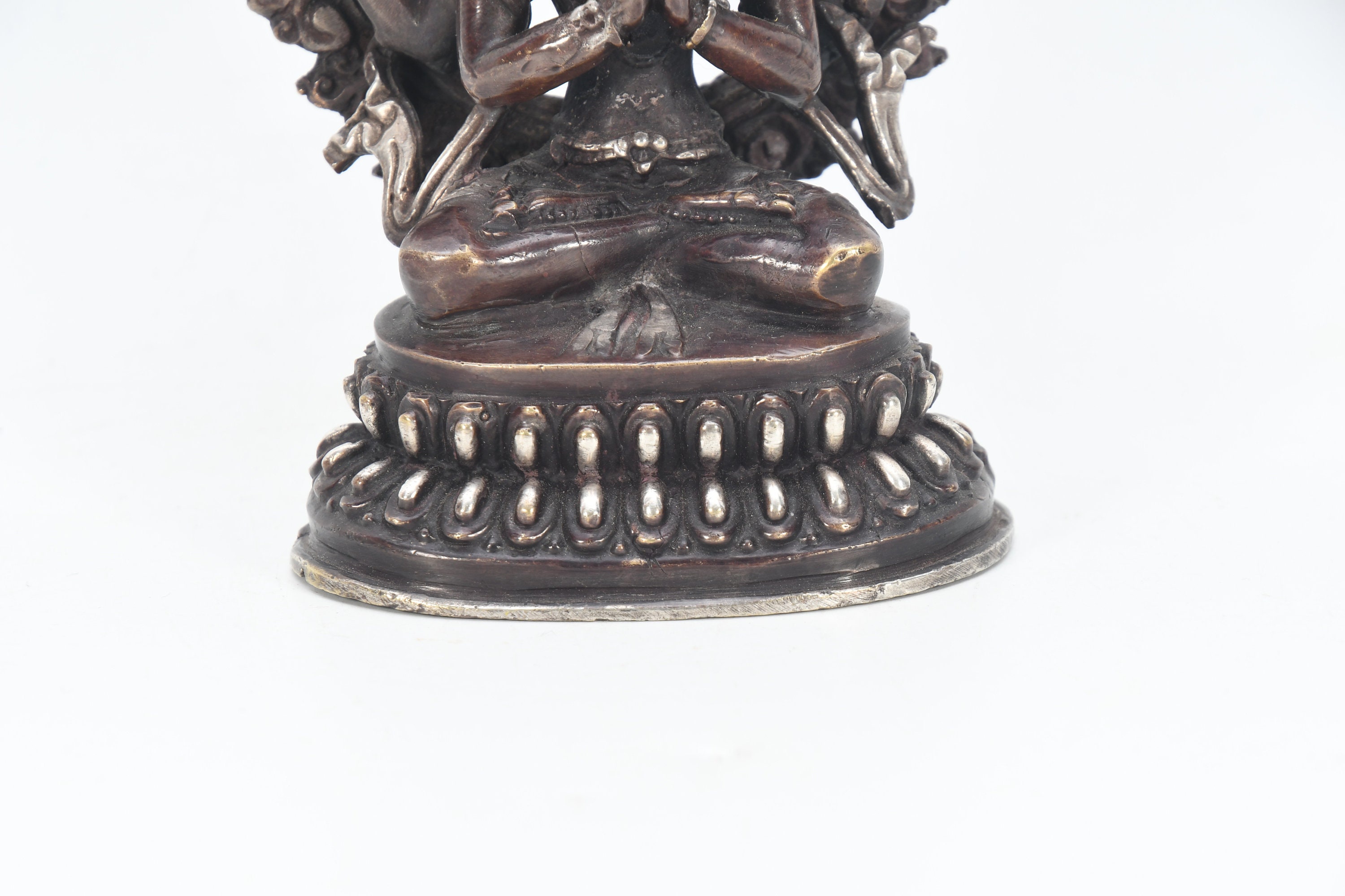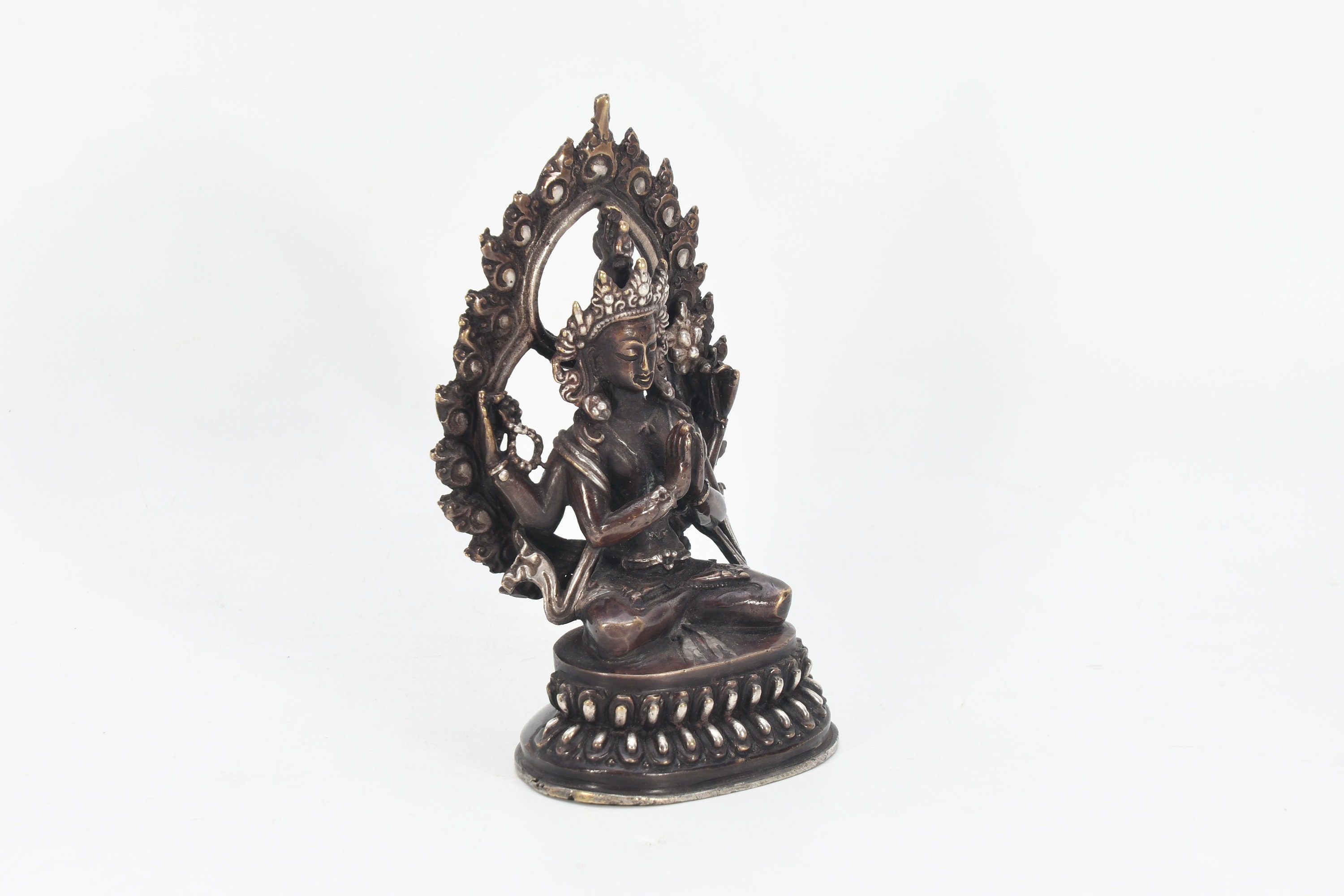 Chenrezig, also known as Avalokitesvara, "One who looks with unwavering eye," is the most revered of all Bodhisattva, embodying the compassion of all Buddhas. He listens to the prayers of all sentient beings in times of challenge and difficulty. In one prominent Buddhist story, Chenrezig vows never to rest until he has helped free all sentient beings from samsara, but despite his best efforts, his task is overwhelming. So in his effort to reach out to so many cries of suffering, his arms are shattered into pieces, making them many, to better reach out to those in need. Sometimes Chenrezig visualized with eleven heads and a thousand arms fanned out around him. Tibetan Buddhism relates Chenrezig to the six-syllable mantra, Om Mani Padme Hum, and when this mantra is spoken aloud or in silence, it invokes his benevolent power and intervention. Chenrezig is consider the patron of Tibet, and, in fact, the living Buddha, the Dali Lama, is an incarnation of him.