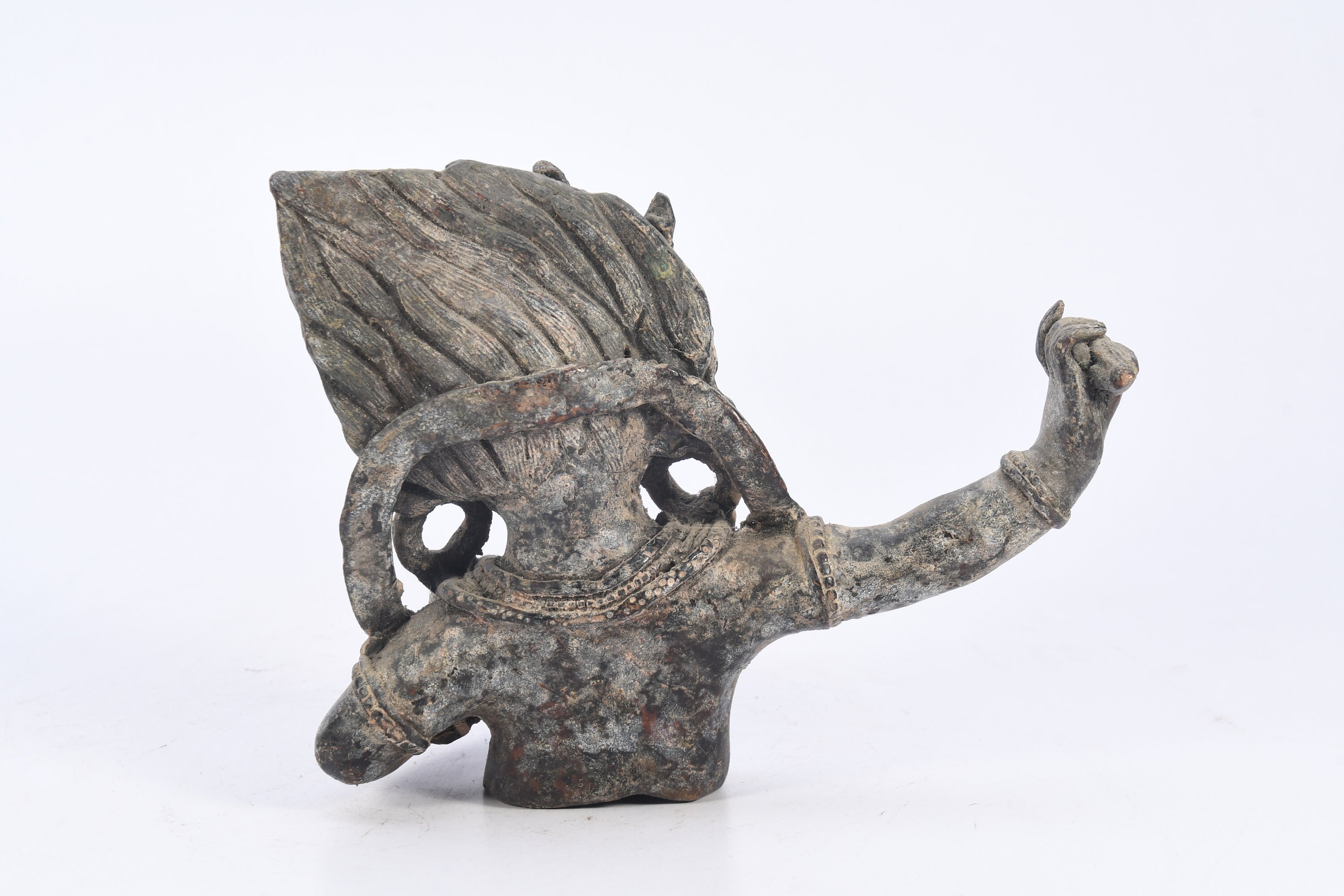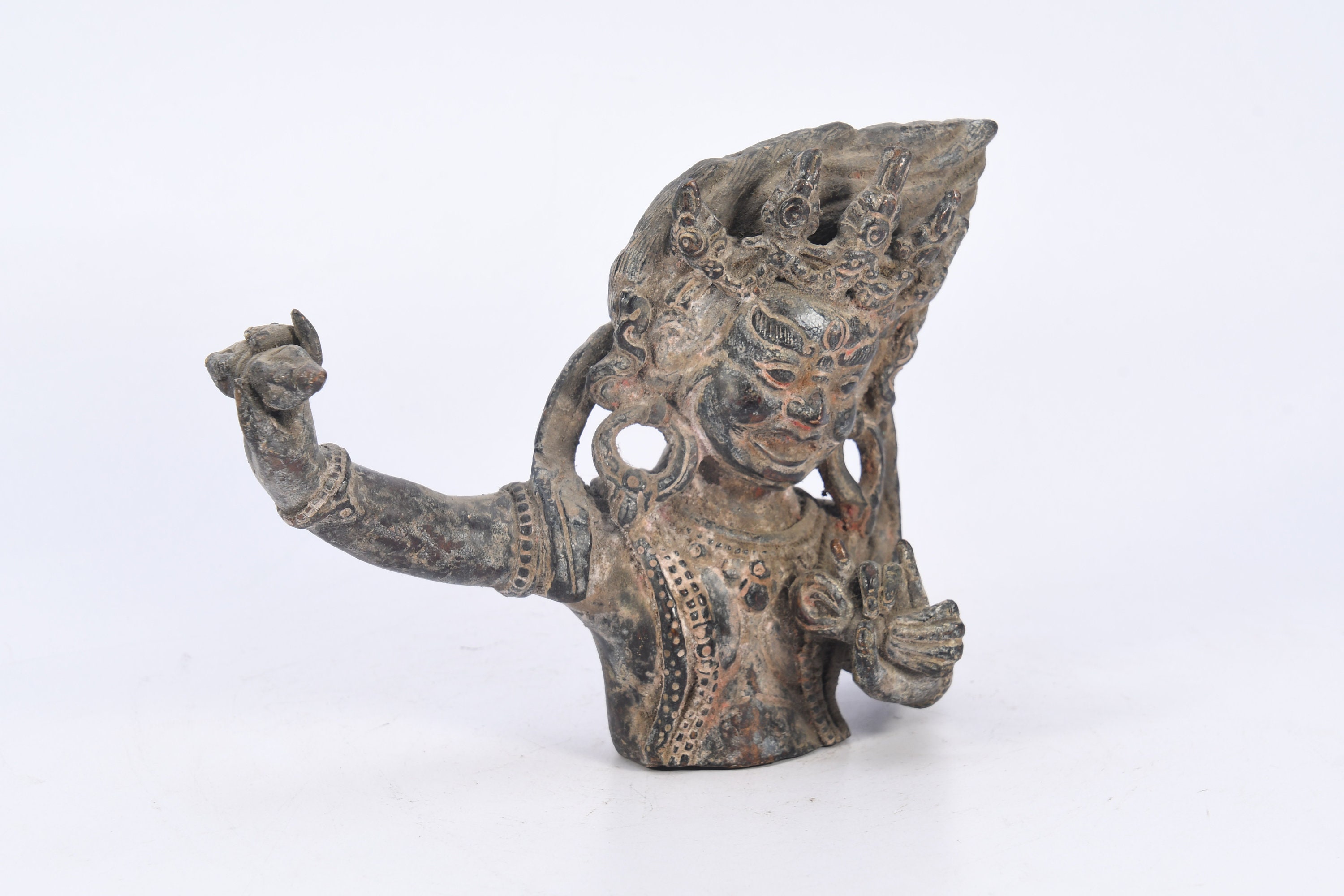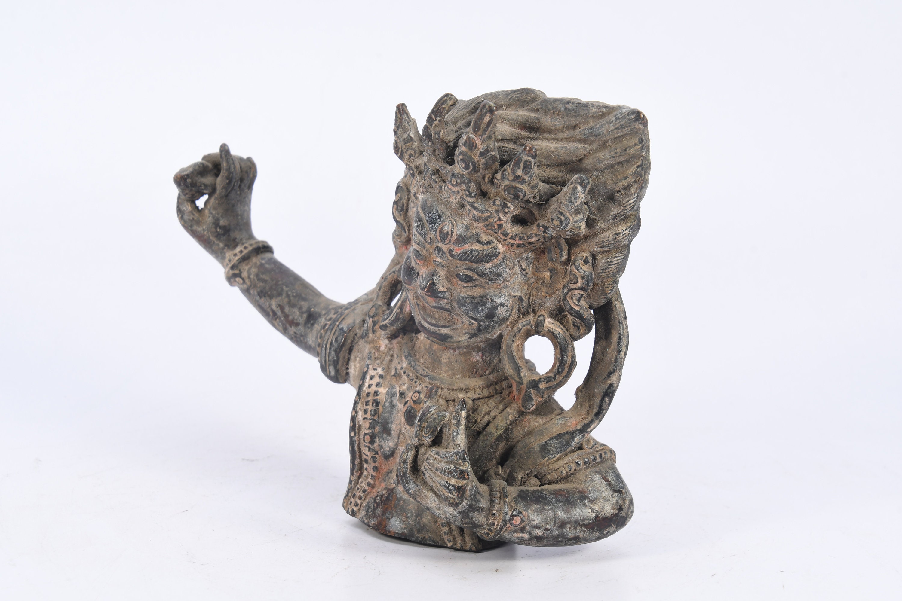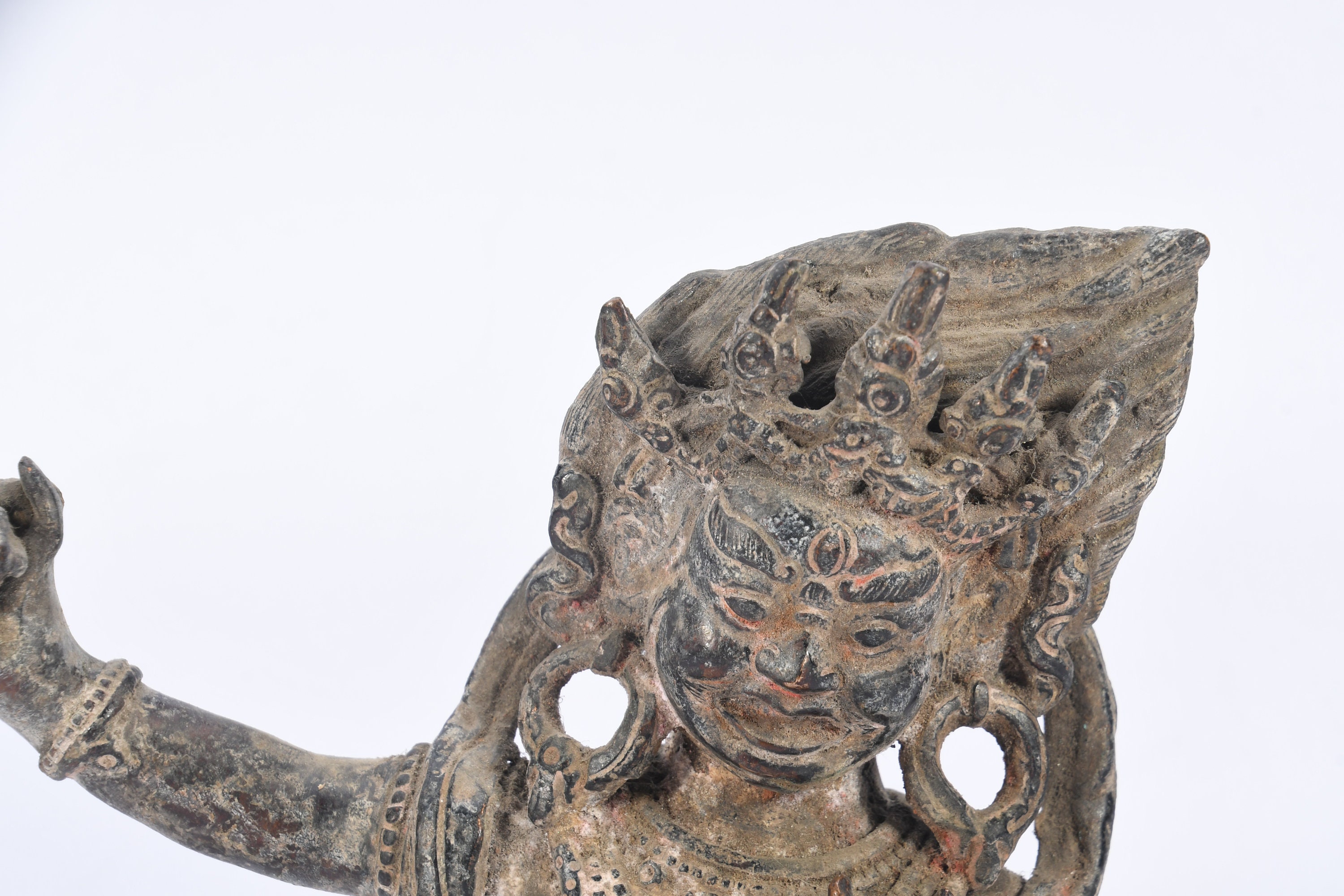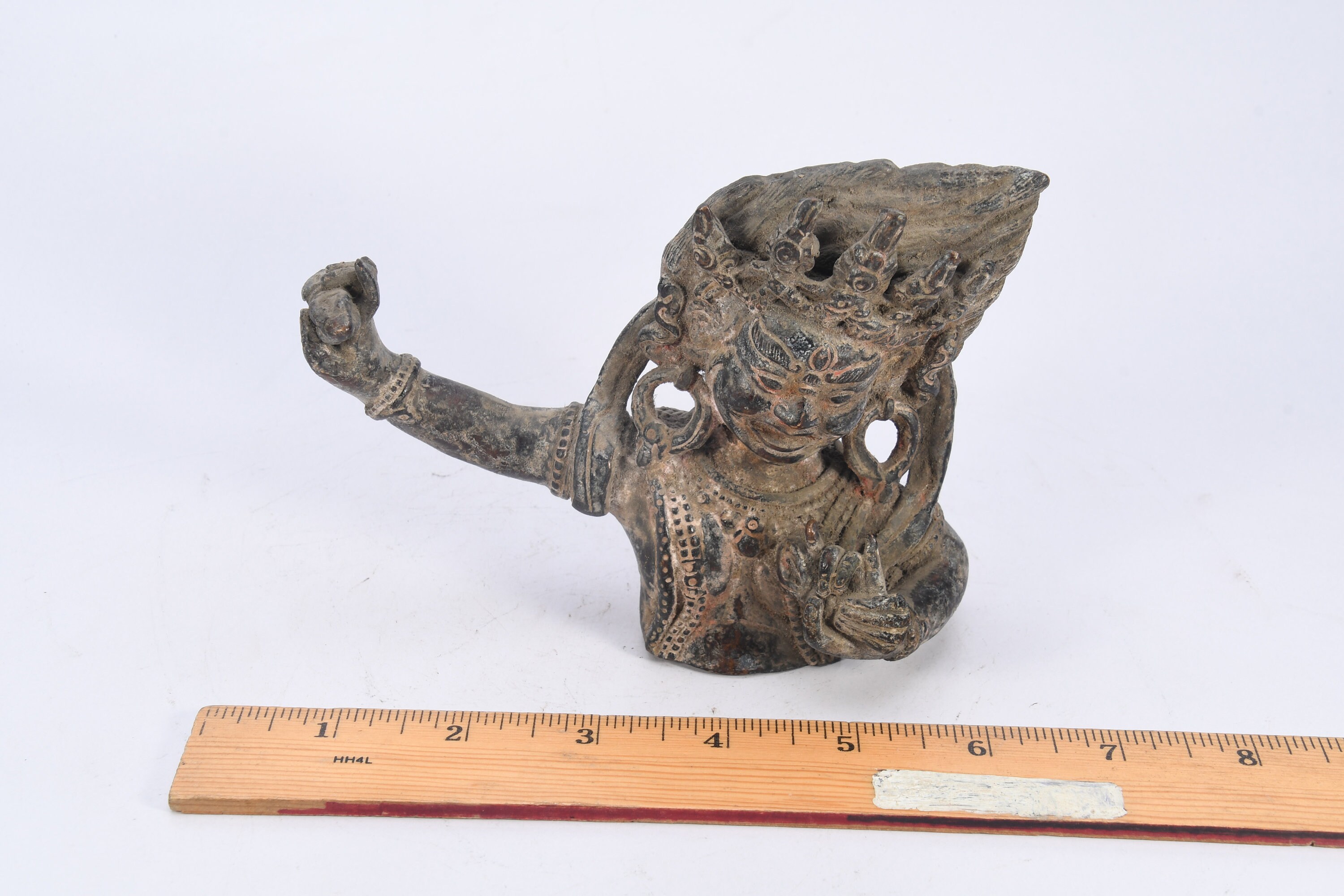 This particular form of Mahakala, with one face, two hands, holding a curved knife, a skull-cup at his heart and a khatvanga in the hollow of his left elbow, his two legs standing on a corpse, is of outstanding workmanship.