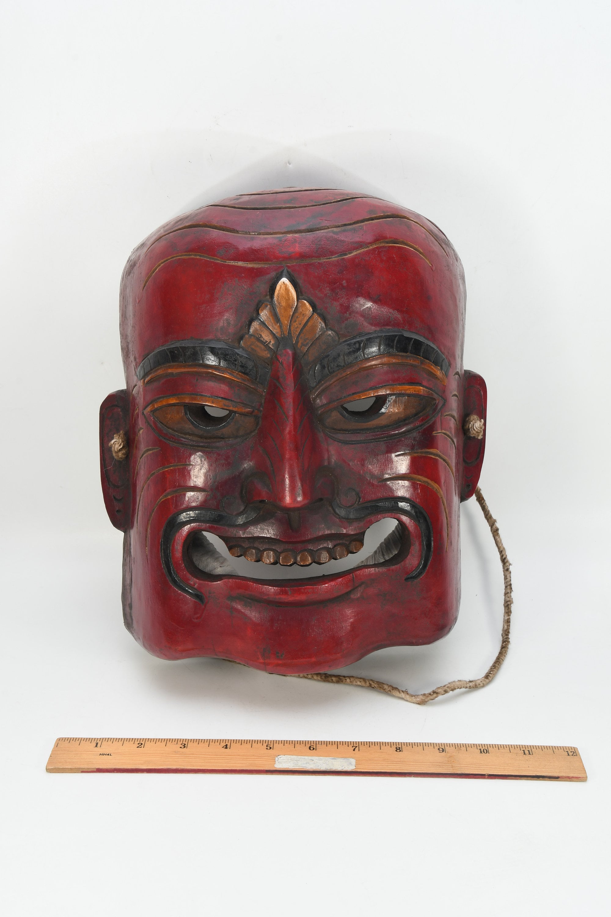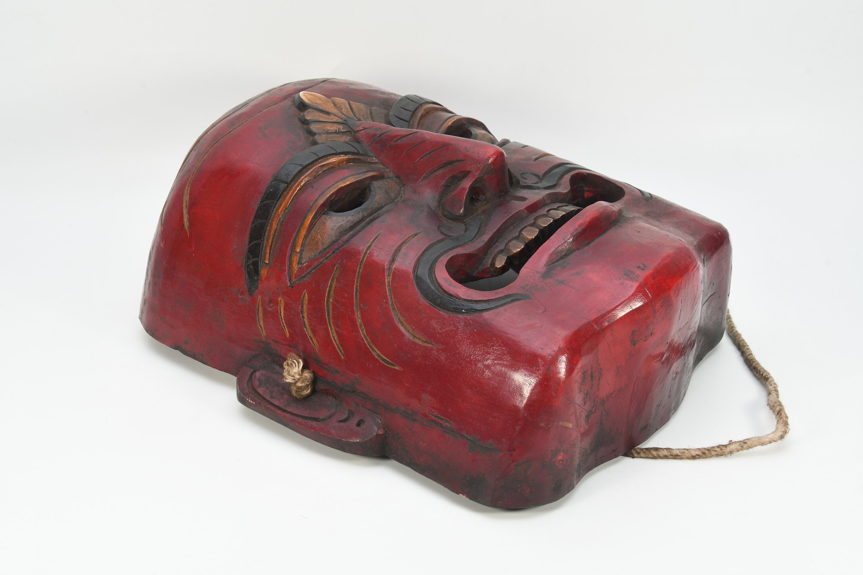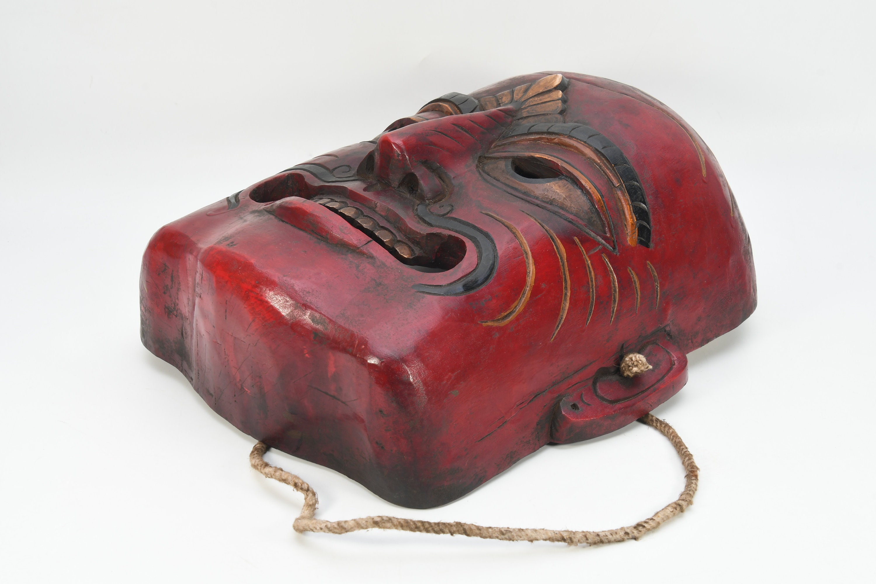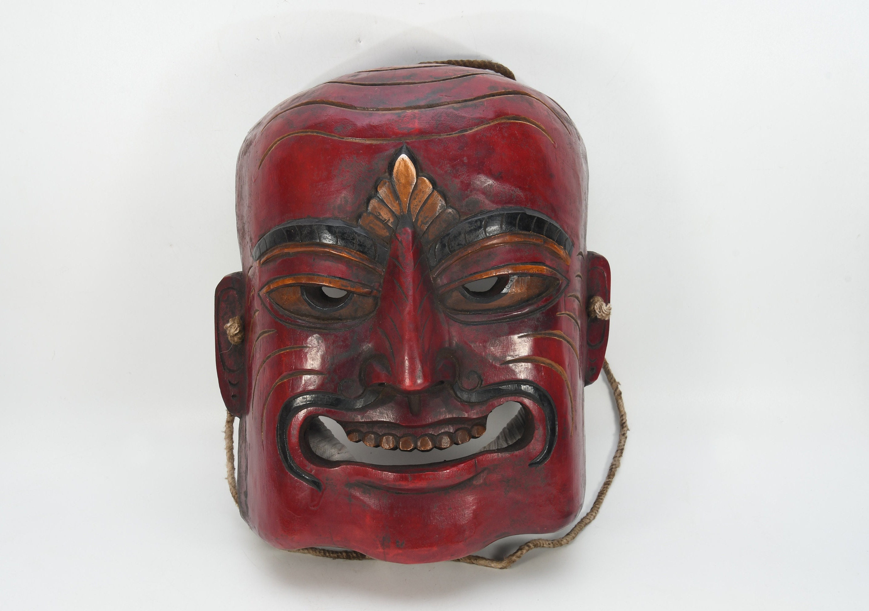 A few words about tribal masks. They have been very little studied. Most of the masks are made of wood and are of human dimensions. In contrast with classical masks, the tribal mask maker it seems had more liberty of expression and could use his imagination more freely. The masks of the Magar and Gurung tribes are of hardwood covered with a glossy, high patina from exposure to smoke and butter fat. Masks of the lowland Tharu people are often of a softer wood, pigmented with polychrome or white kaolin clay. The Rai people are known to make house-protecting masks from tree fungus while some other masks are created from felt and goat skin.