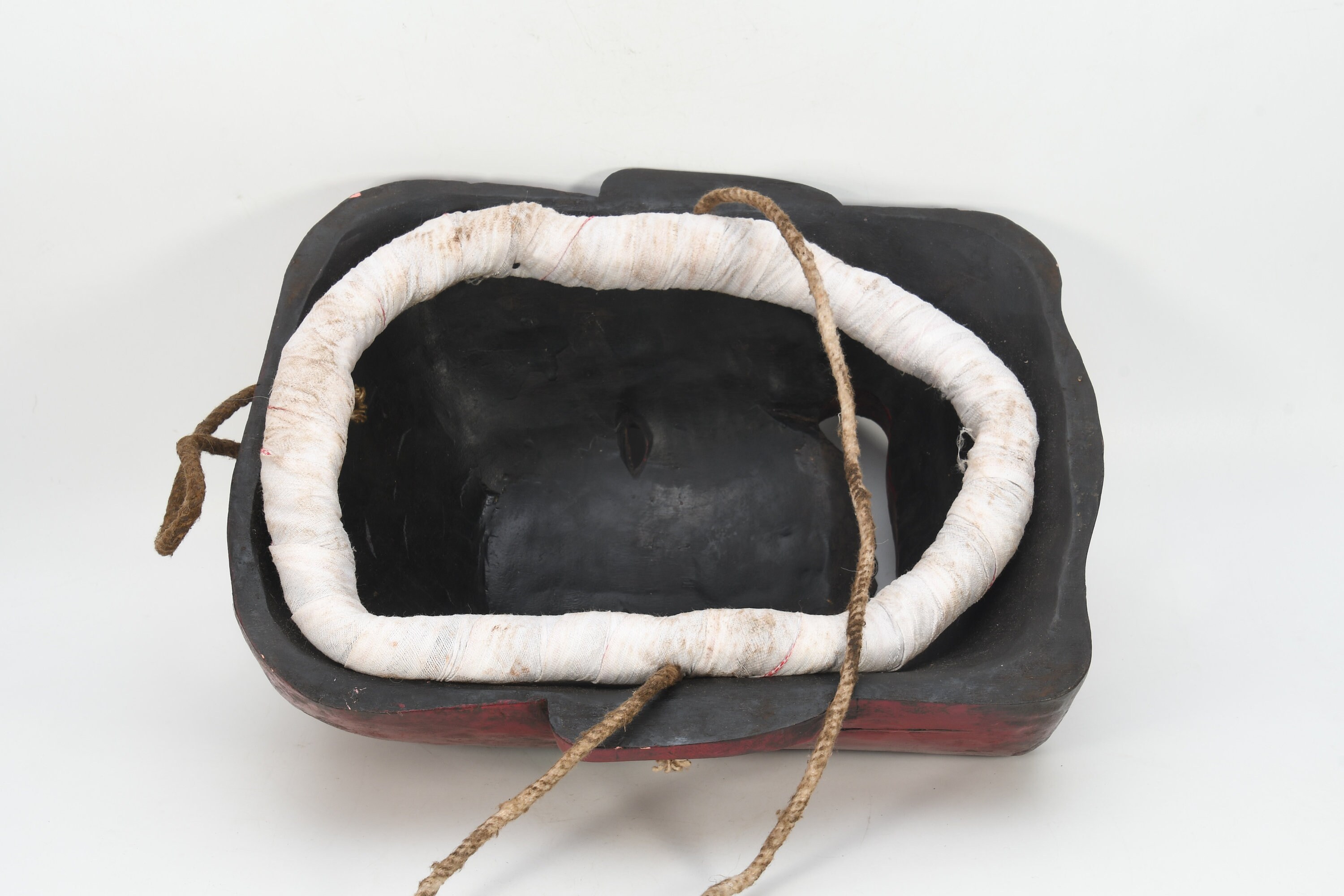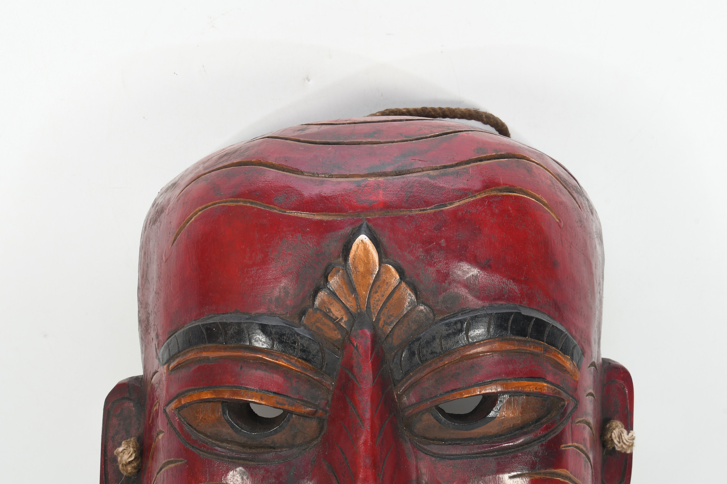 The masks are made of clay mixed with bits of cotton and a gum-like paste made from wheat-flour. The clay mask forms are left to dry on the moulds for about four days. Later the masks are painted. Each colour has a certain significance: red is associated with anger, blue black with energy and power, white with purity and death. Previously only vegetable and mineral colours were used. Now the painters use mainly chemical colours. All the masks have a "third eye", a mark on the forehead, and head-gears. It can be large earrings, a crown, hair nets or a head-band. Masks are considered lifeless until ceremonies of consecration and installation are performed.