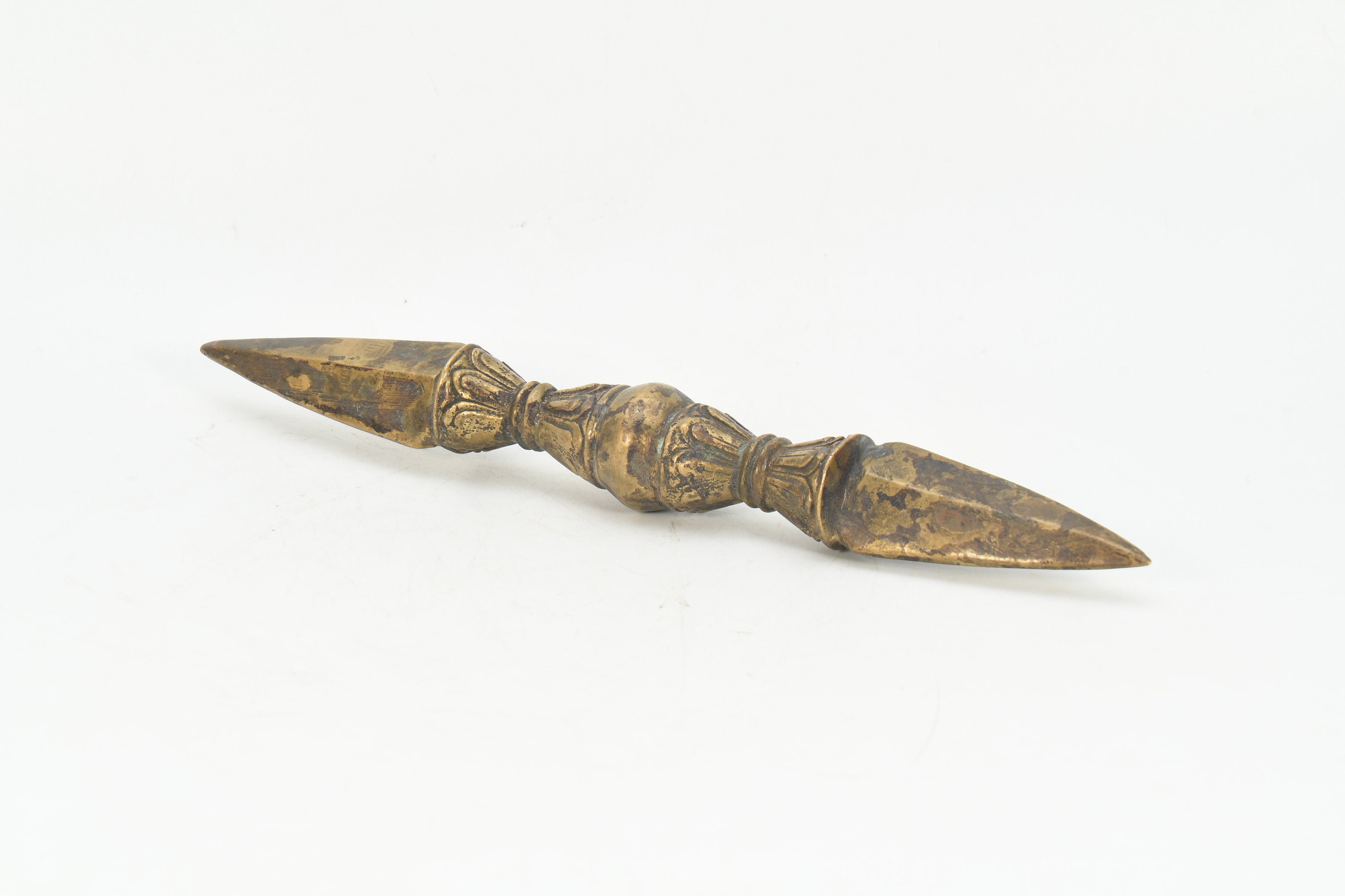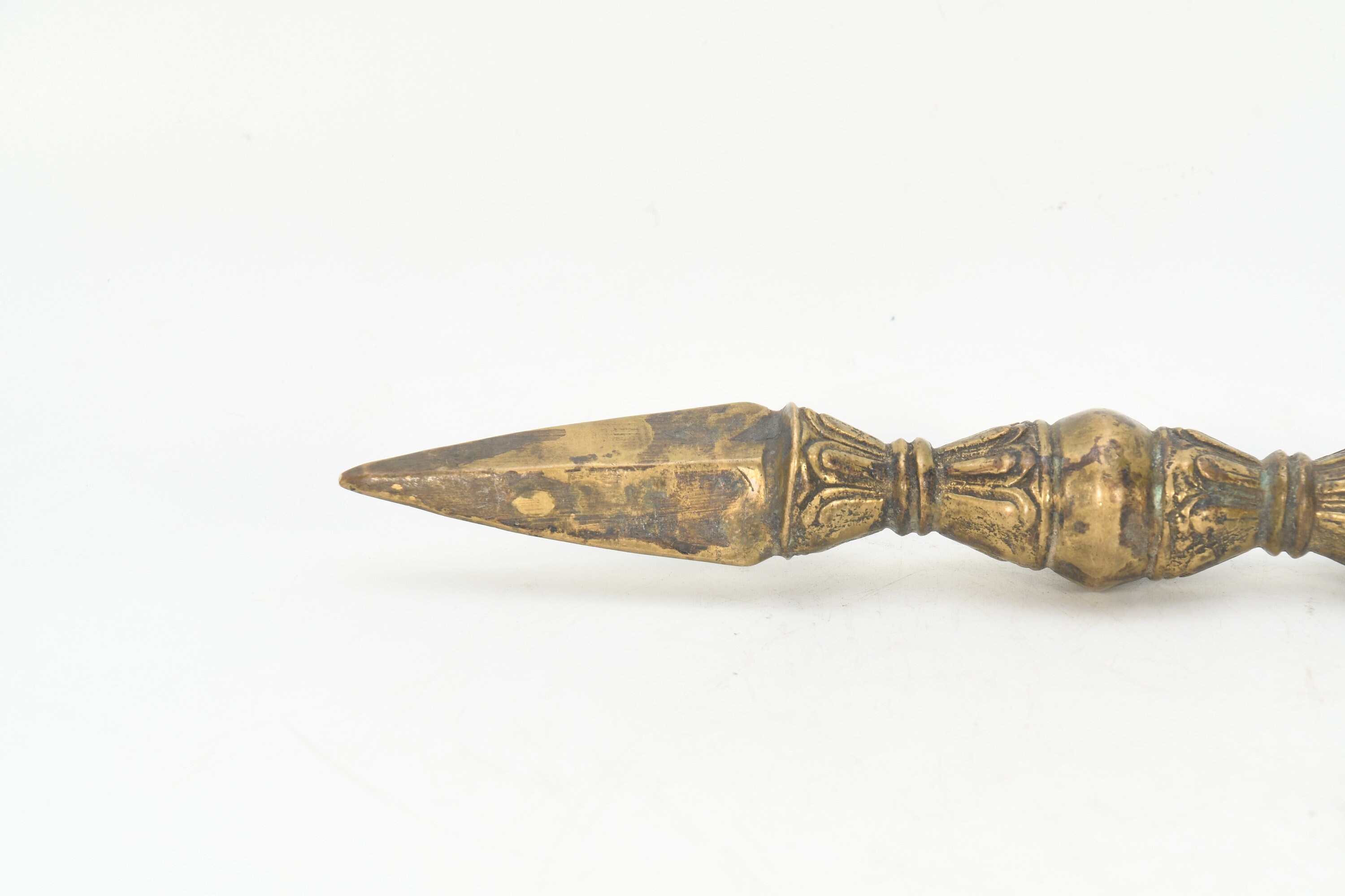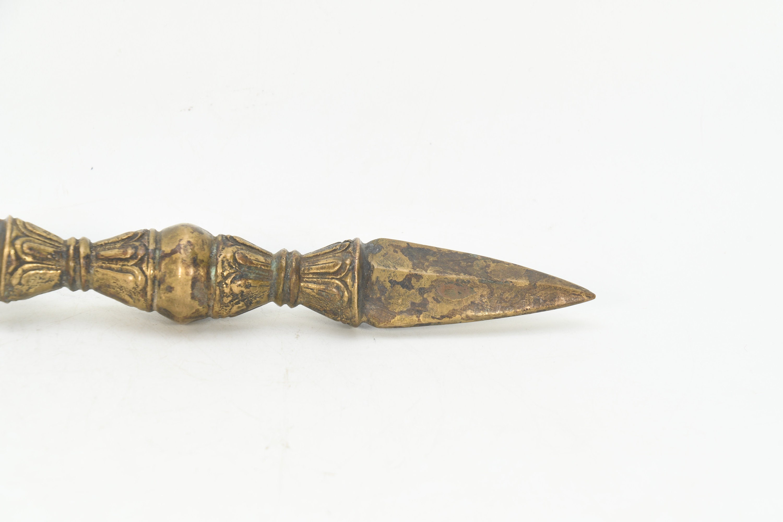 The phurba is also called 'the magic dagger'. 'Phur' is translated from the Sanskrit 'kila' which means peg or nail. The phurba is a three-sided stake that is used in Buddhist rituals.