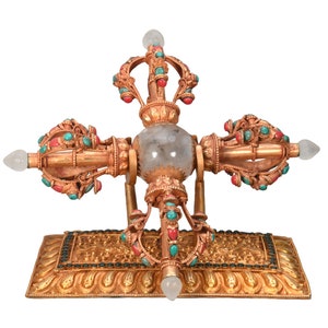This Vajra is to be used during empowerments. Usually needs two Vajras, one for the Mandala which is tied to the Sung-Tak with five colored cord and the second one for the Vajra Master. Sanskrit word vajra or Dorje in tibetan is defined as "diamond" or "adamantine". As such, the word vajra sometimes signifies enlightenment, or the absolute reality of shunyata, emptiness. Dorje offers protection and envokes blessings.