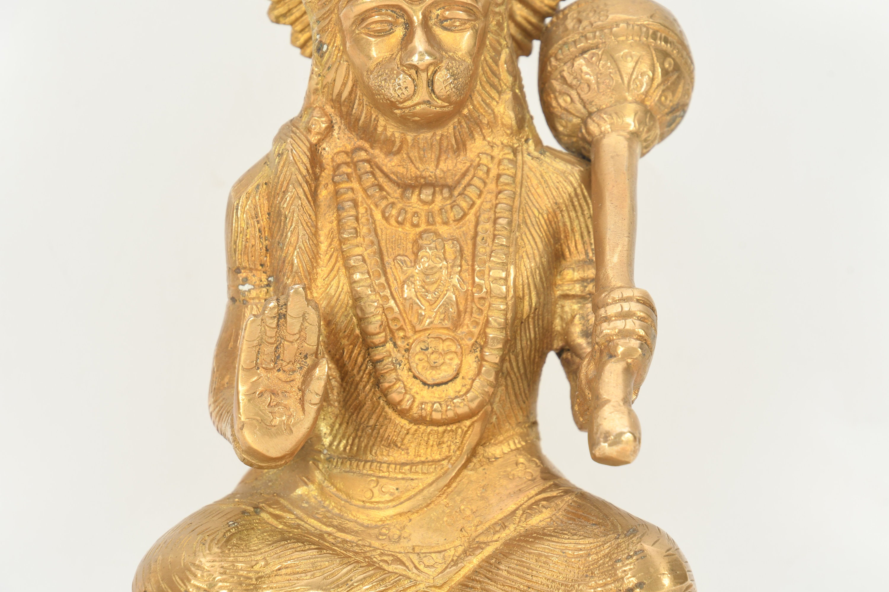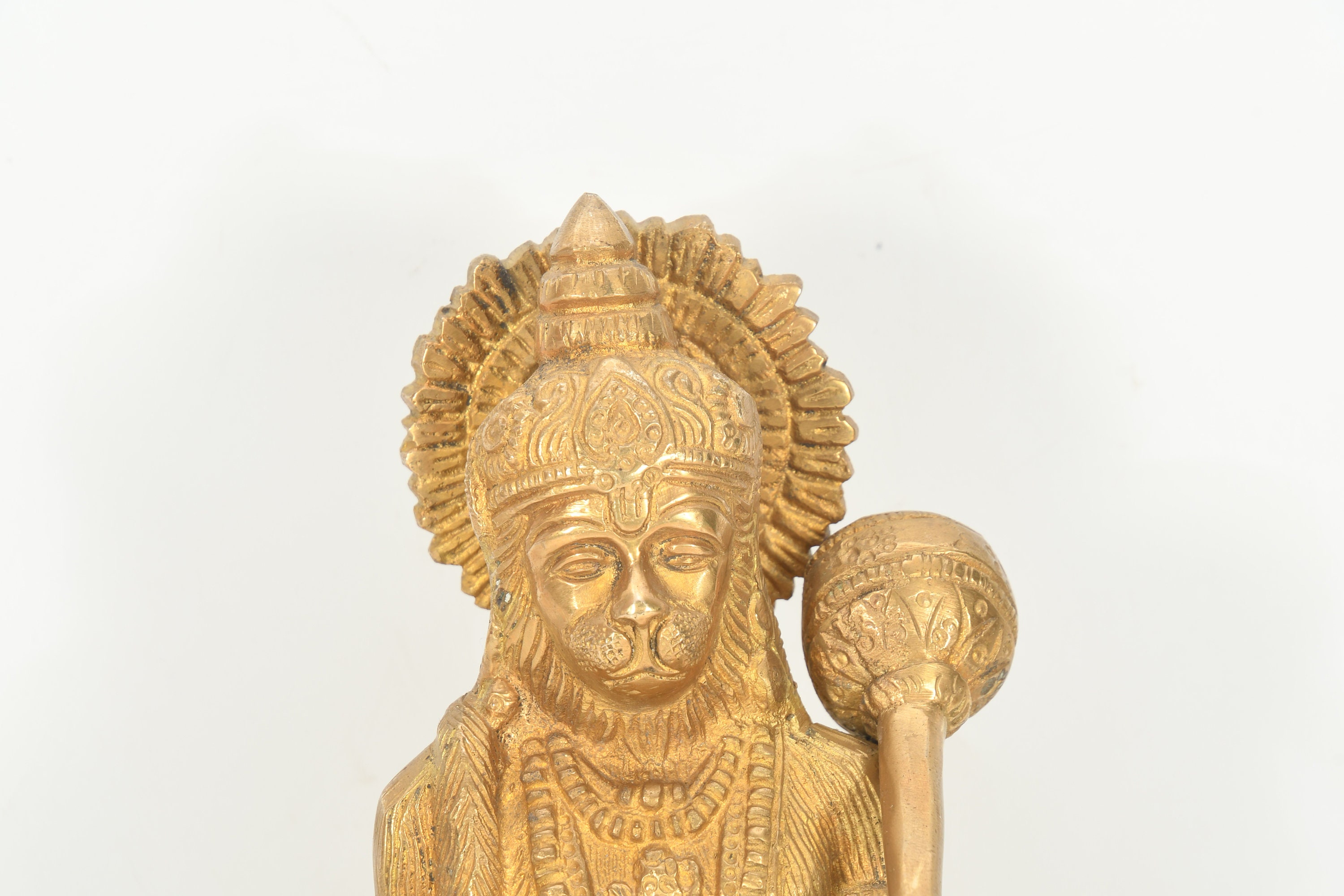 According to Hindu mythology, Hanuman is the son of the wind god Vayu and is also known as Anjaneya. He is depicted as a monkey or a humanoid figure with the face of a monkey, and is often shown carrying a mace and a flag with the image of Lord Rama.