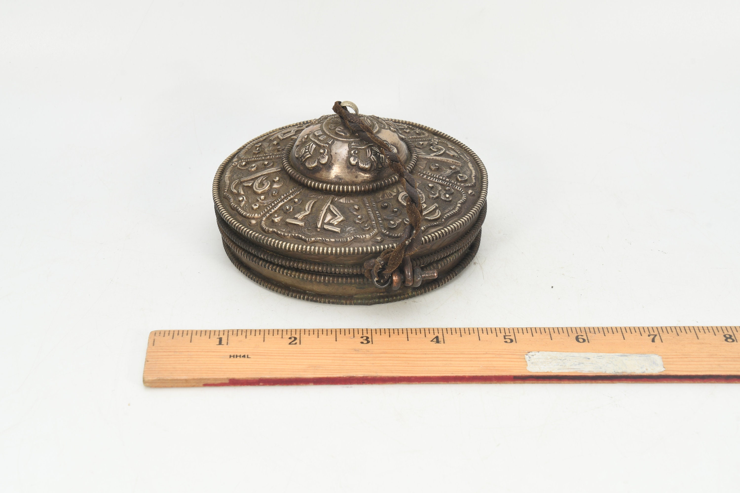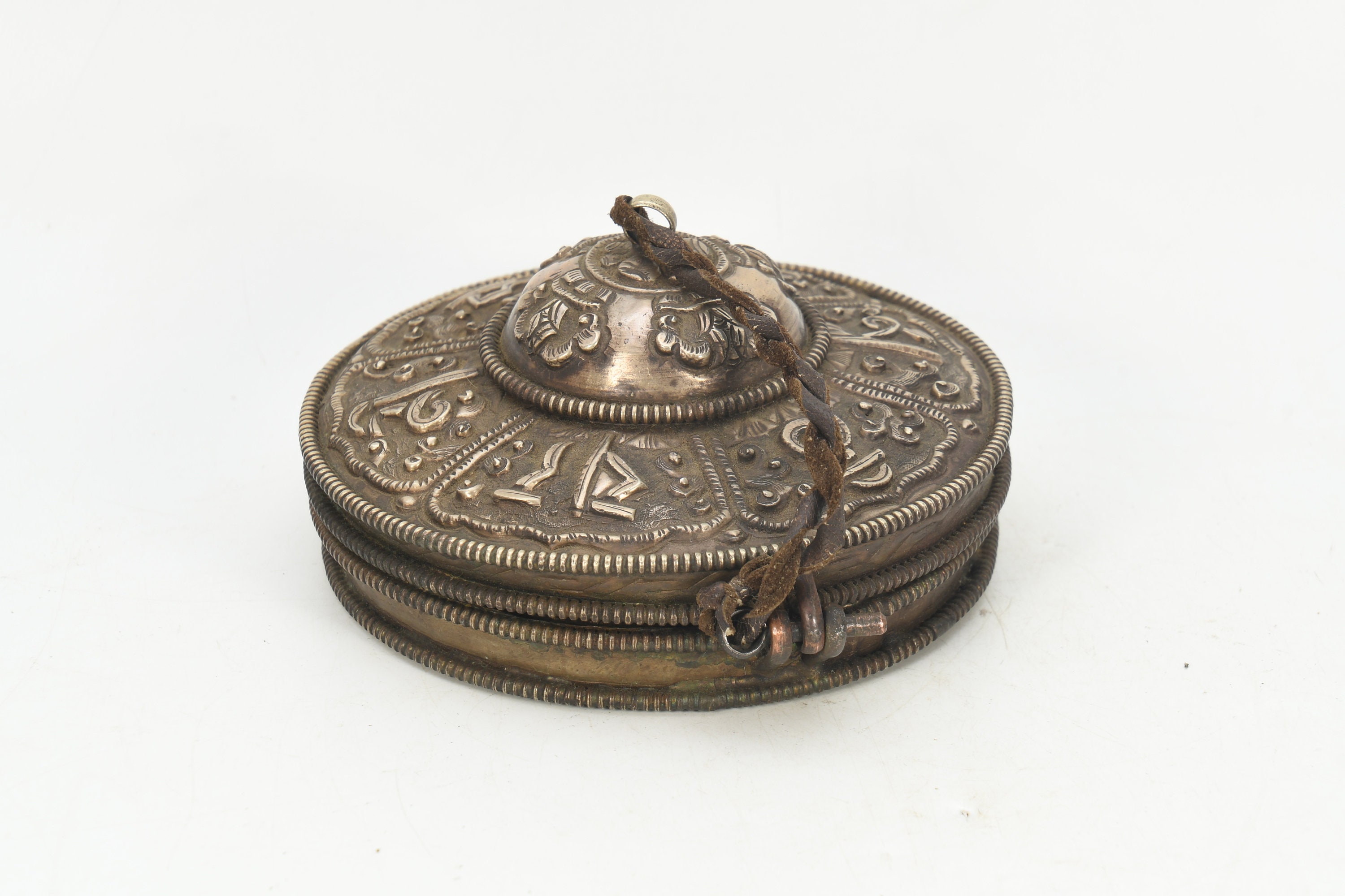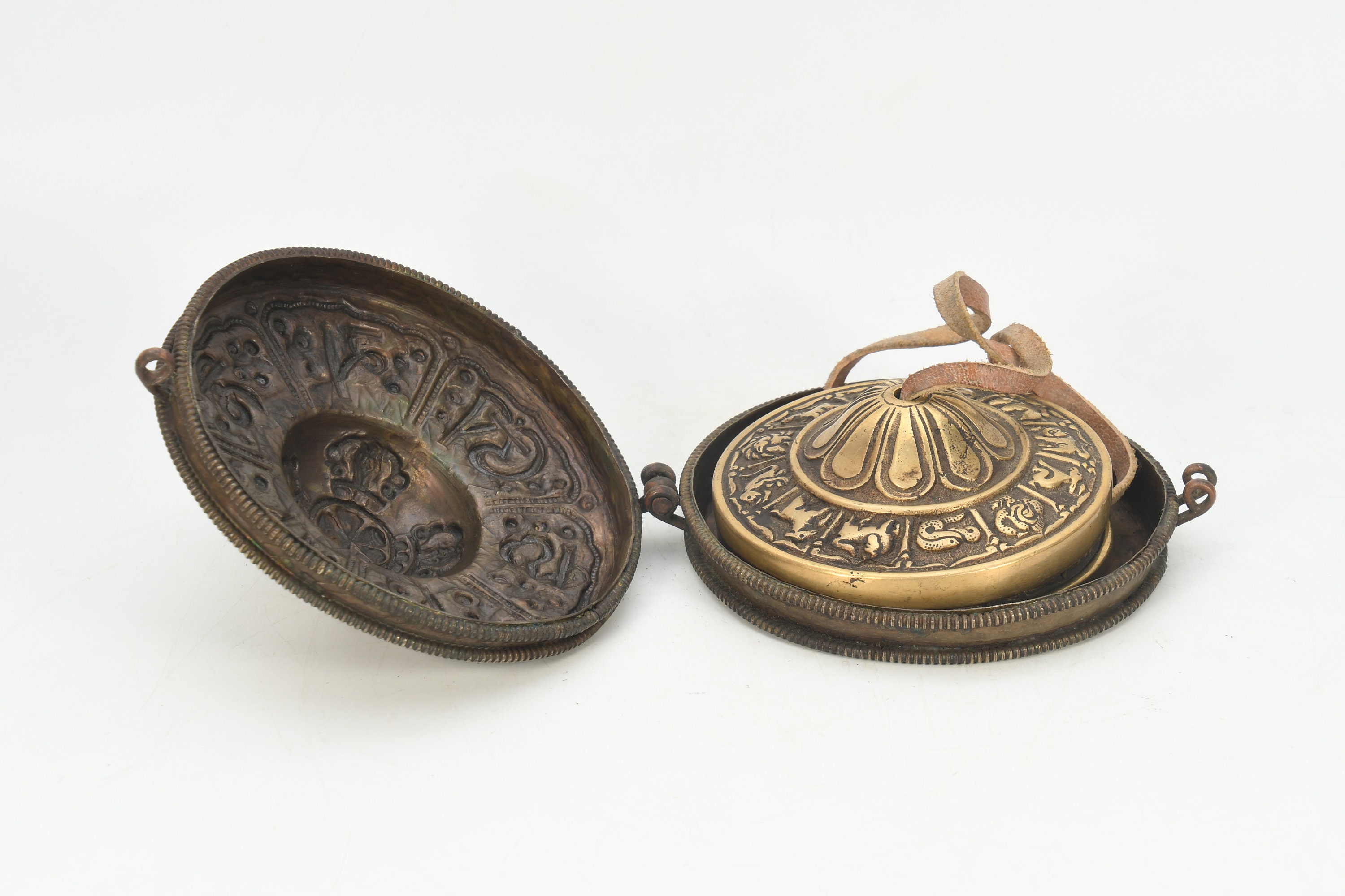 Bronze Tibetan Tingsha Cymbals with Silver Case, Hand Carved Nepal
