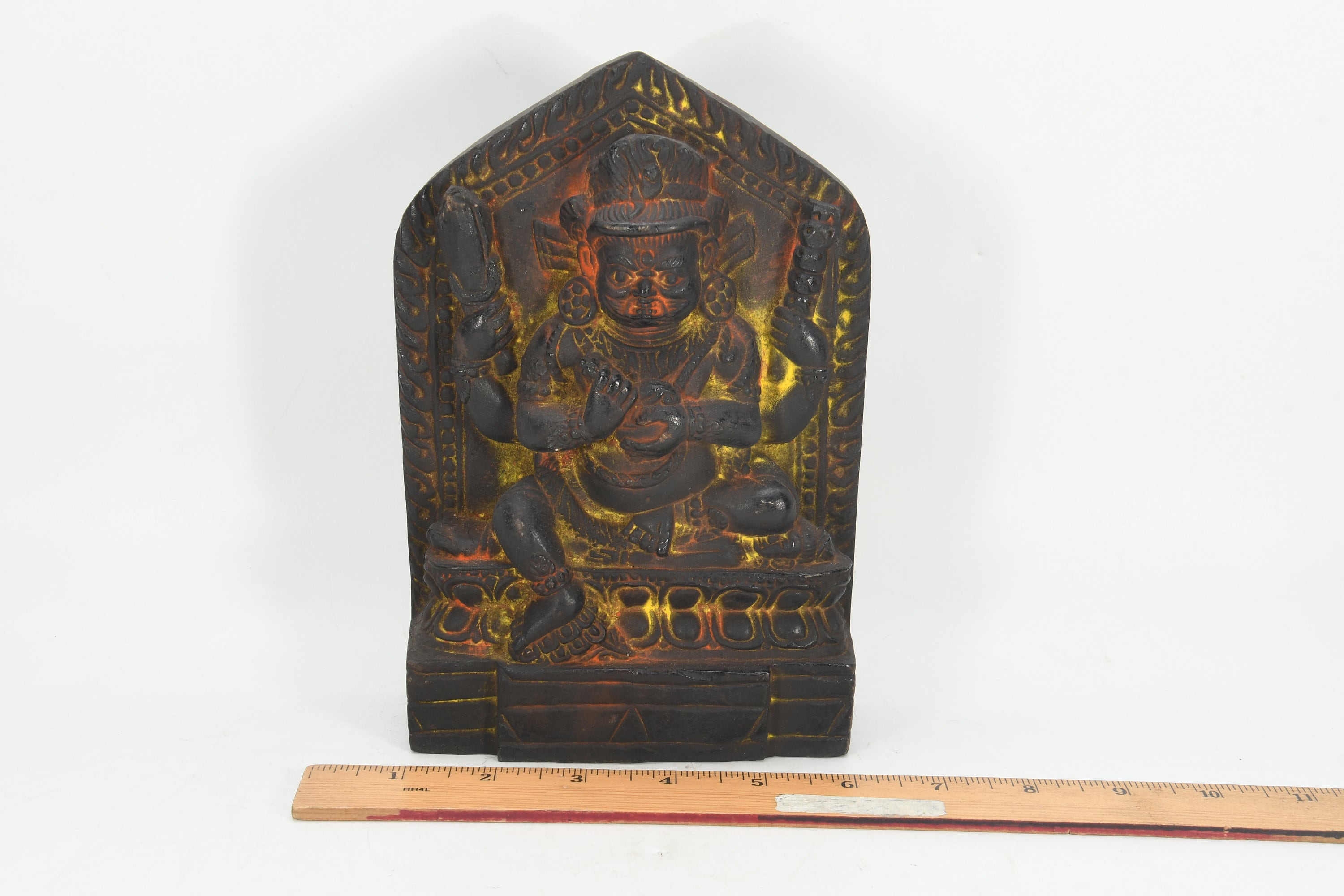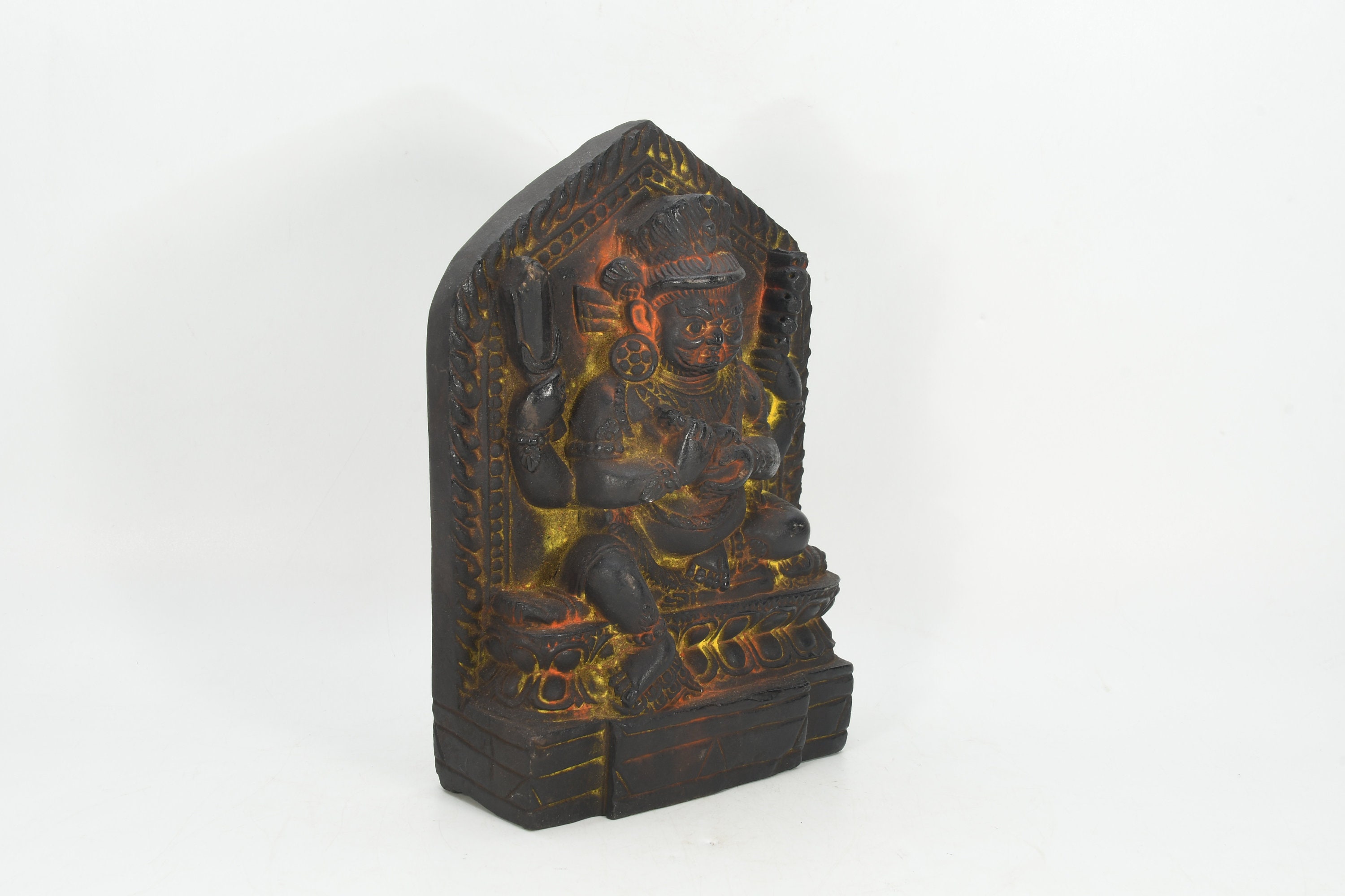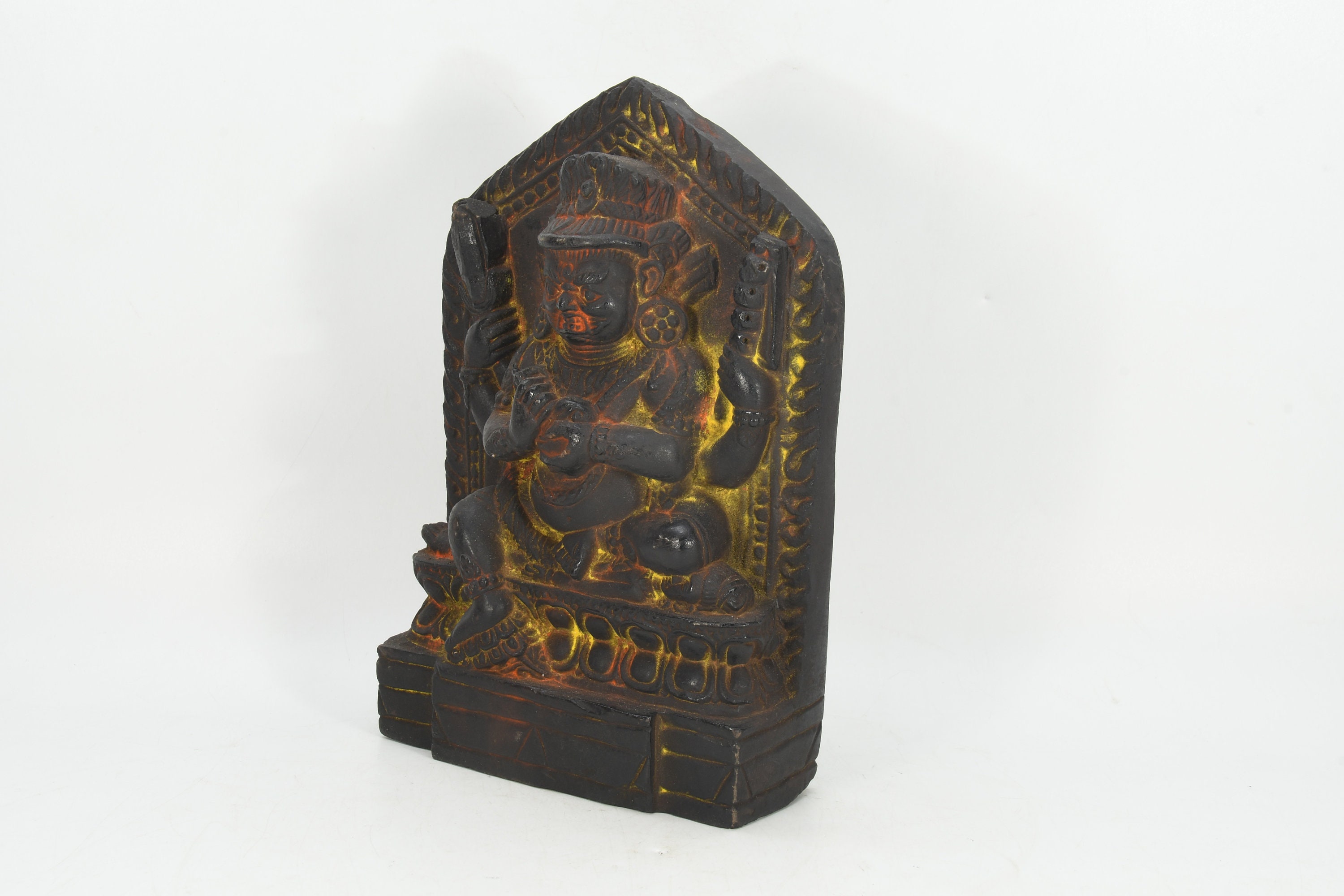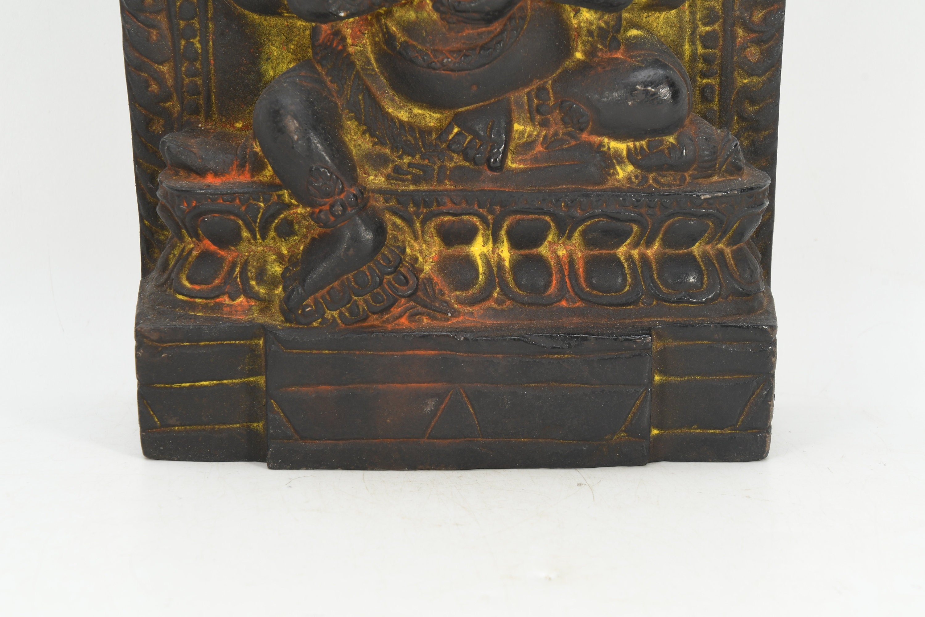 This particular image was attacked once in 1349 by the army of the Sham Uddin who tried to invade Nepal. They smashed away at it with mallets and hammers and so on, but they couldn’t break it at all. However, one particularly ferocious soldier managed to chip one of the toes, and it is said that the whole invading army died that night of some epidemic, and their faith never spread in Nepal. So now we can also see the feet are covered in silver. According to other accounts, they are responsible for the minor damage we see on the corpse throne and the image's face.