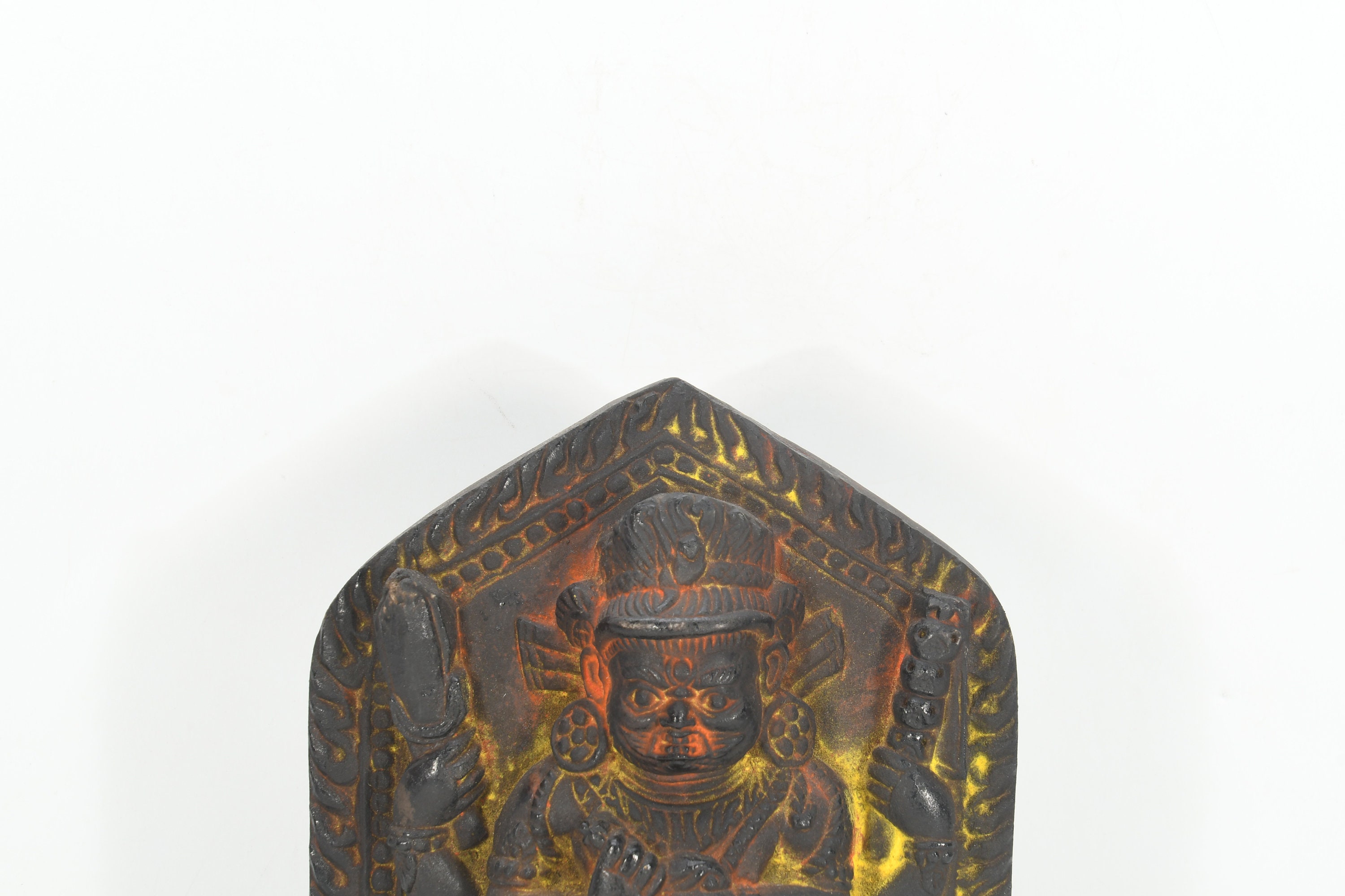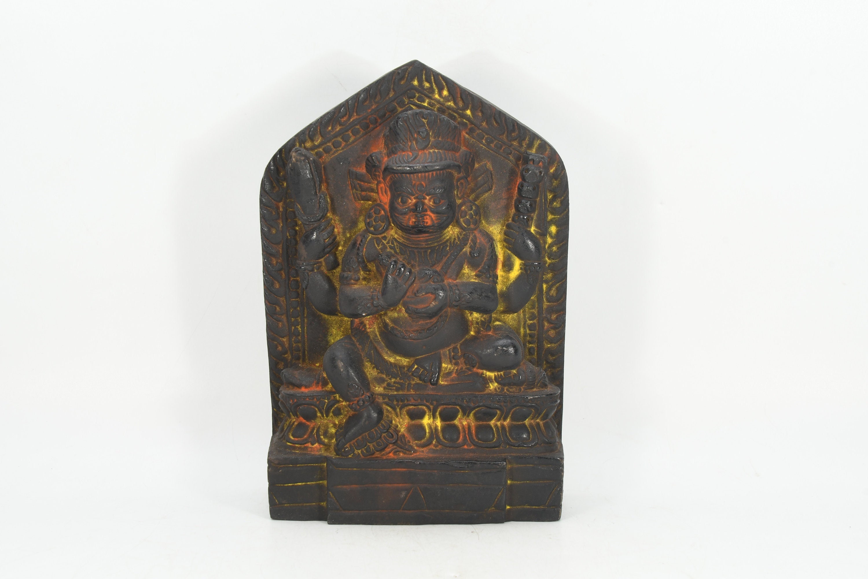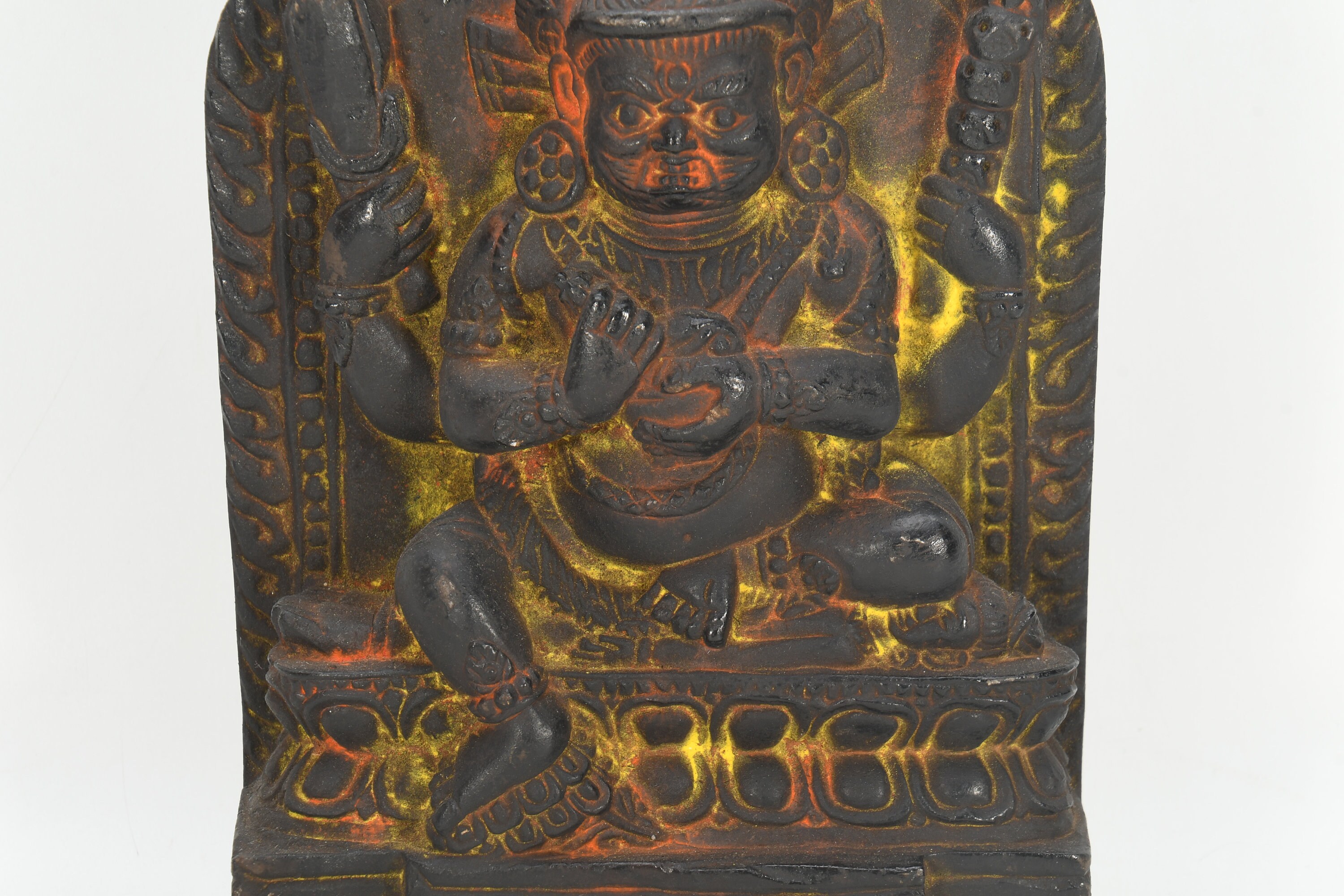This particular form of Mahakala, with one face, two hands, holding a curved knife, a skull-cup at his heart and a khatvanga in the hollow of his left elbow, his two legs standing on a corpse, is of outstanding workmanship.