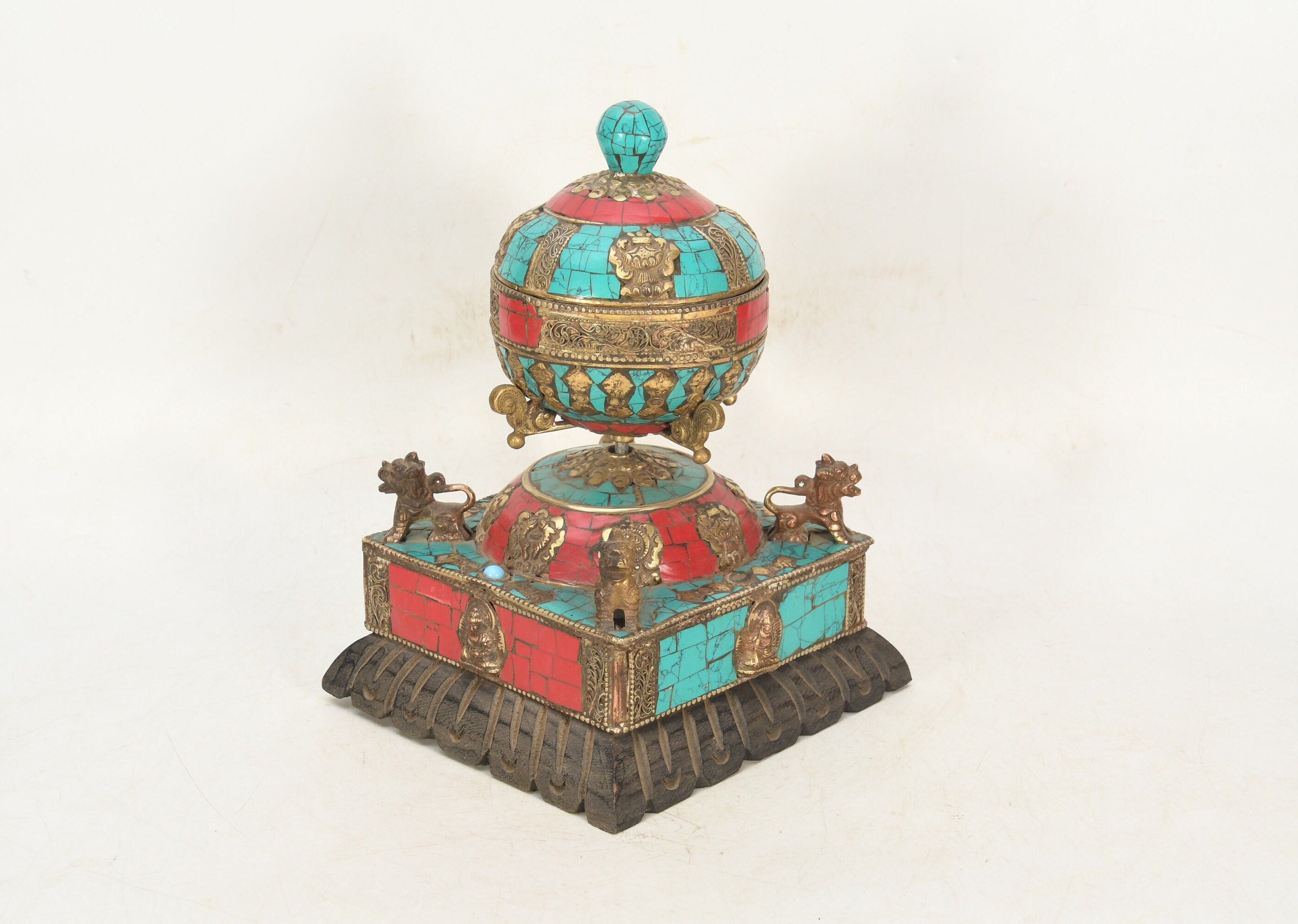 The six syllables mantra of the buddha of compassion, Avalokitesvara. The syllabus is found on the outside of the wheel as well as well kept inside the wheel printed in the paper scroll numerous times. The prayer wheels come in different shapes and sizes. They are usually carried by pilgrims or fixed to the gates of monasteries or around stupas. It is said that each turn of the cylinder generates as much merit as the reading of the sutra of the formula enclosed within the prayer wheel.