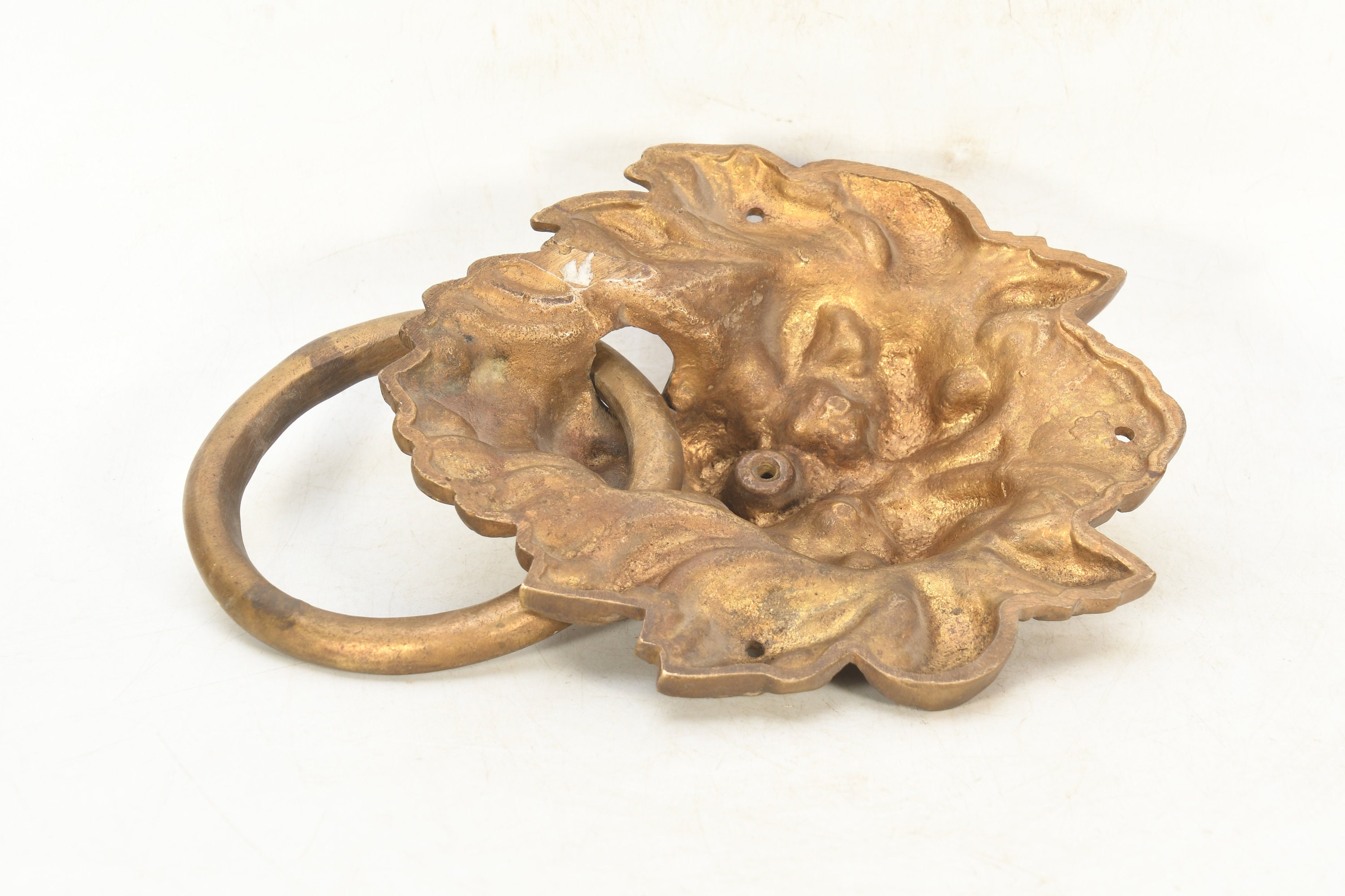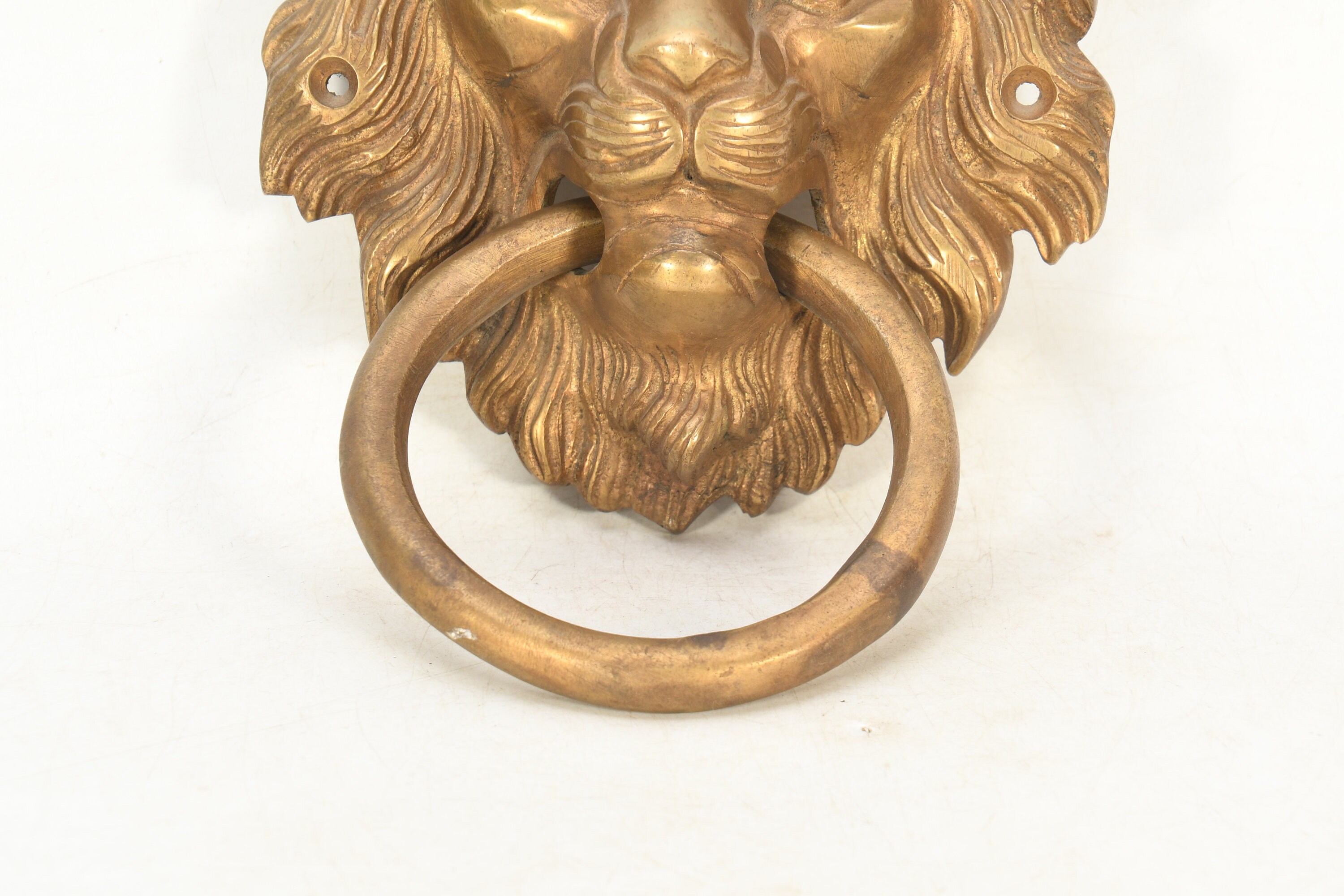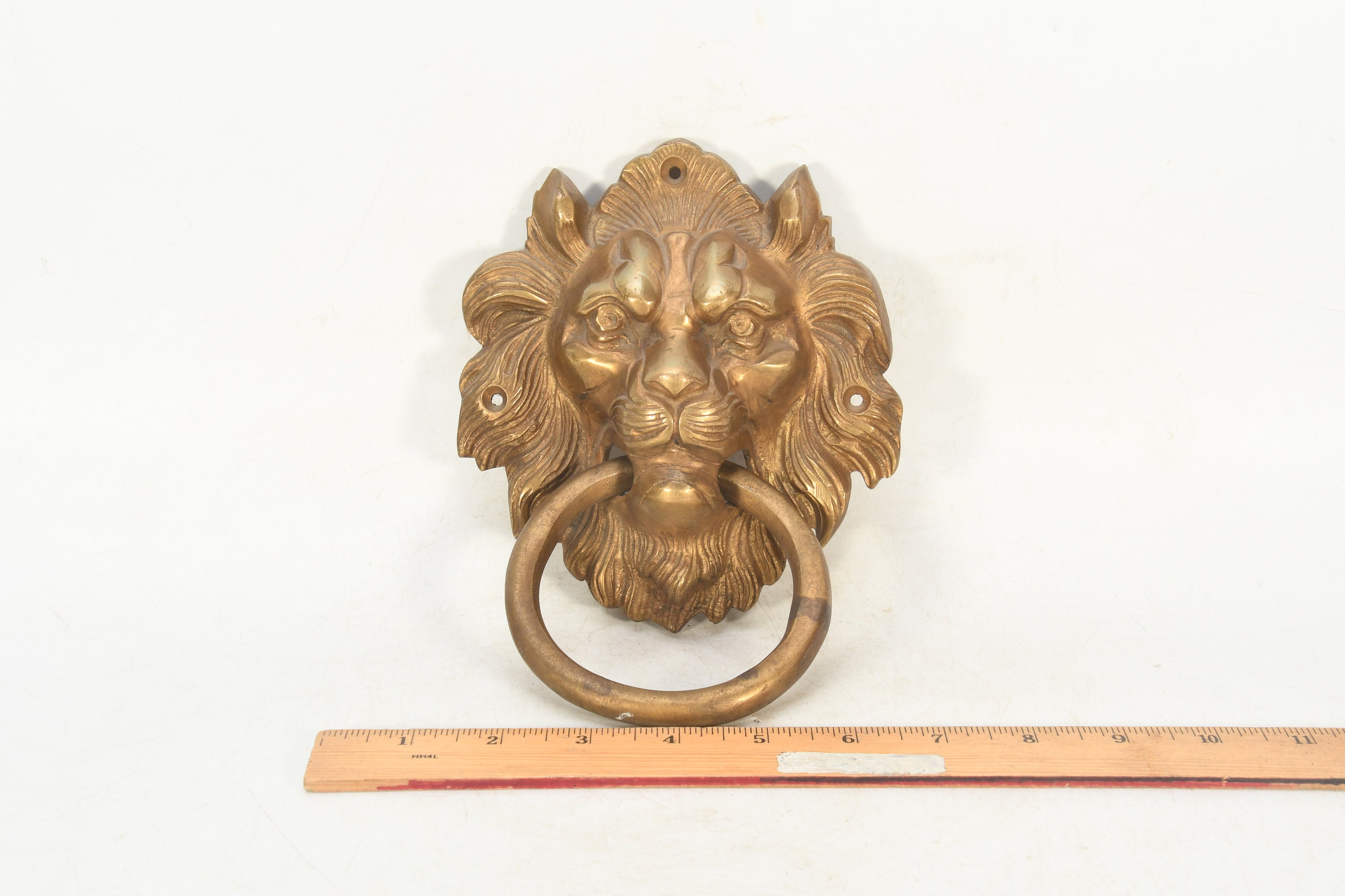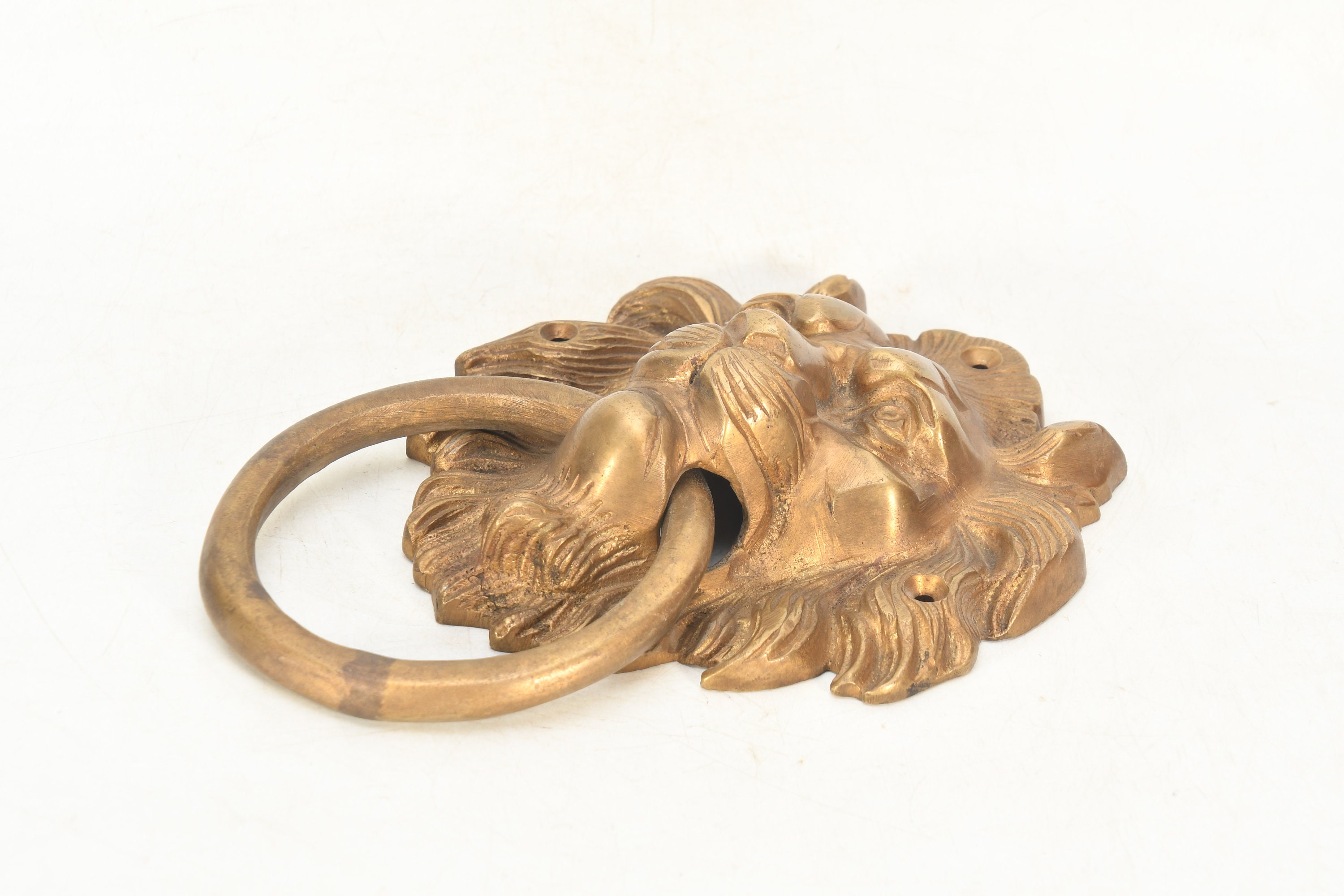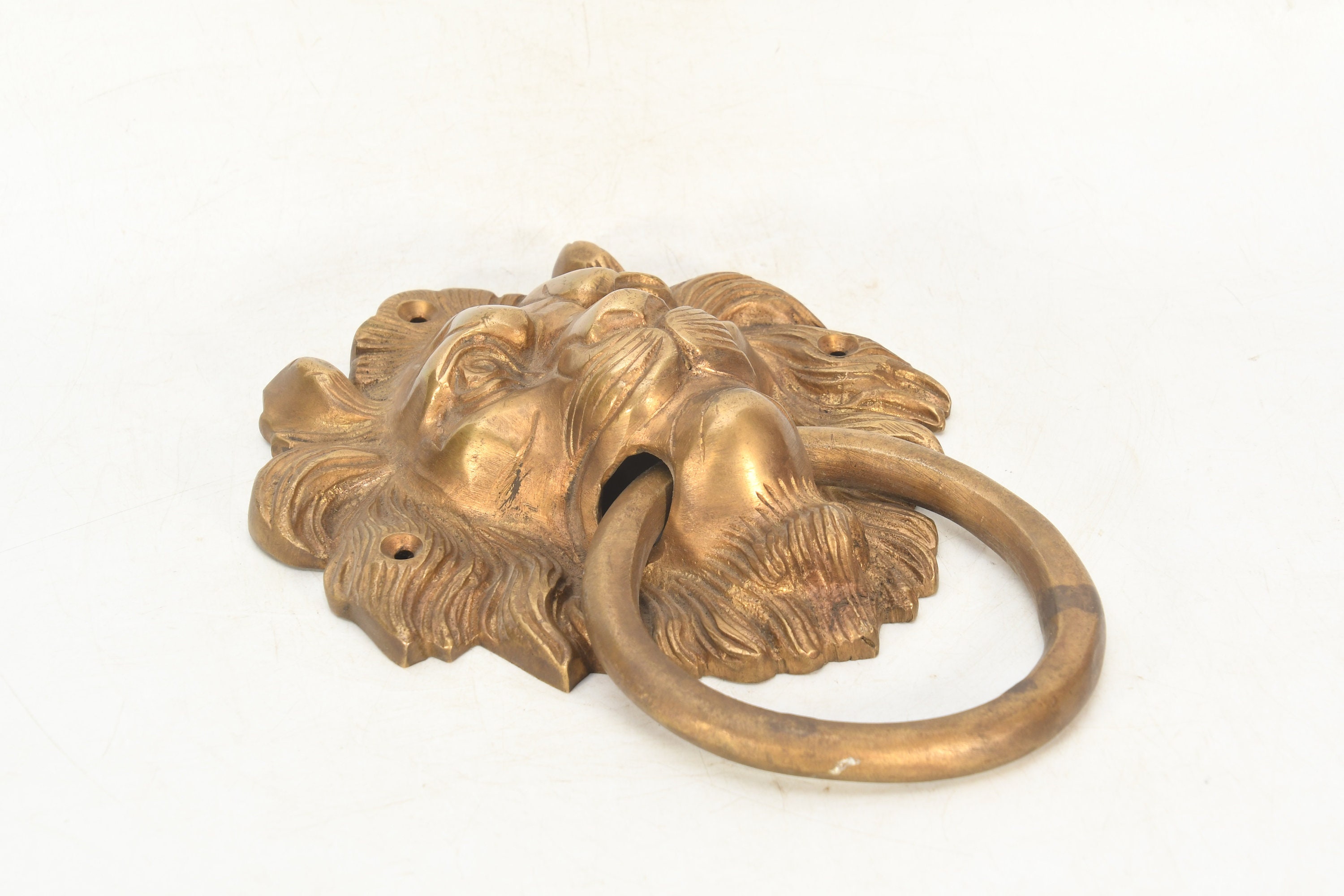 The brass handmade lion face wall hanging is a stunning decorative piece that showcases the intricate artistry of skilled craftsmen. It is meticulously crafted from high-quality brass, which lends durability and a captivating golden hue to the piece.