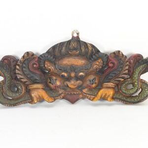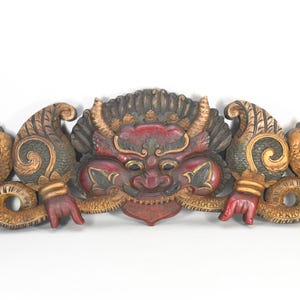The wall hanging features a majestic lion face as its central motif. The lion's face is intricately detailed, capturing the noble and regal characteristics of this powerful creature. The facial features, such as the mane, eyes, nose, and mouth, are expertly shaped and carved to create a lifelike representation.