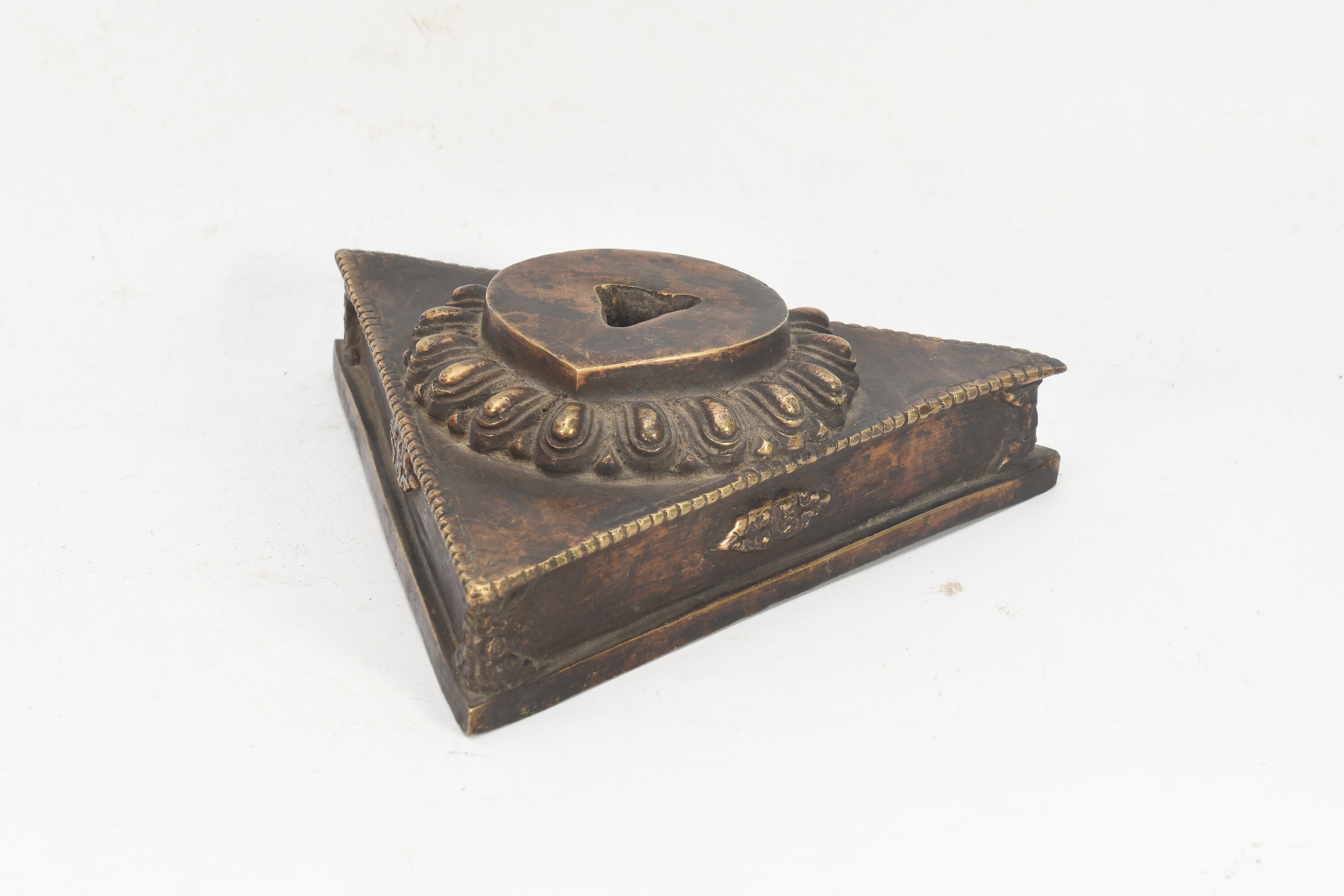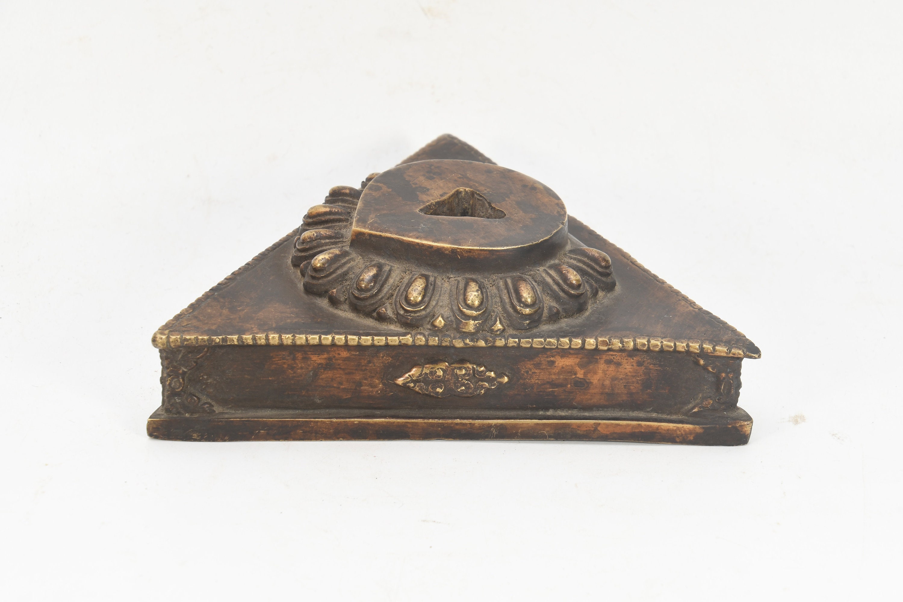 The Phurba is triple sided Tibetan ritual dagger or stake. Tibetan meaning for Phurba refers to a stake used for tethering or a peg used for securing a tent. While other objects of similar shape can be considered Phurba , it is usually a knife with three distinct segments, one of which is a characteristic three - sided blade or point. The segments and the triple blade represent the three spirit worlds, while the Phurba as a whole symbolizes the "worlds axis" bring all three worlds together. This Ritual Buddhist Dagger or dart symbolizes the slaying or destruction of foe or obstructions. This ritual object is usually made of various clay, woods, metals or human or monkey bones or a combination which is considered a powerful element for driving away evil spirits, however wood and bone are also used and often required for certain ritual events. The lower part of the blade is said to represent "Method" while the handle "Wisdom". These would have been two objects that were vital in the survival of people in these hash regions. The Phurba is patterned after an ancient Vedic tool, a stake used to tether sacrificial animals. It is also regarded as a powerful weapon which subdues evil spirits and negative energies, transforming them into positive forces.
