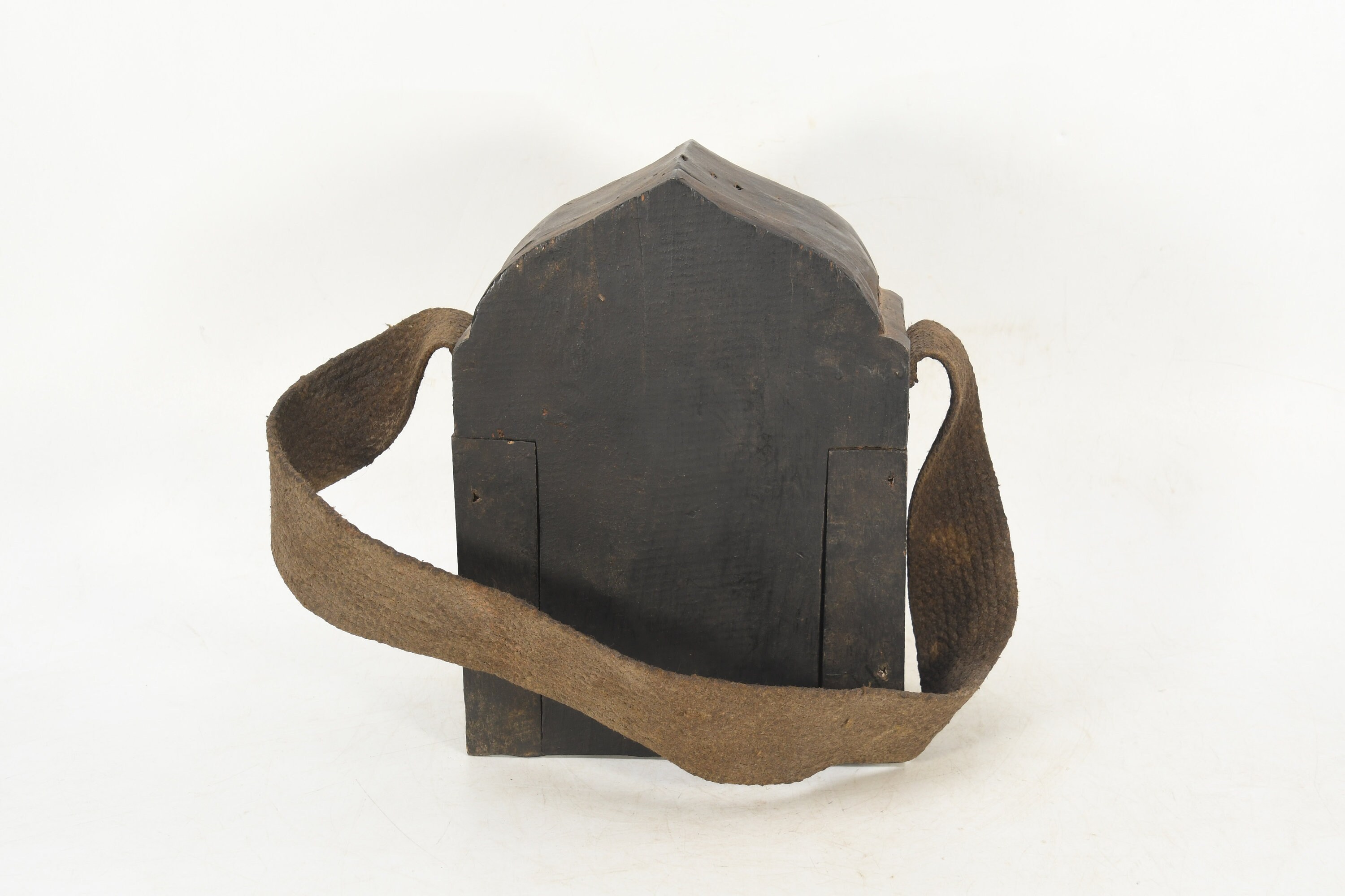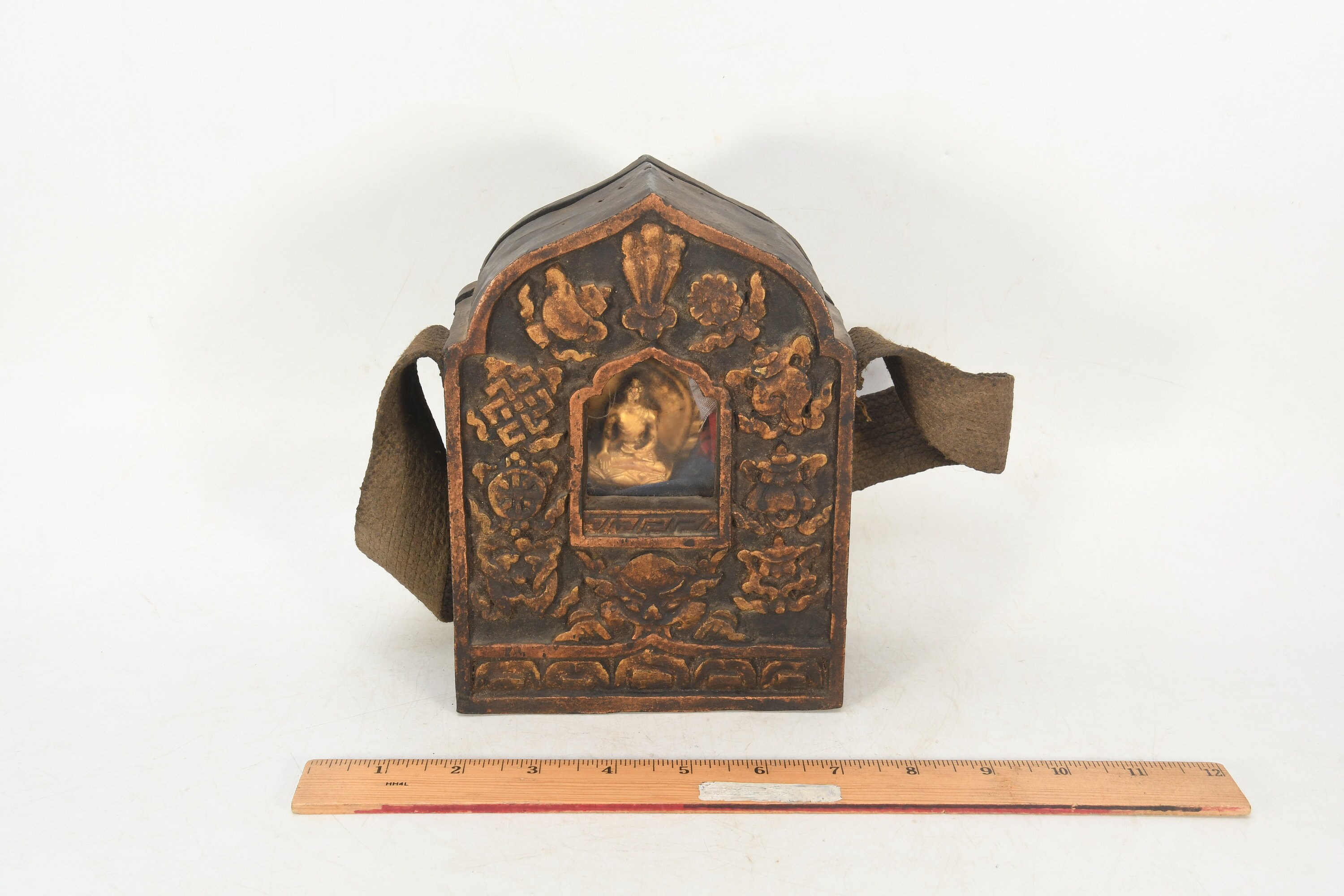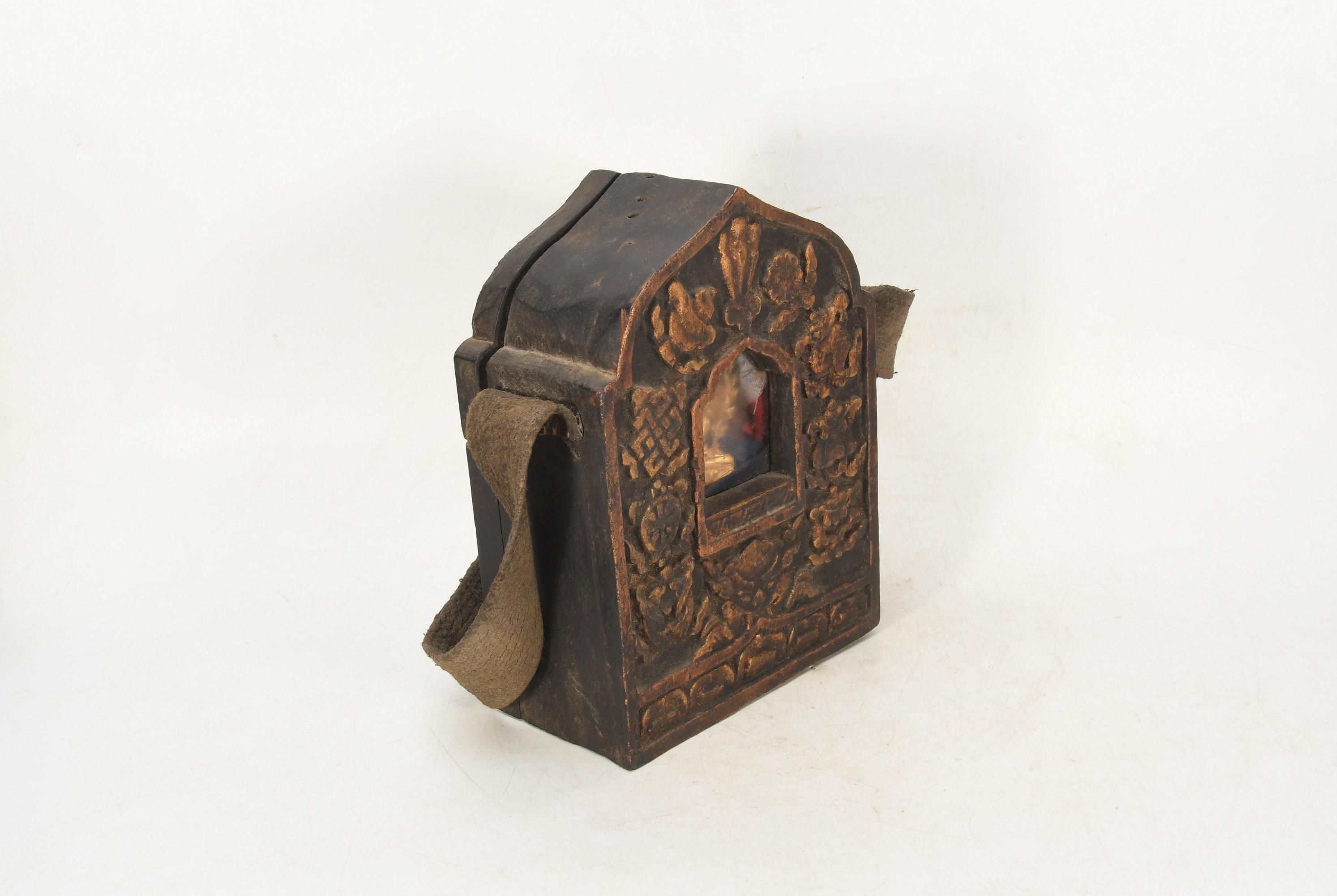 A wooden Ghau wall hanging is a decorative item that is traditionally found in the Himalayan region, particularly in Nepal and Tibet. The Ghau, also known as a prayer box or an amulet container, is a sacred object in Tibetan Buddhism. It is used to hold small religious relics, written prayers, or precious items that have spiritual significance.