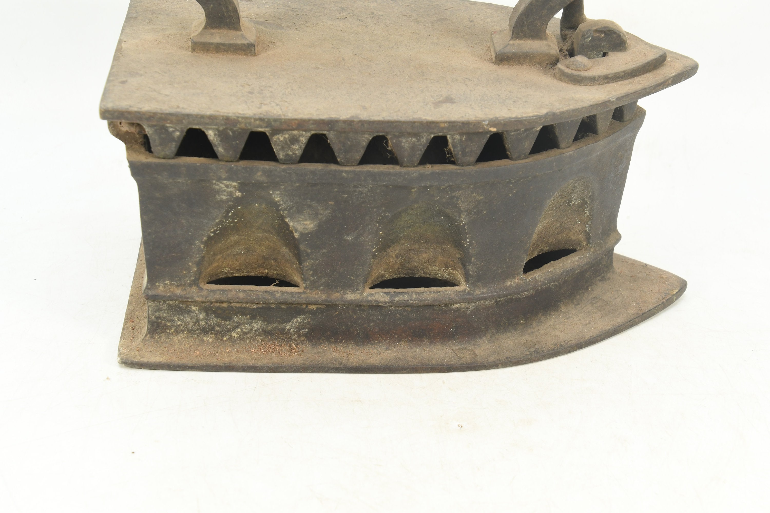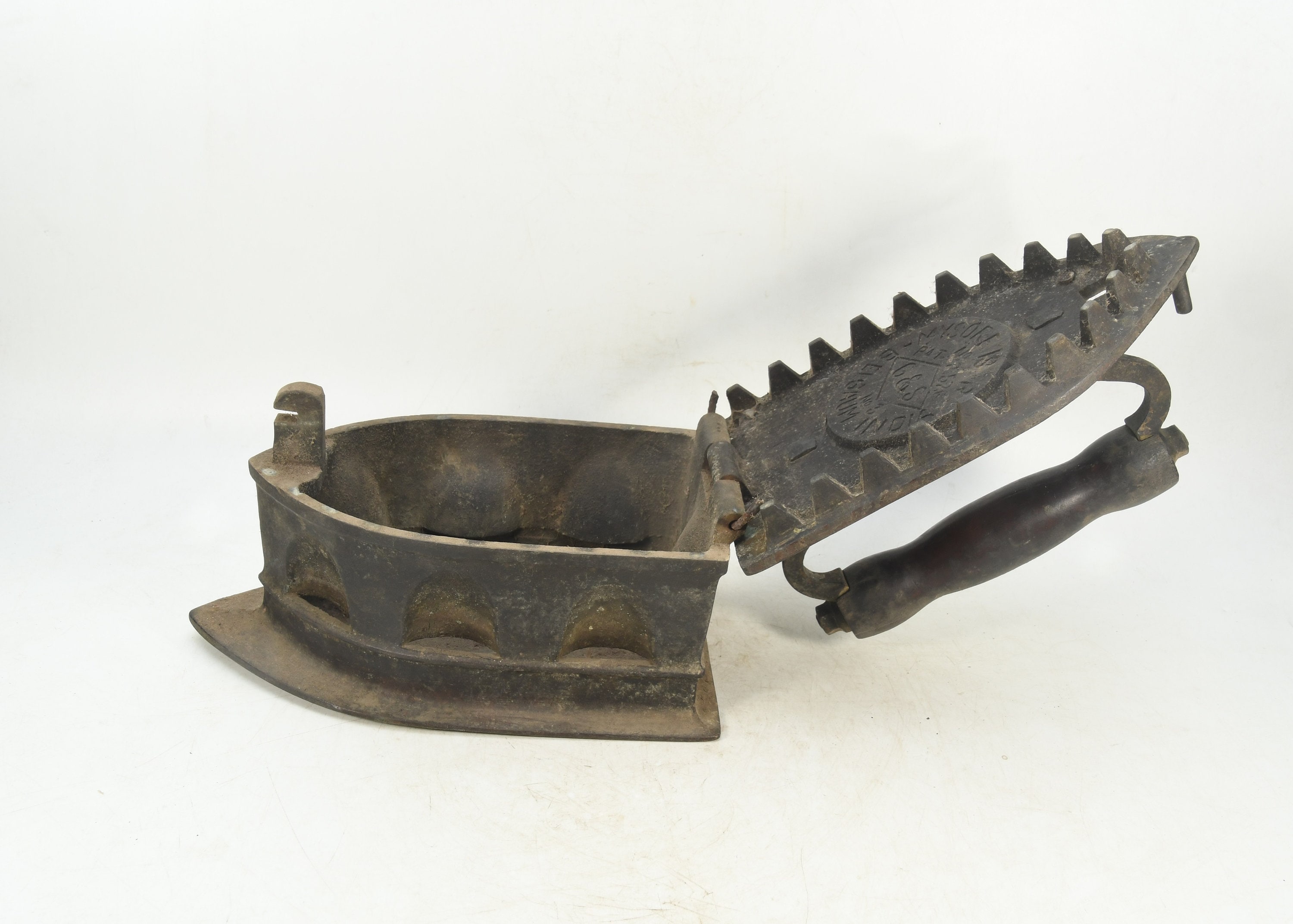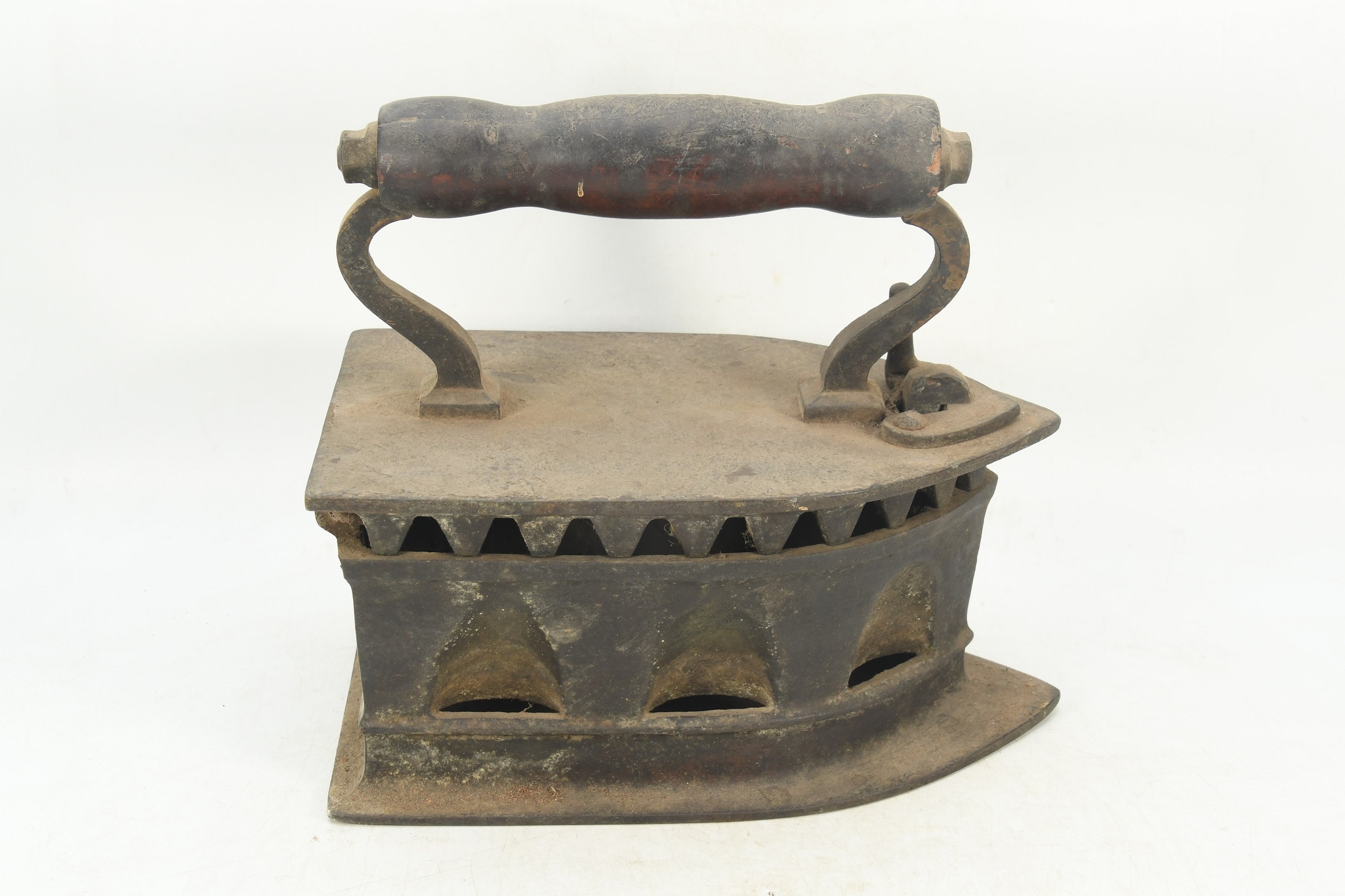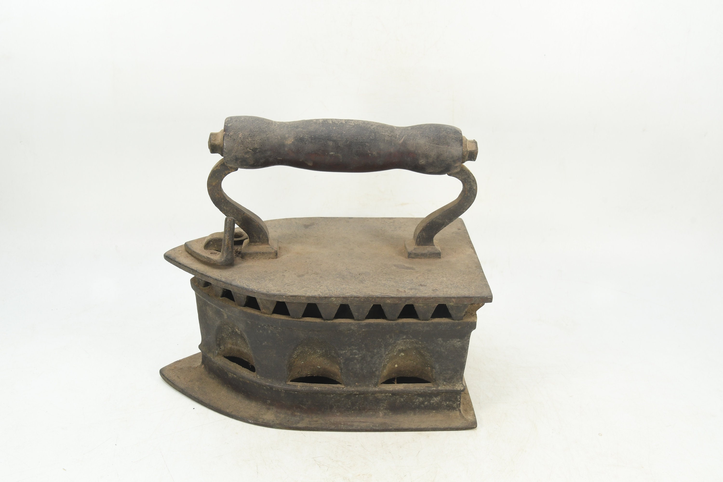 Crafted with meticulous attention to detail, this antique charcoal iron showcases the charm of yesteryear. Its sturdy cast iron construction provides a tangible connection to the past, reminding us of the simpler times when household chores were done with dedication and patience.