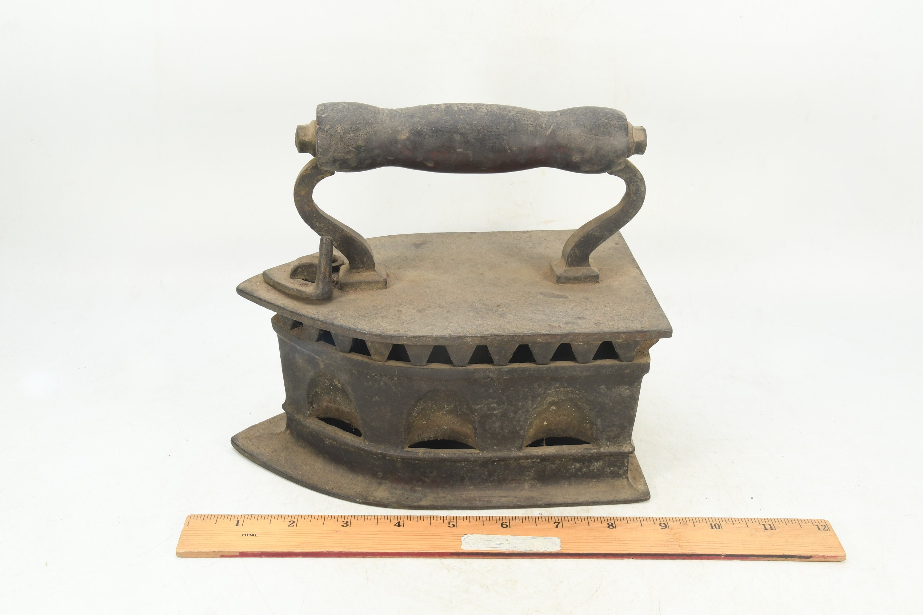 Step back in time and add a touch of nostalgia to your home with this exquisite vintage charcoal iron. This unique piece is not only a beautiful display of craftsmanship but also a charming relic from a bygone era. It will make a perfect addition to your antique collection or serve as a captivating conversation starter in any room.