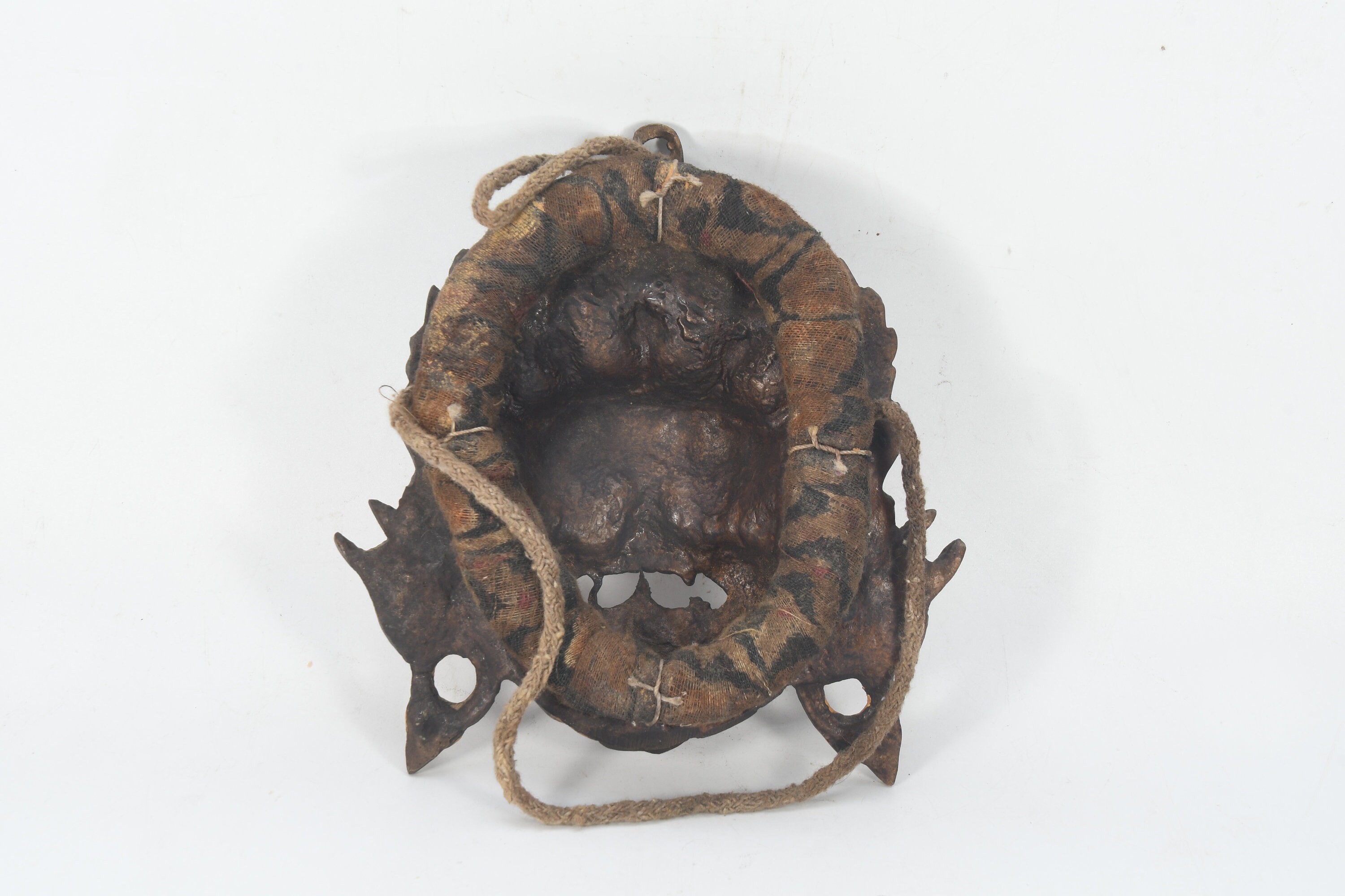 The mask is typically made of durable materials such as wood, metal, or resin. It features intricate craftsmanship and attention to detail. The facial expression of the mask is intense, with bulging eyes, a wide-open mouth, and sharp fangs. The design often includes multiple arms and a crown or headdress adorned with skulls or other symbolic elements.