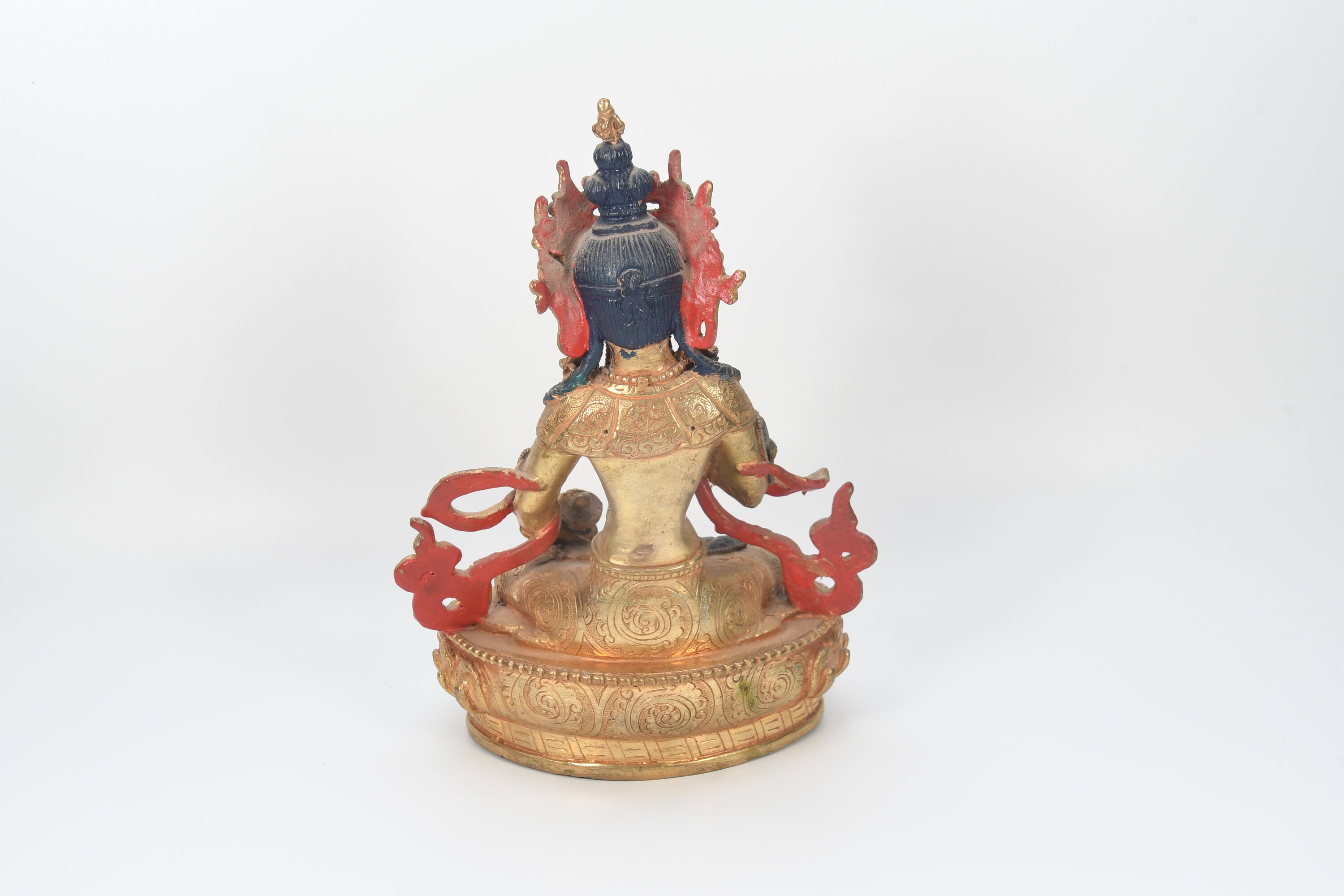 The Vajrasattva Dorje Sempa Sculpture was sculptured with the skillset passed down from generation to generation while perfecting the art of making statues. The artists used a copper body and gilded the statue with a pure layer of 24k gold. The deity is depicted seated over a moon disc lotus with a peaceful expression while holding a vajra with his right hand above his chest and a bell with his left hand above his chest. On the body, there are exquisite hand carvings that can be seen. With the rare stones and diamonds carved in the statue, the lotus seat, robe, and crown all testify to the finest level of this sculpture.