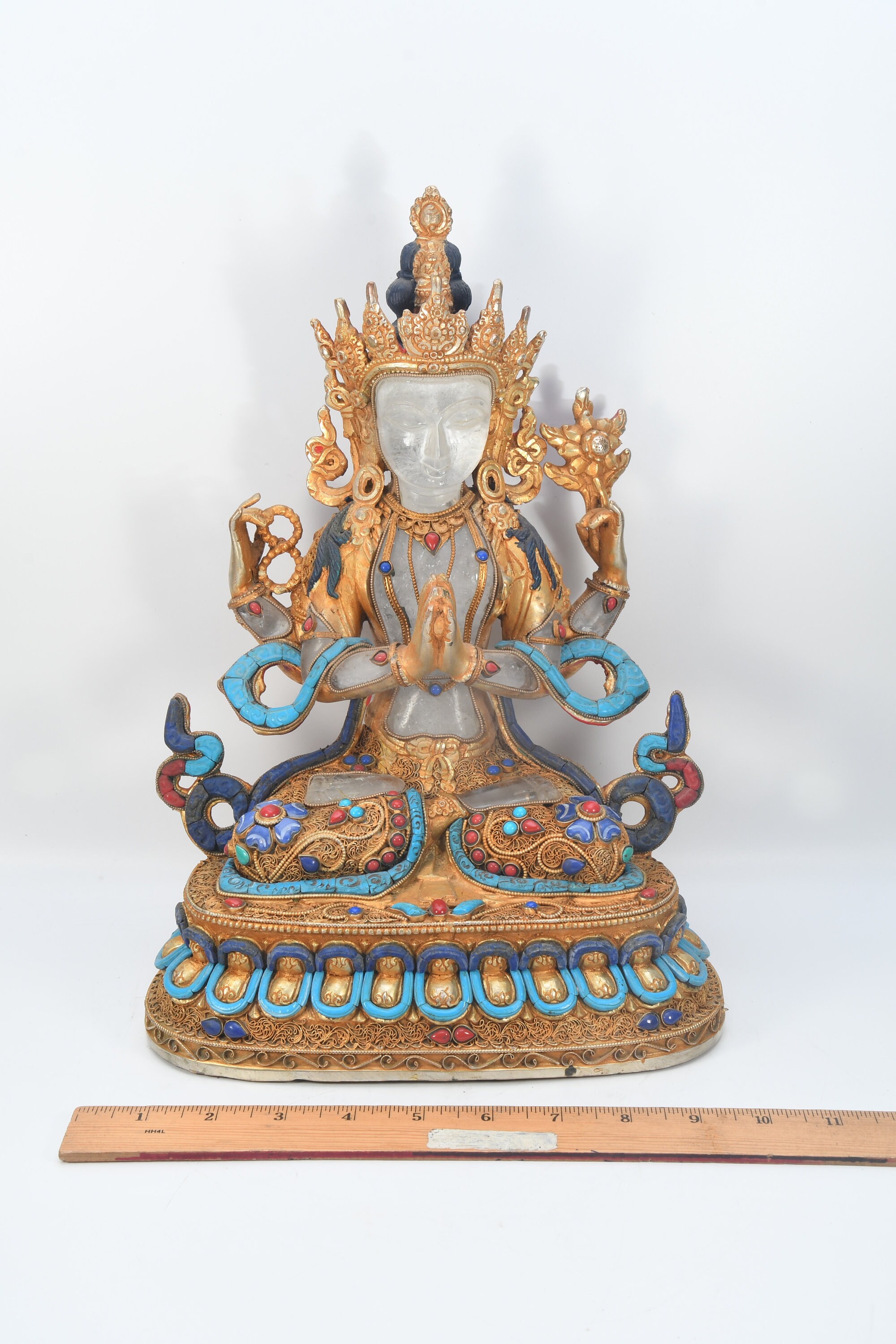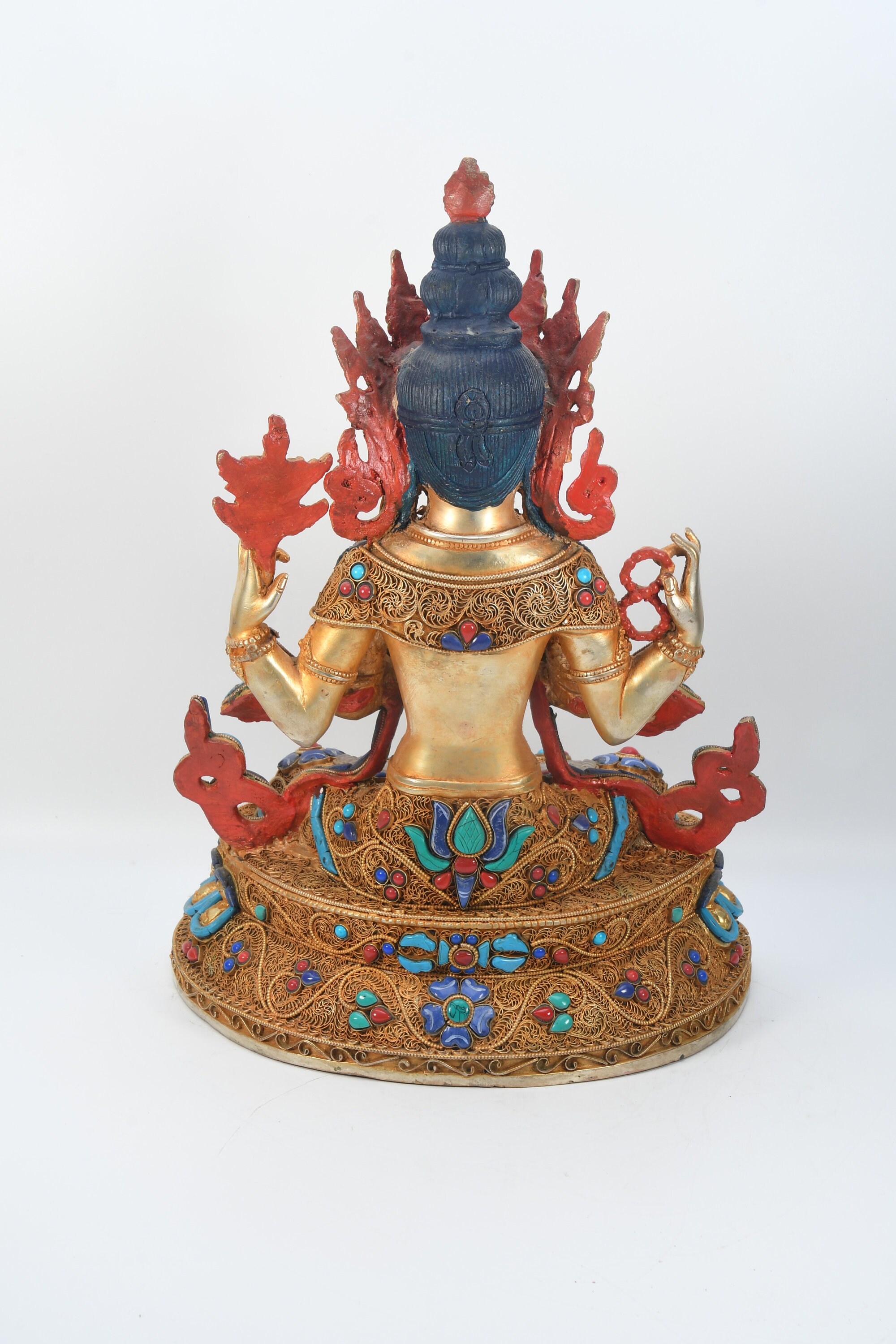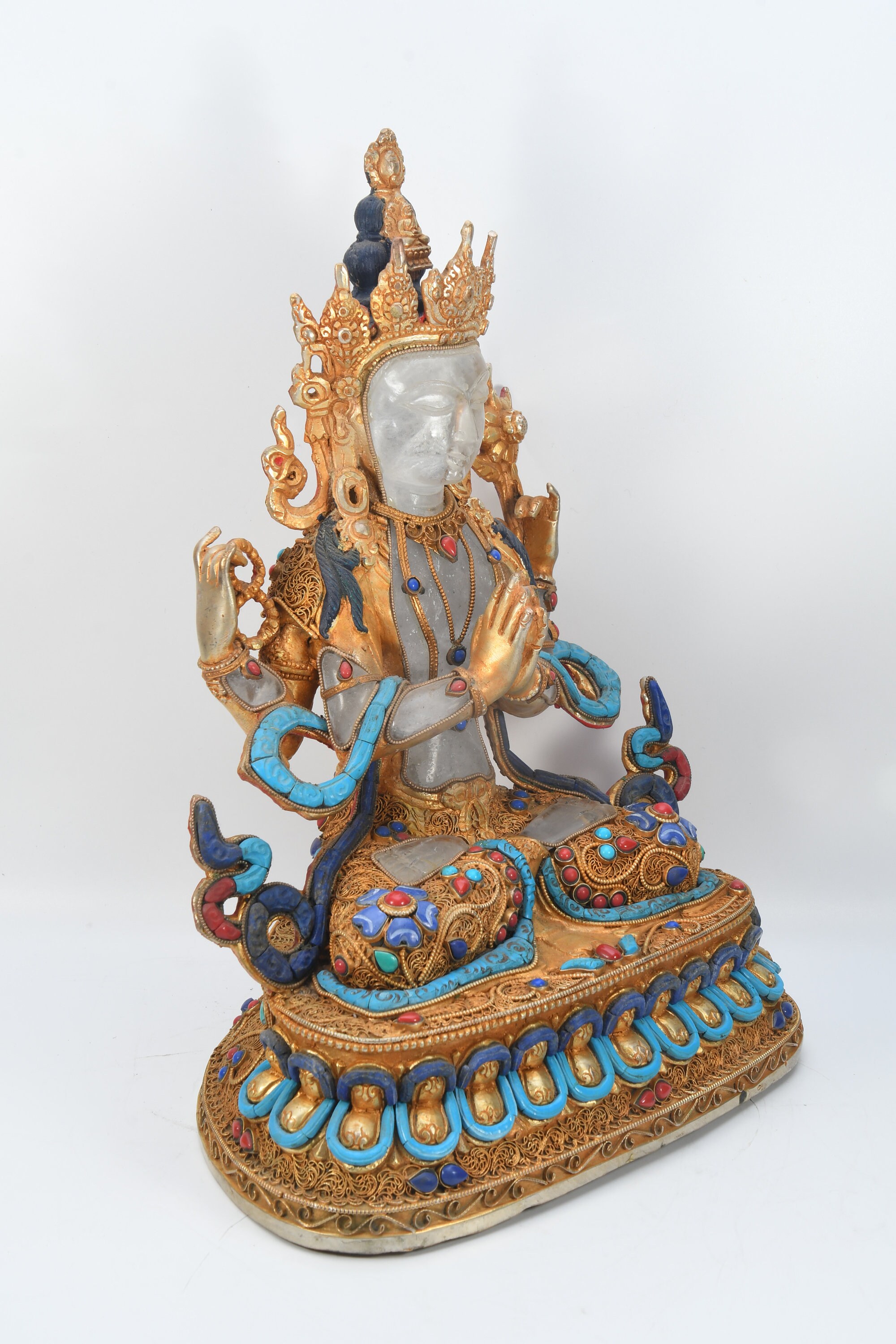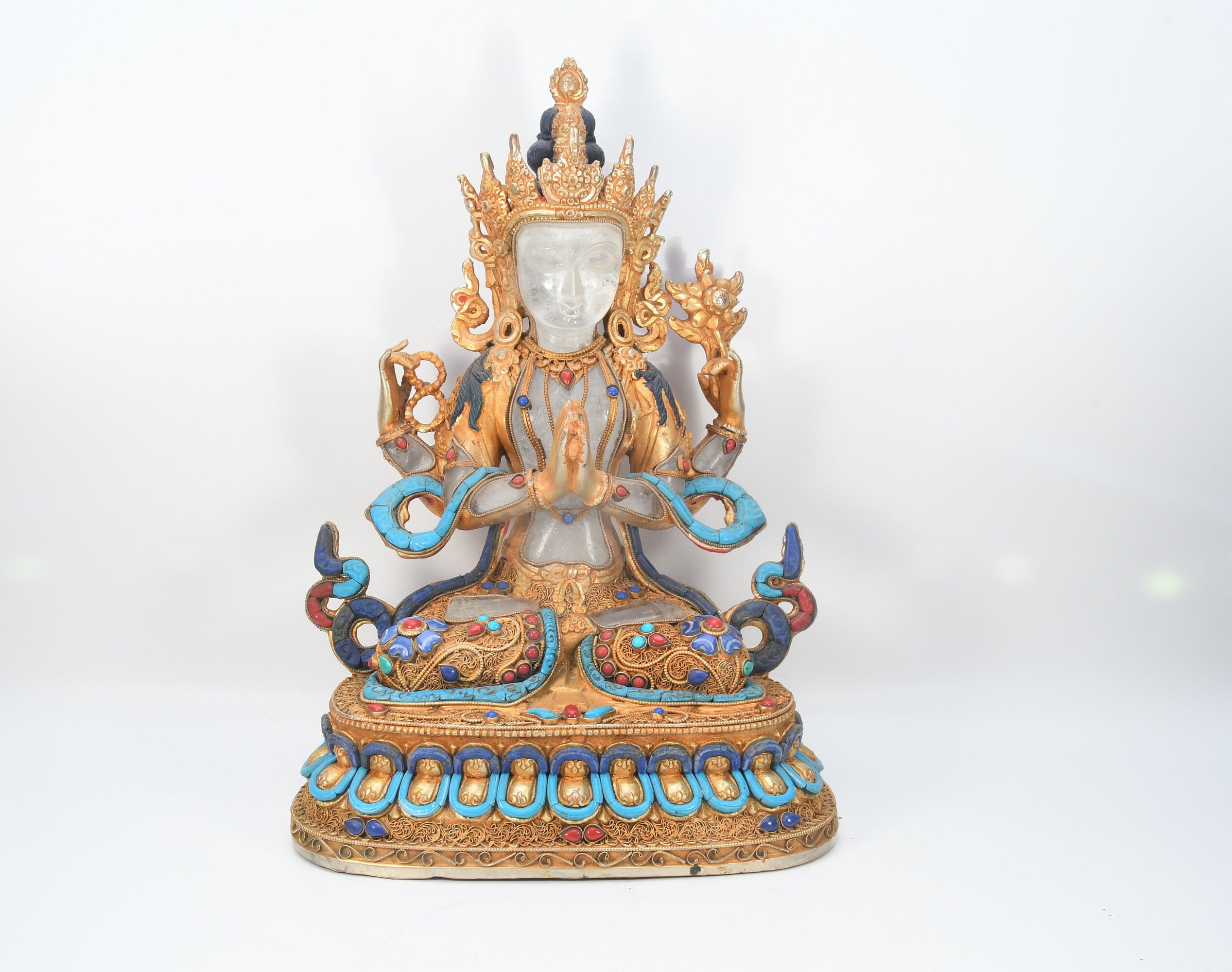 He is the earthly incarnation of the celestial Buddha Amitabha, and he guards our world during the interval between the historical Buddha, Shakyamuni, and the future Buddha, Maitreya. Chenrezig is universally cherished in all branches of Buddhism and is considered the patron Bodhisattva of Tibet. Even in non-Buddhist countries, most people are familiar with his mantra Om Mani Padme Hum. Chenrezig courageously vowed that so long as even one being remains caught in samsara, he will continue to work for the benefit of living creatures. His wisdom, compassion, and endurance know no bounds, and he is especially revered for granting realizations and spiritual attainments to those who meditate upon him.