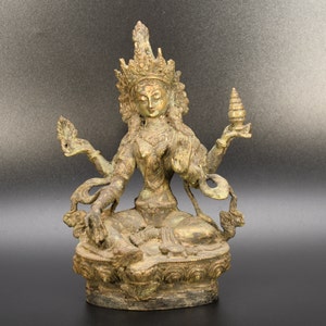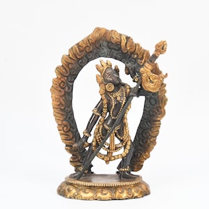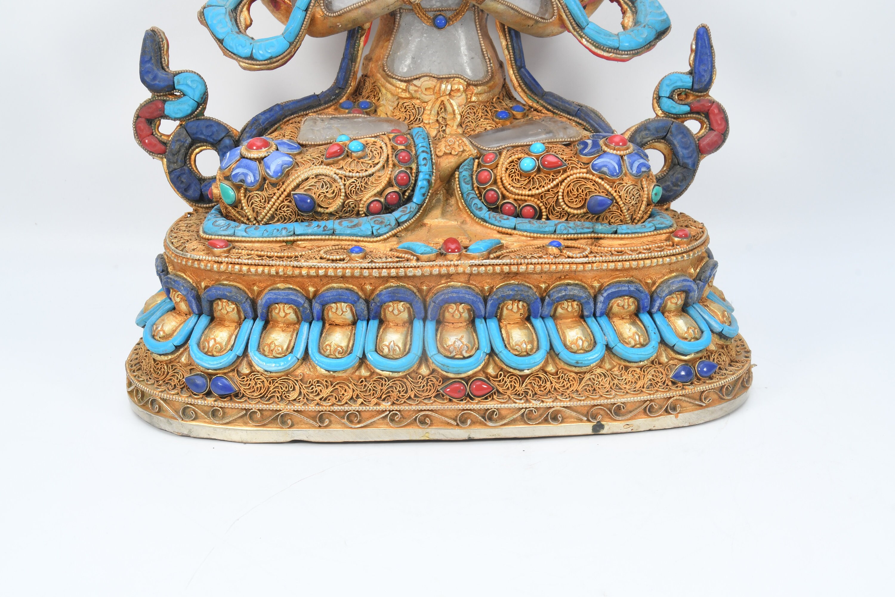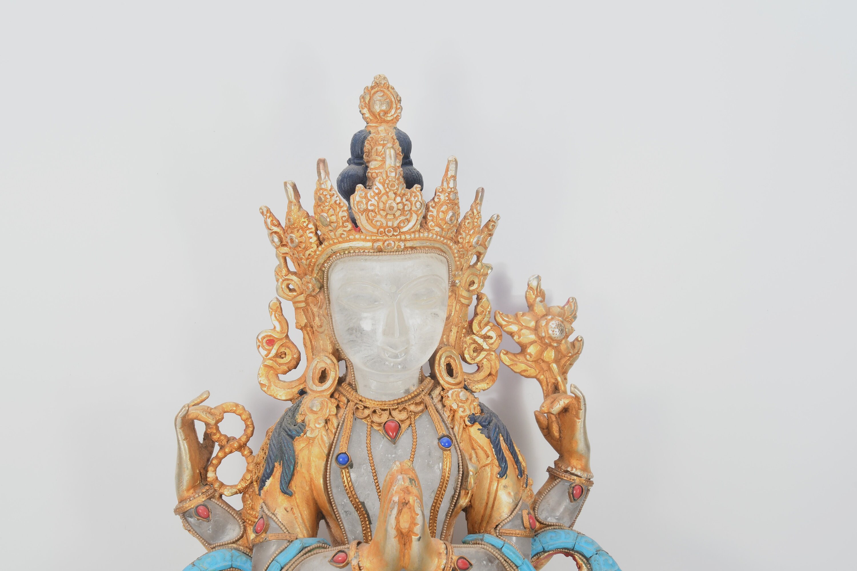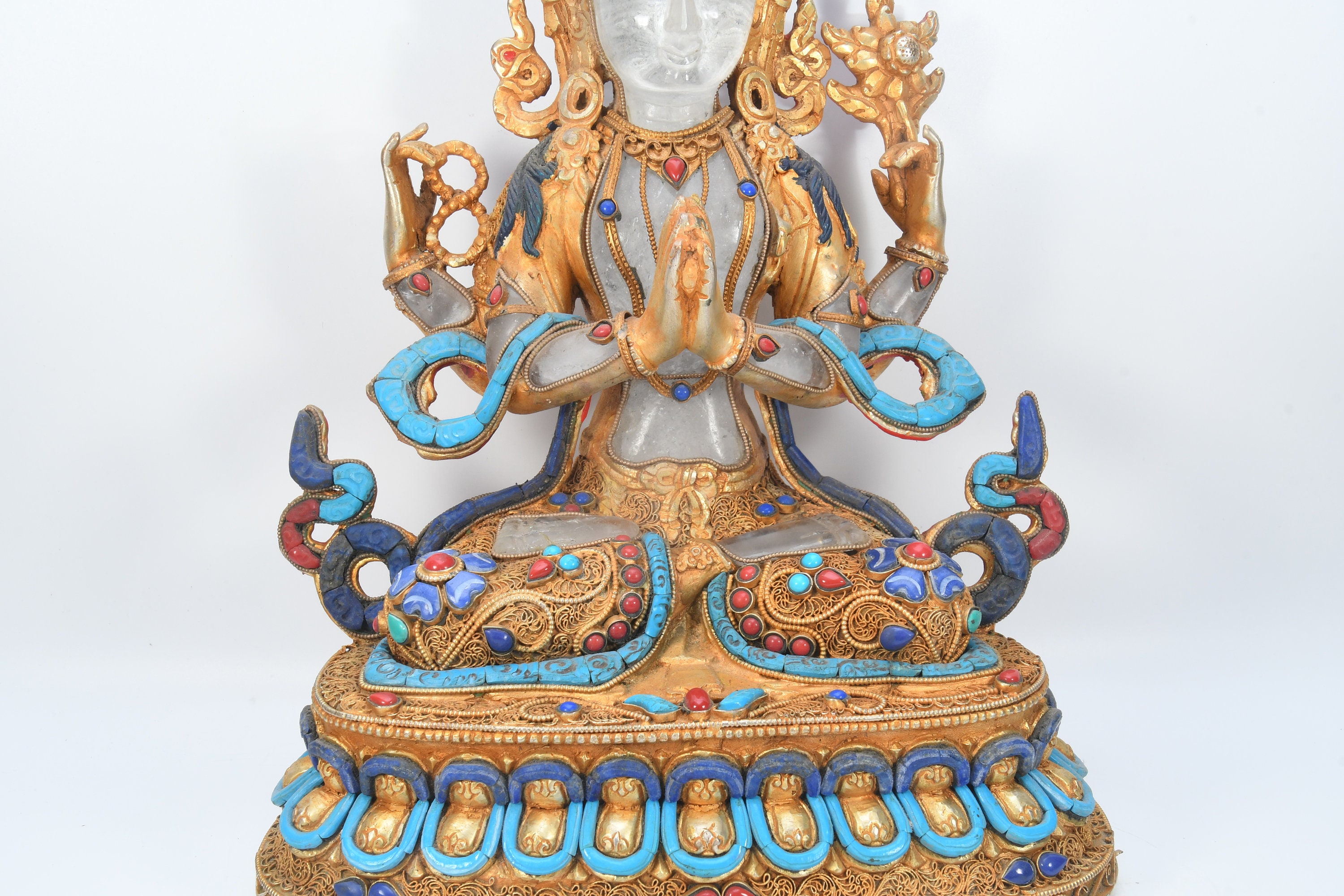 He is the earthly incarnation of the celestial Buddha Amitabha, and he guards our world during the interval between the historical Buddha, Shakyamuni, and the future Buddha, Maitreya. Chenrezig is universally cherished in all branches of Buddhism and is considered the patron Bodhisattva of Tibet. Even in non-Buddhist countries, most people are familiar with his mantra Om Mani Padme Hum. Chenrezig courageously vowed that so long as even one being remains caught in samsara, he will continue to work for the benefit of living creatures. His wisdom, compassion, and endurance know no bounds, and he is especially revered for granting realizations and spiritual attainments to those who meditate upon him.