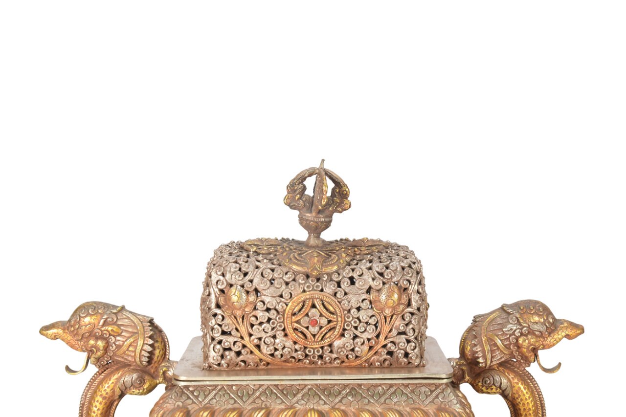 Auspicious Tibetan Incense Burner is a very traditional Tibetan incense burner Hand Made in Nepal. Copper and white metal or silver are used to produce this incense burner gives it a unique and classical texture. Similarly, Tibetan Dorje on top of this incense burner has given it more cultural looks.