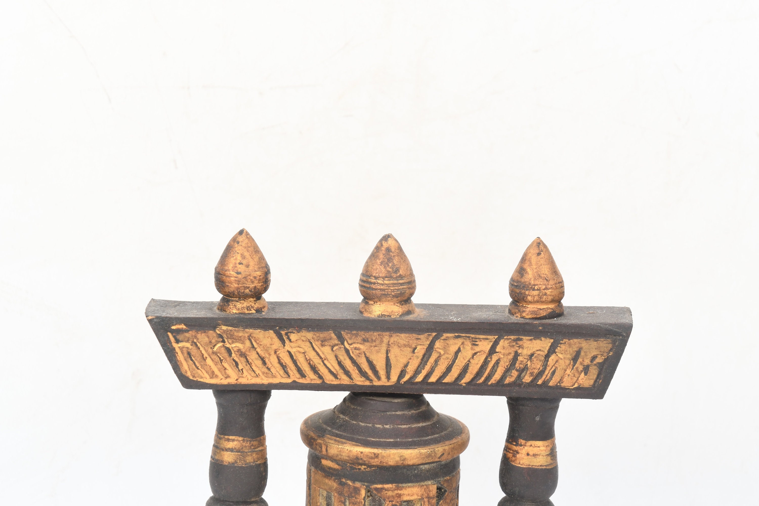 The six syllables mantra of the buddha of compassion, Avalokitesvara. The syllabus is found on the outside of the wheel as well as well kept inside the wheel printed in the paper scroll numerous times. The prayer wheels come in different shapes and sizes. They are usually carried by pilgrims or fixed to the gates of monasteries or around stupas. It is said that each turn of the cylinder generates as much merit as the reading of the sutra of the formula enclosed within the prayer wheel.