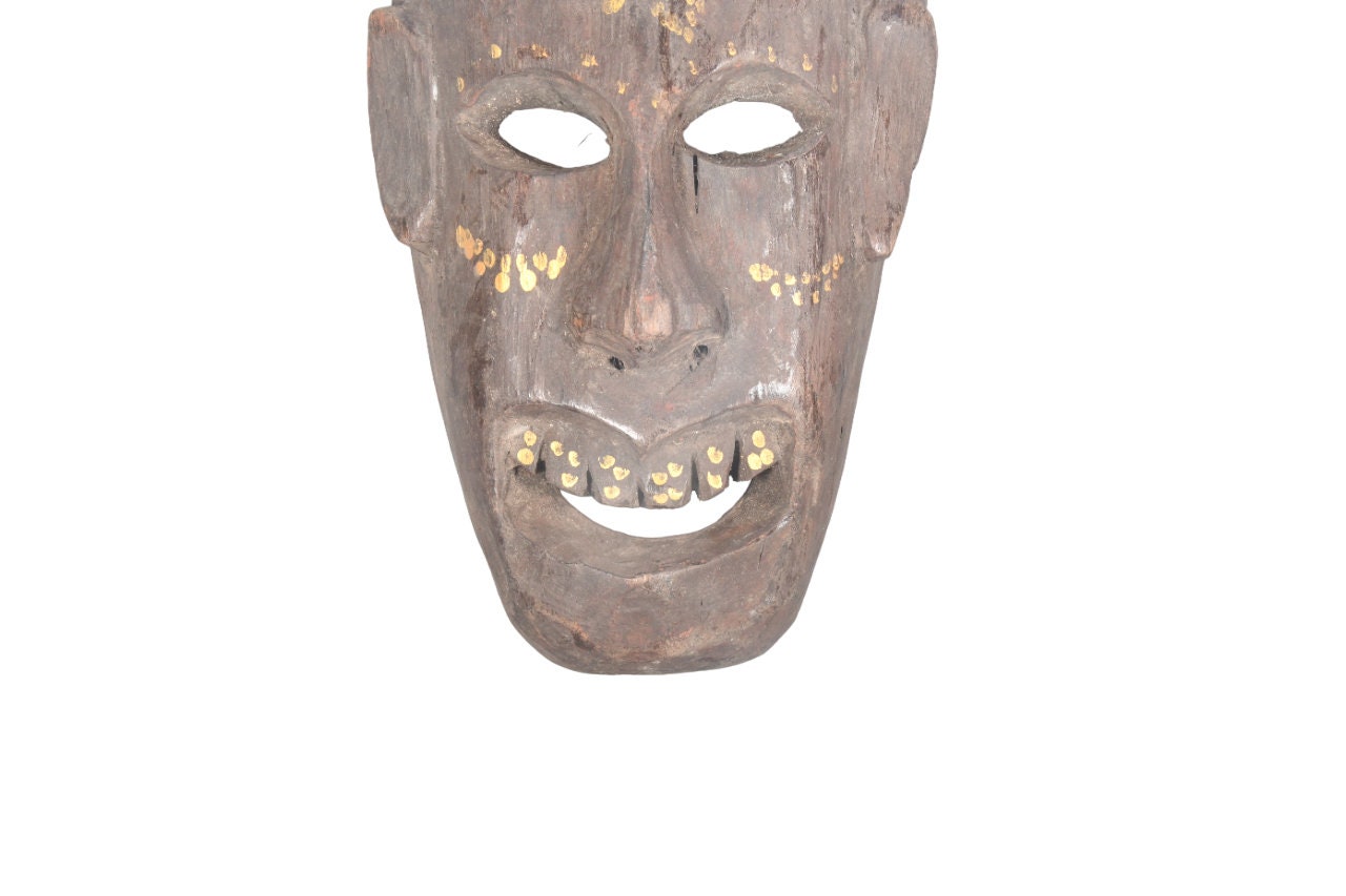 Vintage Laughing Skull Tharu Mask: Handmade Wood Tribal Wall Hanging
