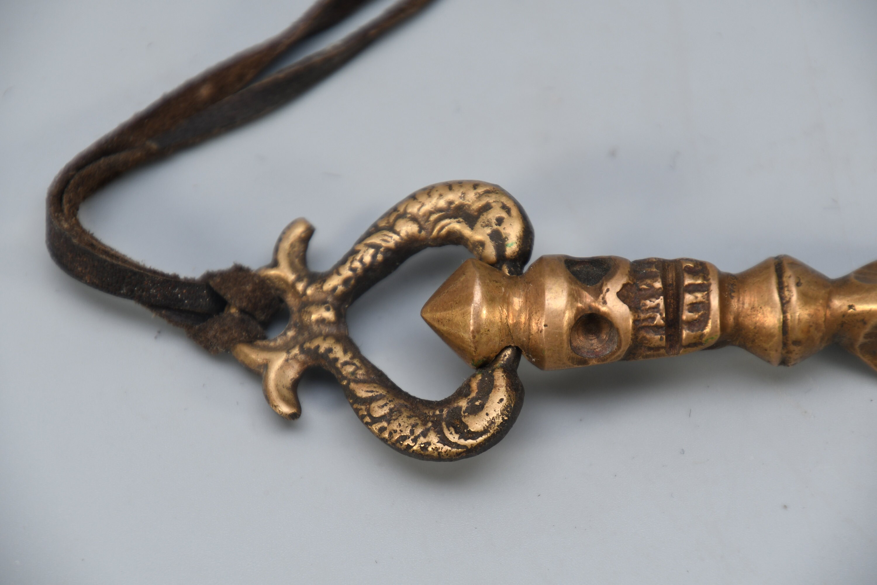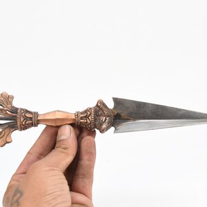 The three-sided style of the phurba comes from an ancient vedic tool. It has three segments on its blade, each representing the power of the phurba to transform negative energies. These energies are known as the 'three poisons,' and are attachment, ignorance, and aversion. The three sides of the phurba also represent the three spirit worlds, and the phurba itself represents the axis of the three spirit worlds. The handle of the phurba represents 'wisdom', while the blade represents 'method'.
